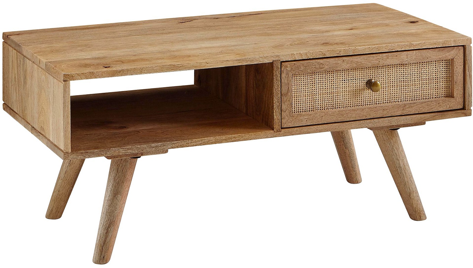 VIEL LIEBE ZUR NATUR ✔ Dieser massive Wohnzimmertisch überzeugt mit seinem besonderen Design und den praktischen Stauräumen. Für Stabilität sorgt das Gestell aus Massivholz. Besonderes Augenmerk liegt hier auf dem Schilfrohrgeflecht, das die Schubladenfront gekonnt in Szene setzt. Der Korpus aus rustikal wirkendem Mangoholz rundet das Design perfekt ab.