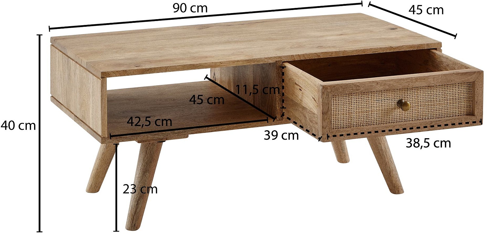 ABMESSUNGEN ✔ Breite: 90 cm // Höhe: 40 cm // Tiefe: 45 cm // Tischplattenstärke: 1,5 cm // Innenmaße der Schublade (BxHxT): 38,5 x 11,5 x 39 cm // Weitere Abmessungen finden Sie im Maßbild.