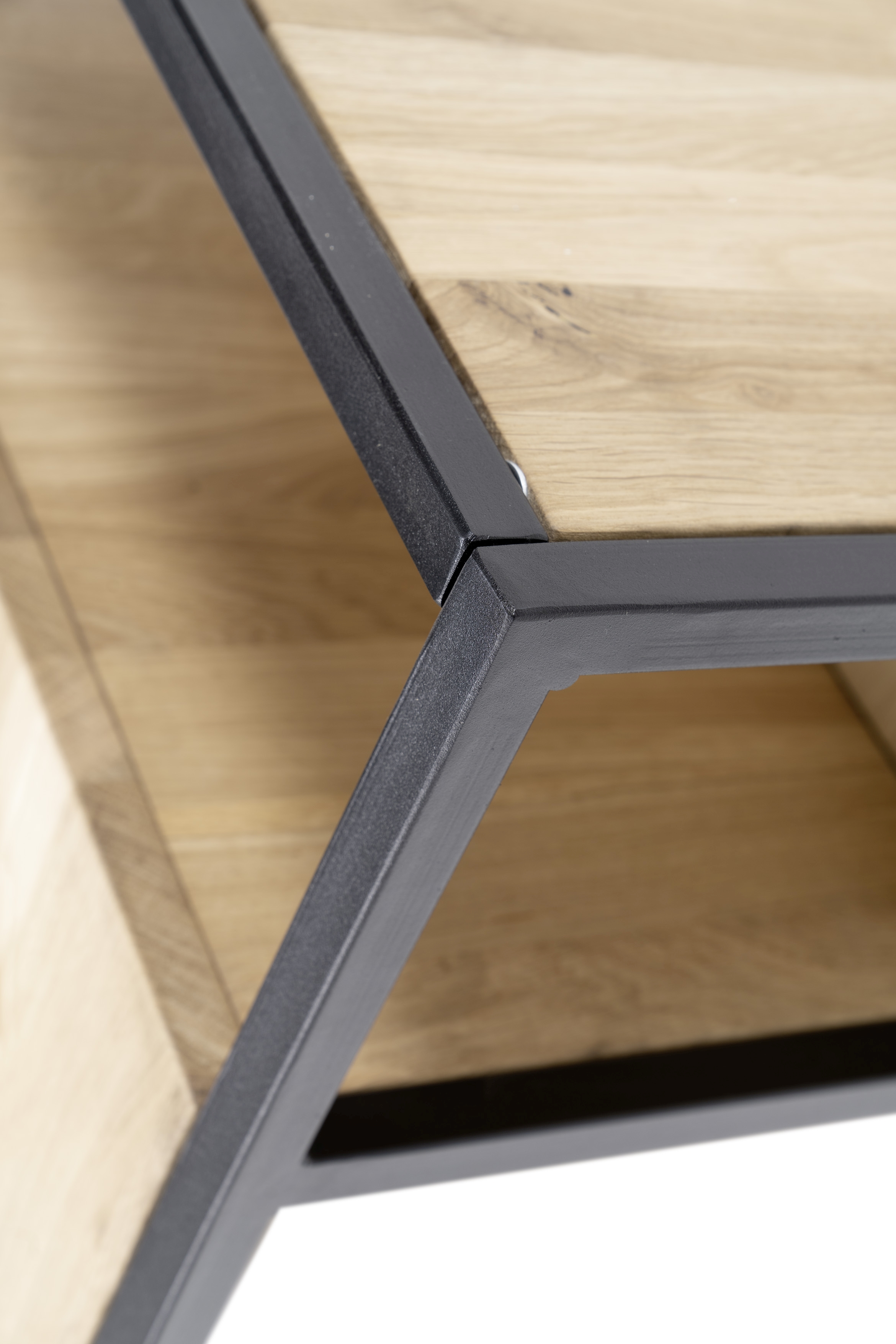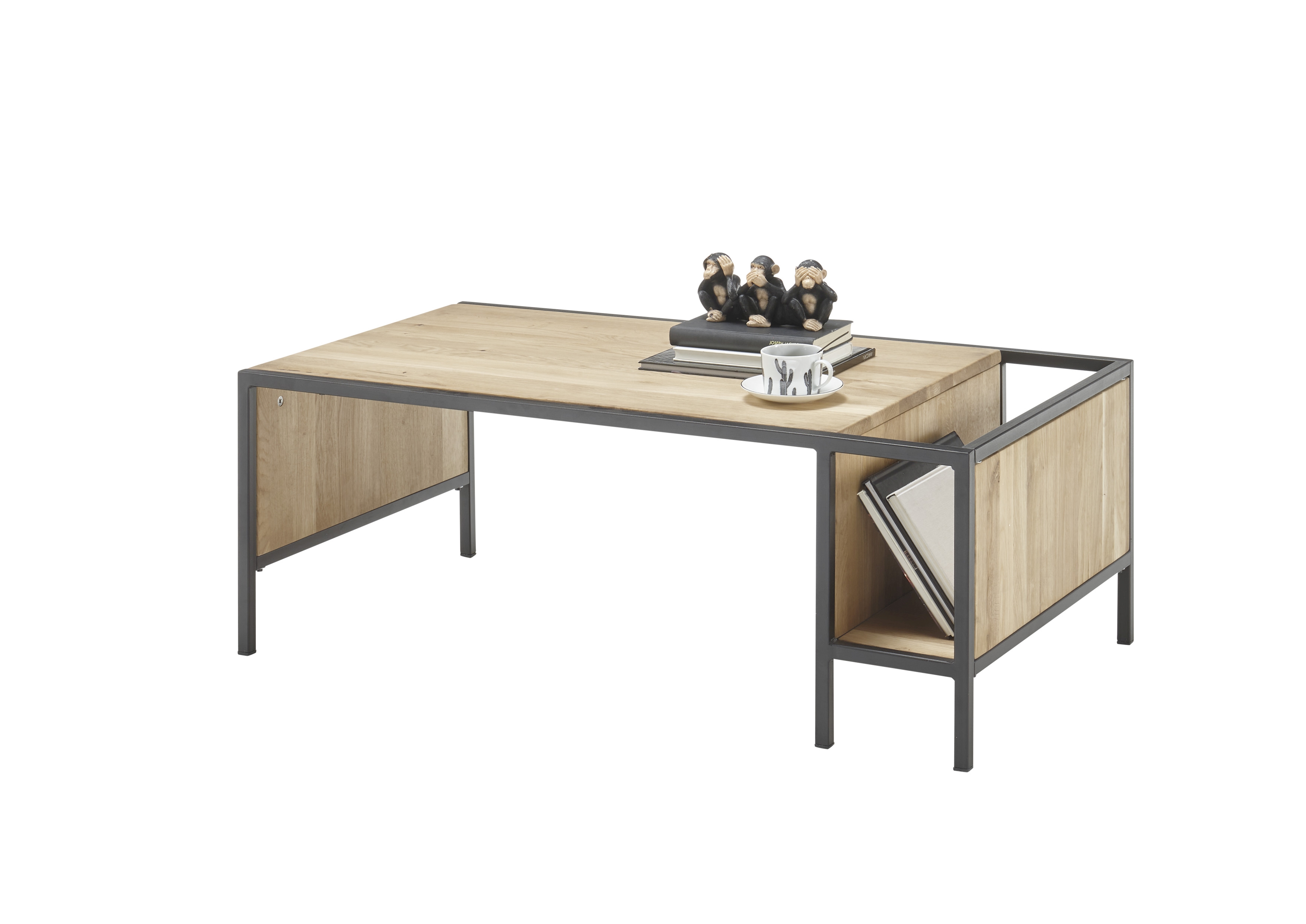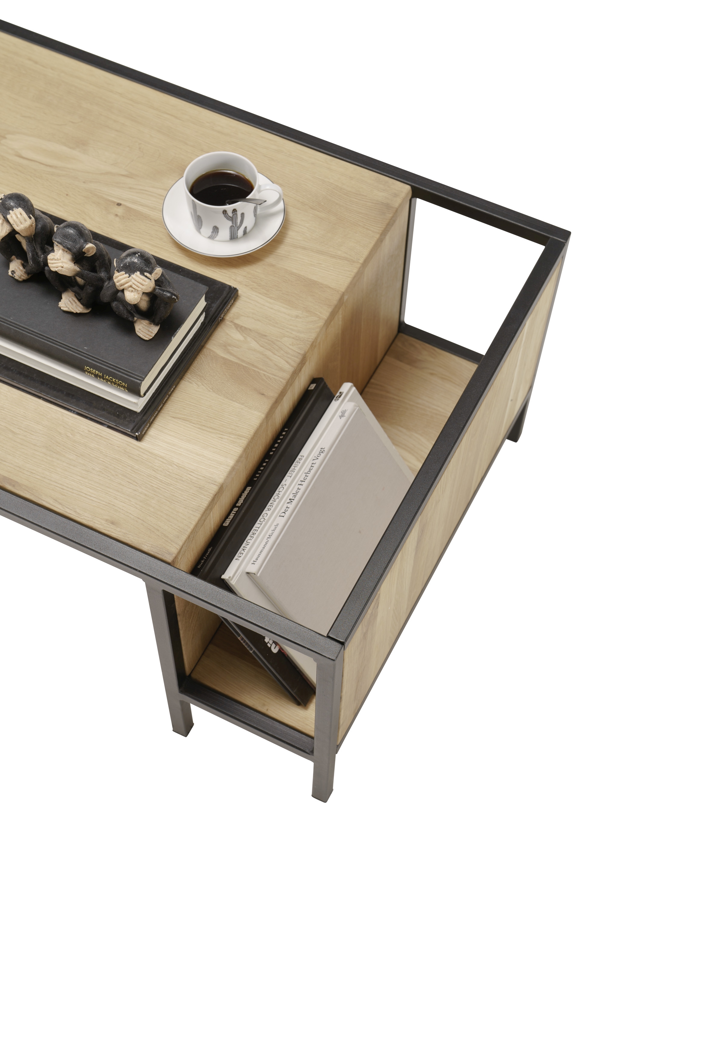 Tischplatte und seitliches Ablagefach: Eiche massiv (Serbien)