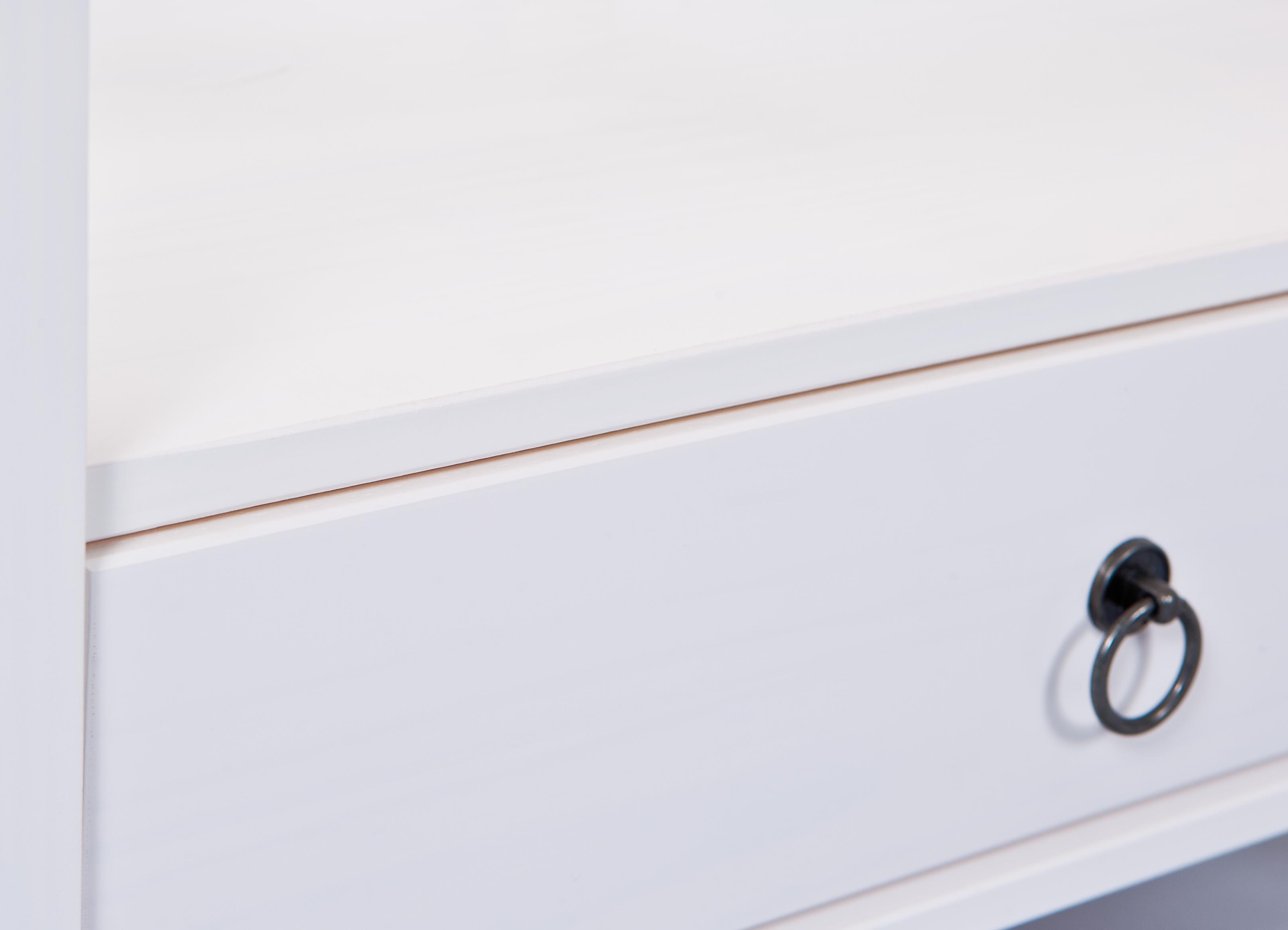 Die Schublade ist auf Metallschienen montiert, was für einen reibungslosen und komfortablen Gebrauch sorgt. Der Metallgriff stellt einen weiteren Qualitätsbeweis dar. Die verjüngten Füße verleihen dem Möbelstück seinen Charme und runden das elegante Design ab.
