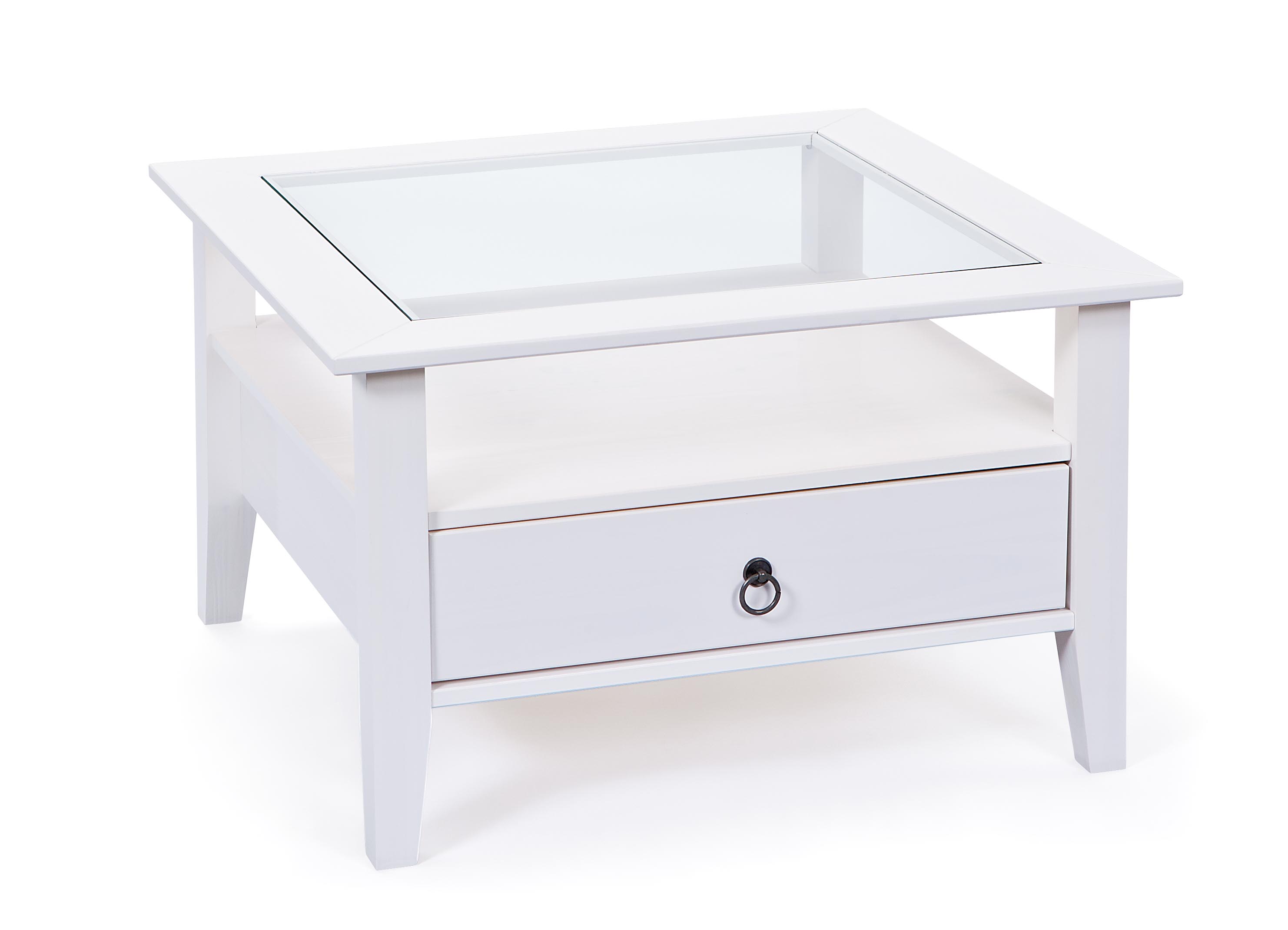 Kiefer-Massivholz (Brasilien), weiß lackiert mit eingelassener Tischplatte aus klarem Sicherheitsglas