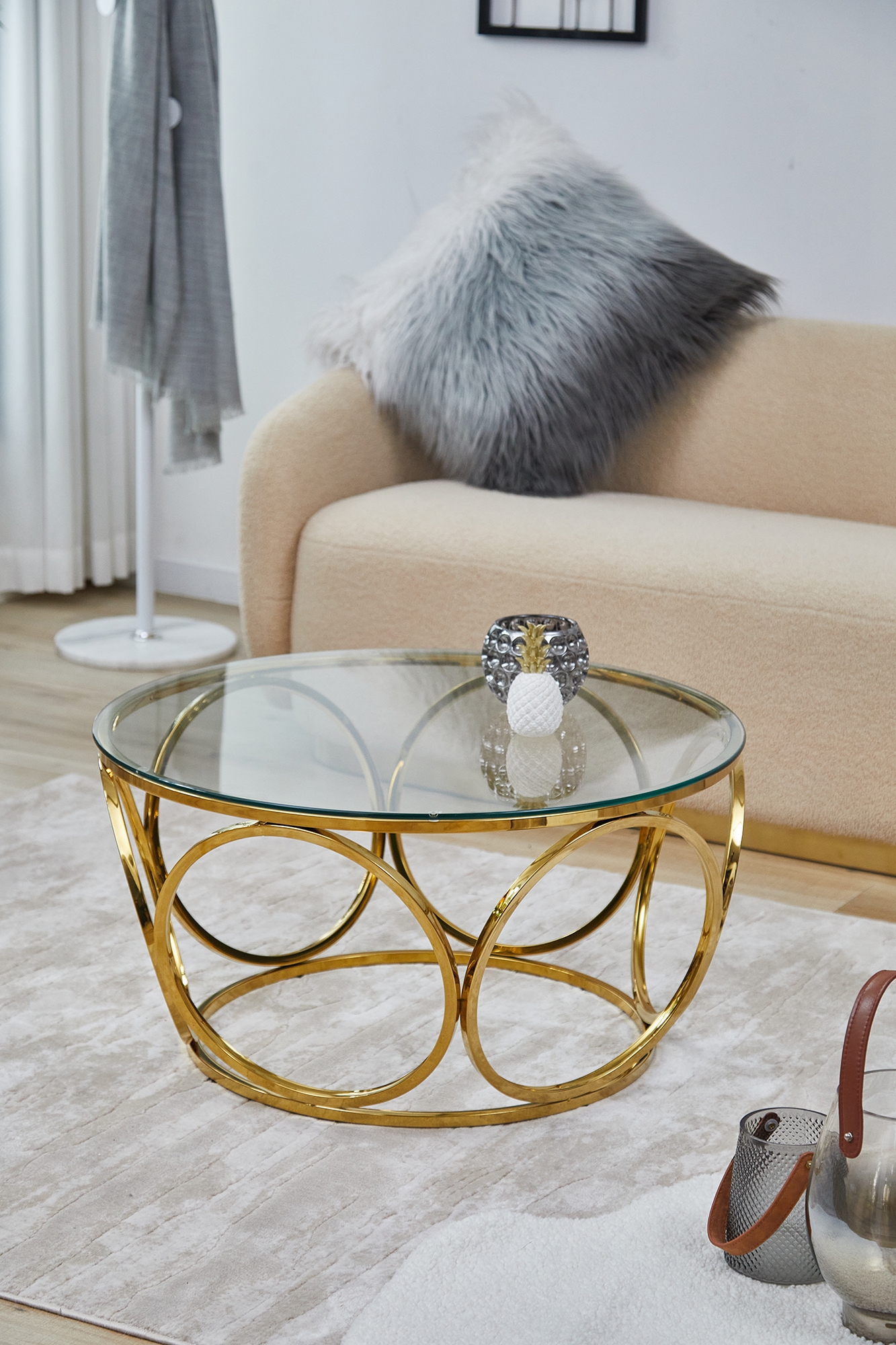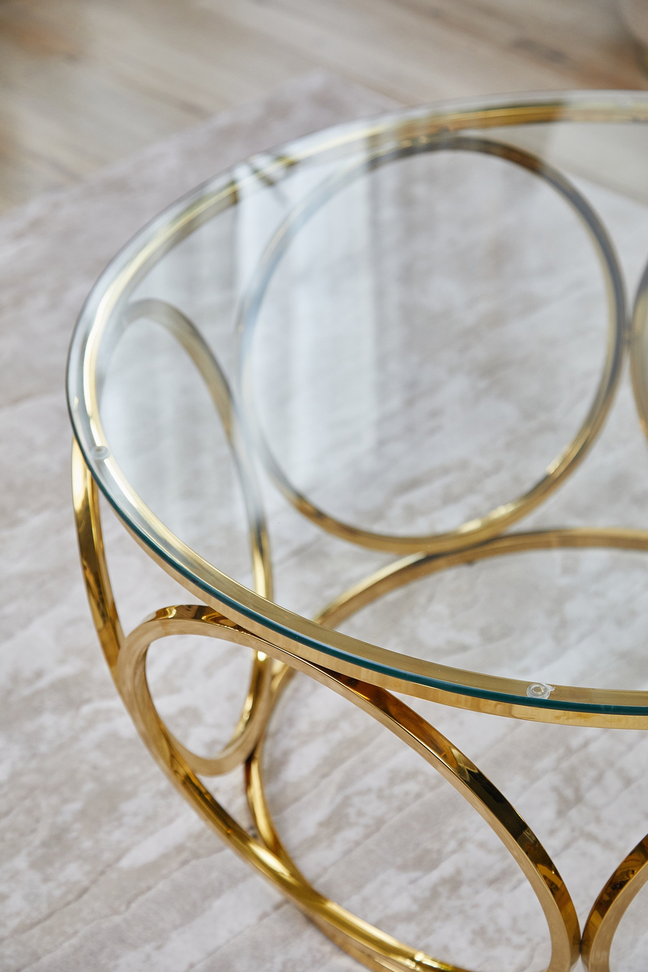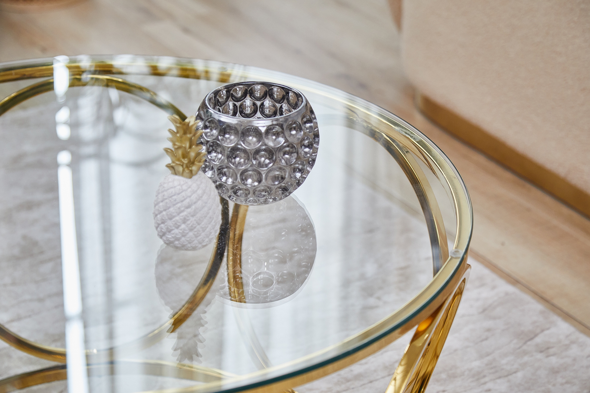 Dieser elegante Couchtisch versprüht Glamour pur im Wohnbereich. Der Hingucker des Tisches ist das extravagante Design-Gestell aus langlebigem Stainless Steel in goldfarbenem Finish. Das Gerüst aus runden Metallornamenten macht optisch richtig etwas her und wird zum edlen Mittelpunkt im Wohnzimmer. Passend zu allen Farben und Formen von Polstermöbeln, fügt sich der Couchtisch in Gold und klarem Glas harmonisch in viele Wohnstile ein. Dank der 8 mm Platte aus Sicherheitsglas hat der Tisch eine hohe Stoßfestigkeit und bietet Bruchsicherheit. Die Oberflächen von Glasplatte und Gestell sind zusätzlich besonders pflegeleicht und lassen sich einfach feucht abwischen. Mit diesem Couchtisch zieht ein Stück Extravaganz in Ihre vier Wände ein.