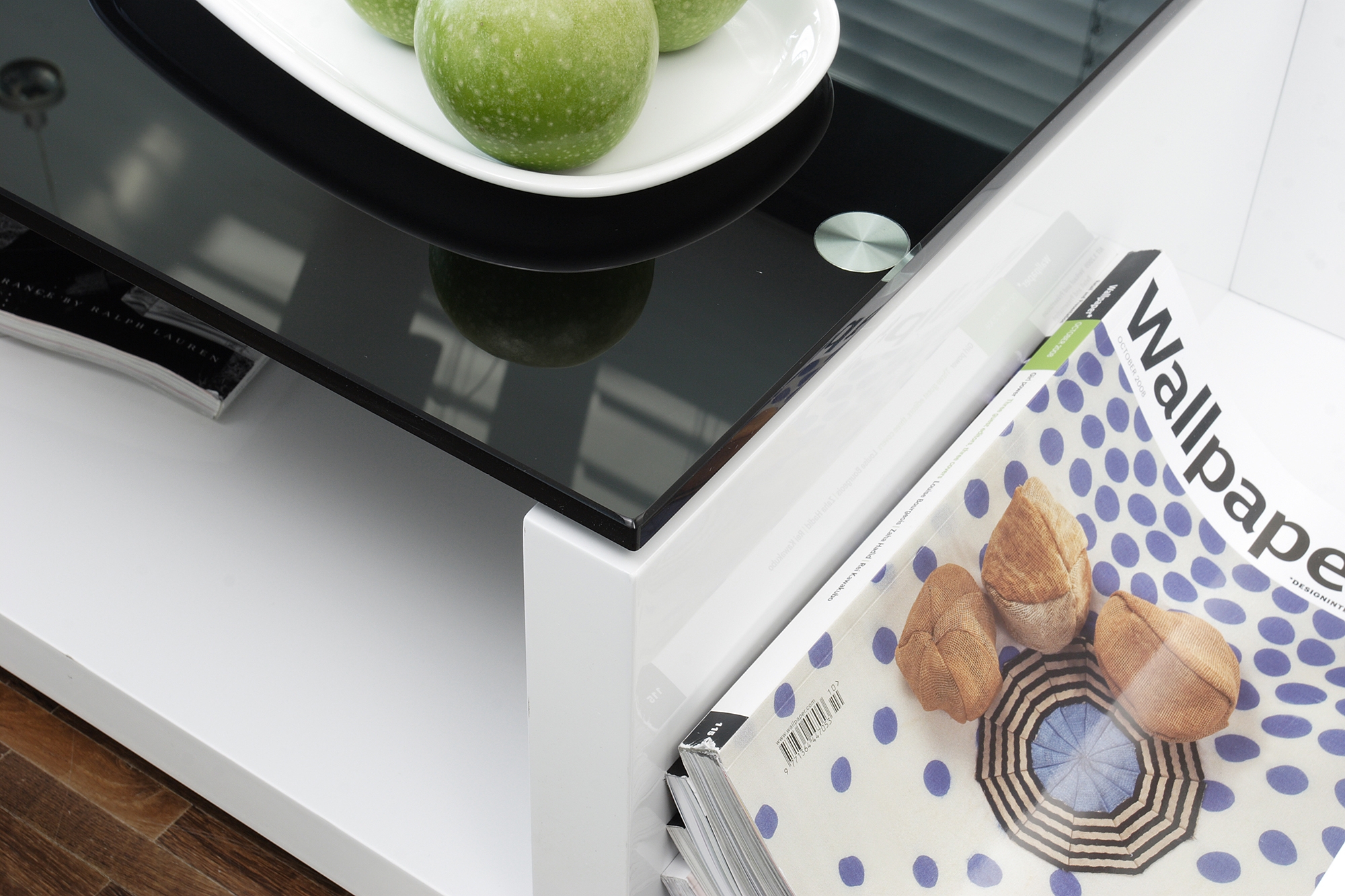 Dieser moderne Couchtisch fällt durch seine eleganten Akzente sofort ins Auge. Der komplette Sofatisch wurde aus pflegeleichtem MDF hergestellt und in Hochglanz weiß lackiert. Die Tischplatte aus schwarzem Sicherheitsglas ist 12 mm stark und rundet die moderne Optik ab. Für viel Stauraum sorgen das offene Ablagefach unter der Tischplatte, sowie die zwei seitlichen zusätzlichen Fächer. Hier sind genügend Stau- und Ablagemöglichkeiten für Getränke, Snacks, Zeitschriften oder ähnliches. Dieser Wohnzimmertisch passt sehr gut in bereits vorhandenes Interior. Besonders auffällige Kontraste können durch helle oder dunkle Möbelfarben geschaffen werden, wie z.B. den modischen schwarz-weiß Kontrasten.