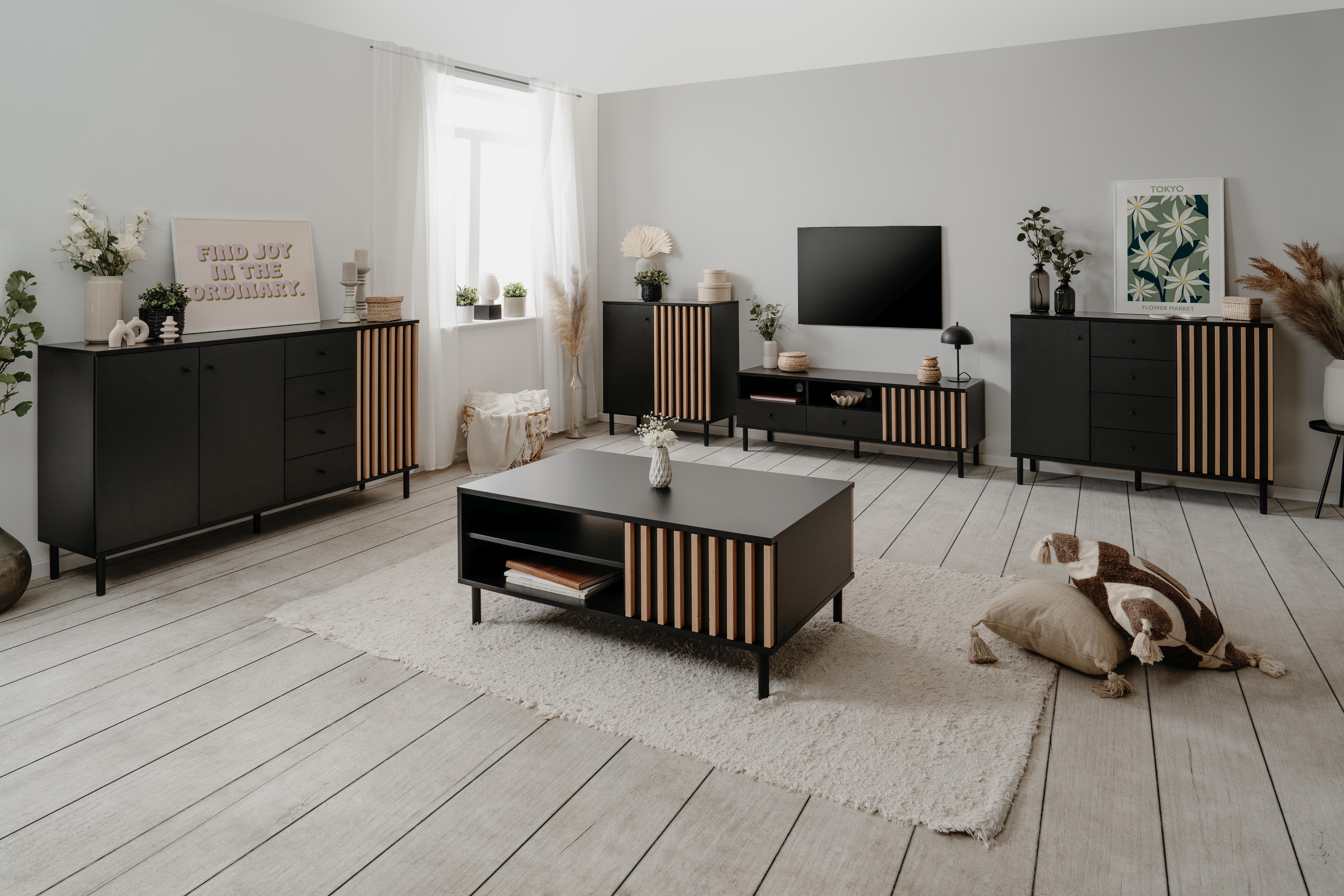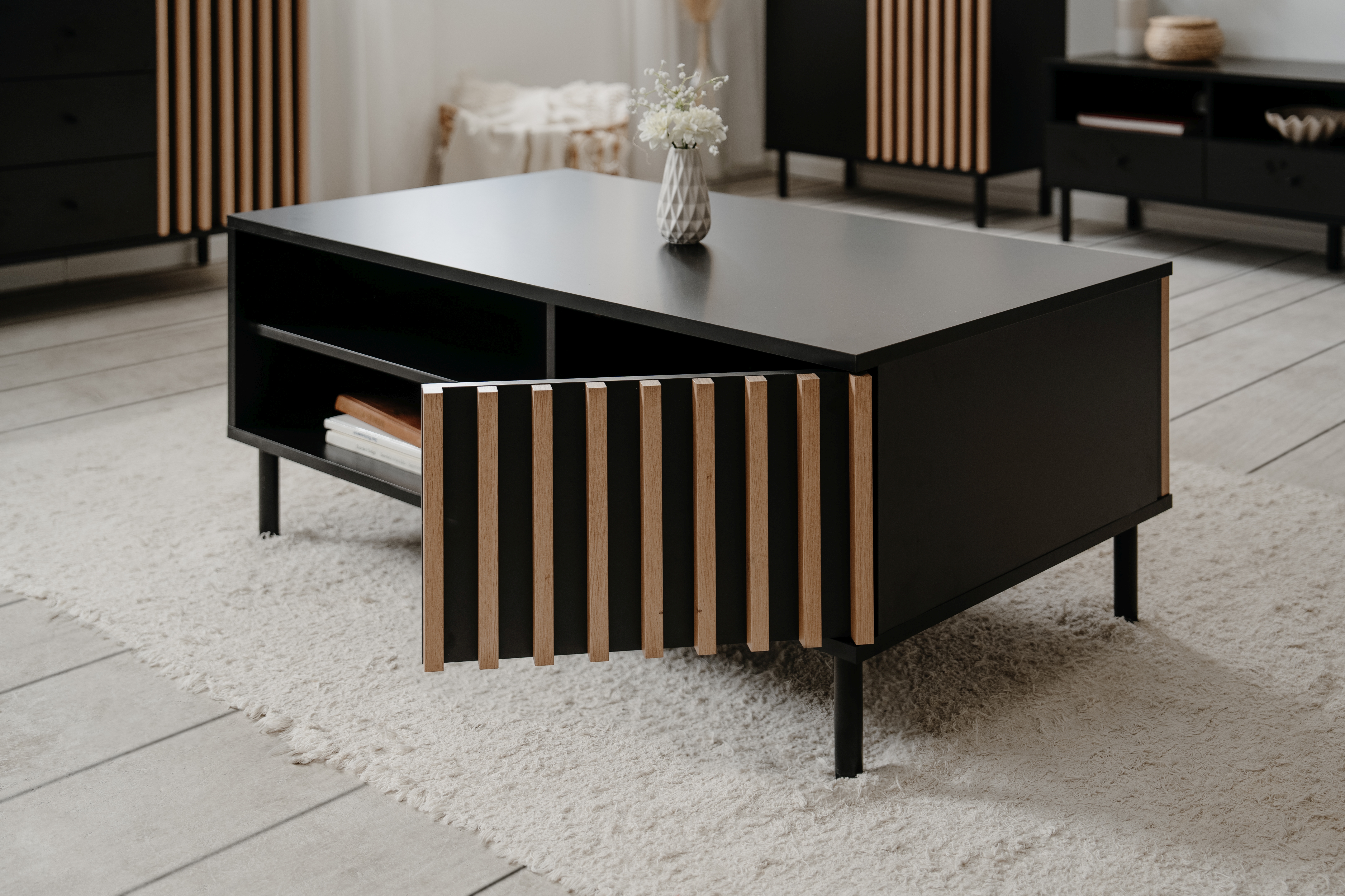 Schwarz (mit Anti-Fingerprint) kombiniert mit aufgesetzten Lamellen in Artisan Eiche Holznachbildung (3D-Optik)