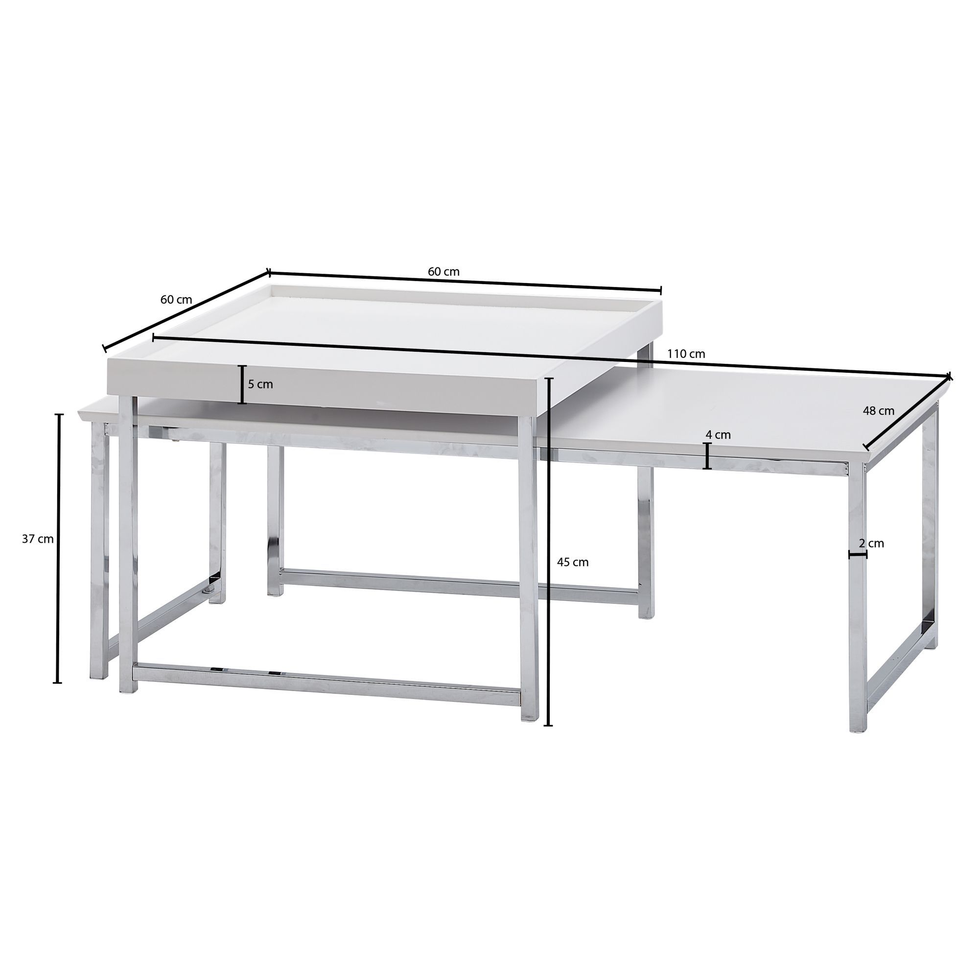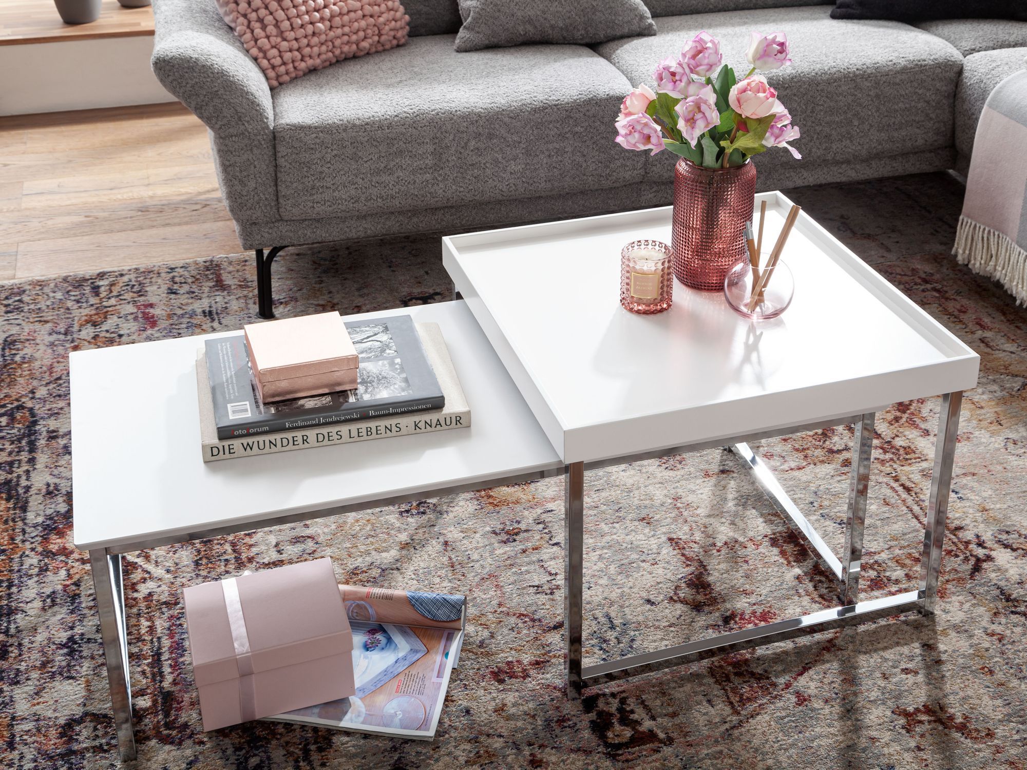 MATERIAL ✔ Tischplatten: weiß lackiertes MDF // Gestelle: verchromter Stahl.