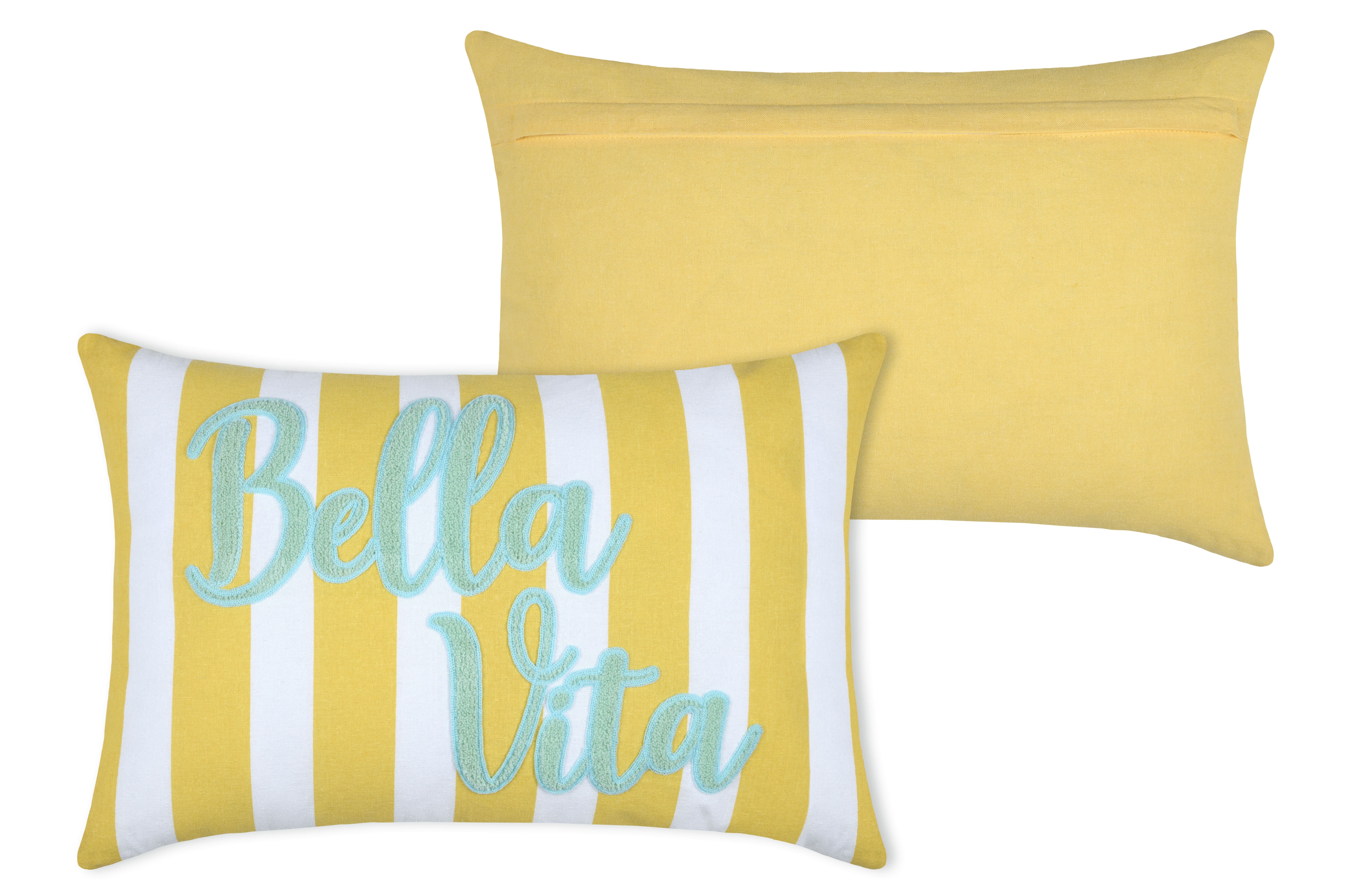 Farbe: gelb, weiß gestreift mit gesticktem Schriftzug Bella Vita in türkis, Rückseite uni gelb
