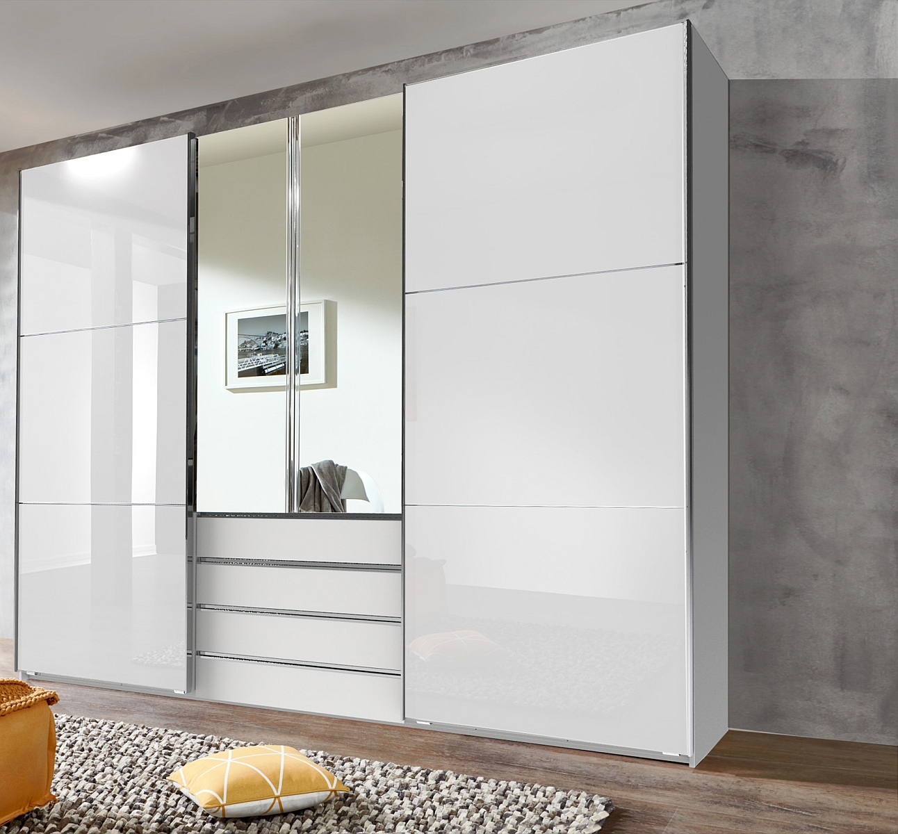 Front: Glas weiß kombiniert mit Spiegel-Drehtüren und Schubkästen in Weiß