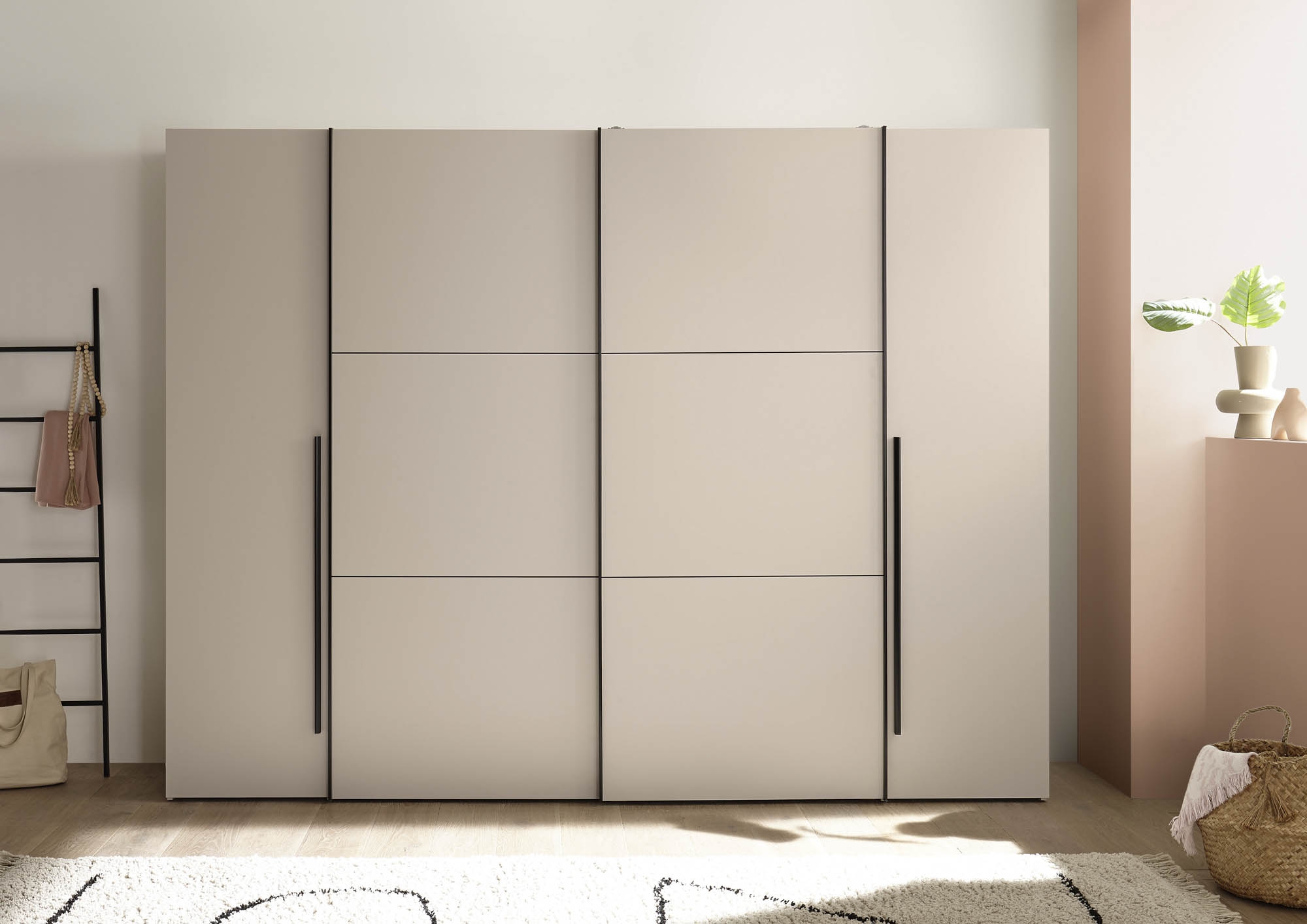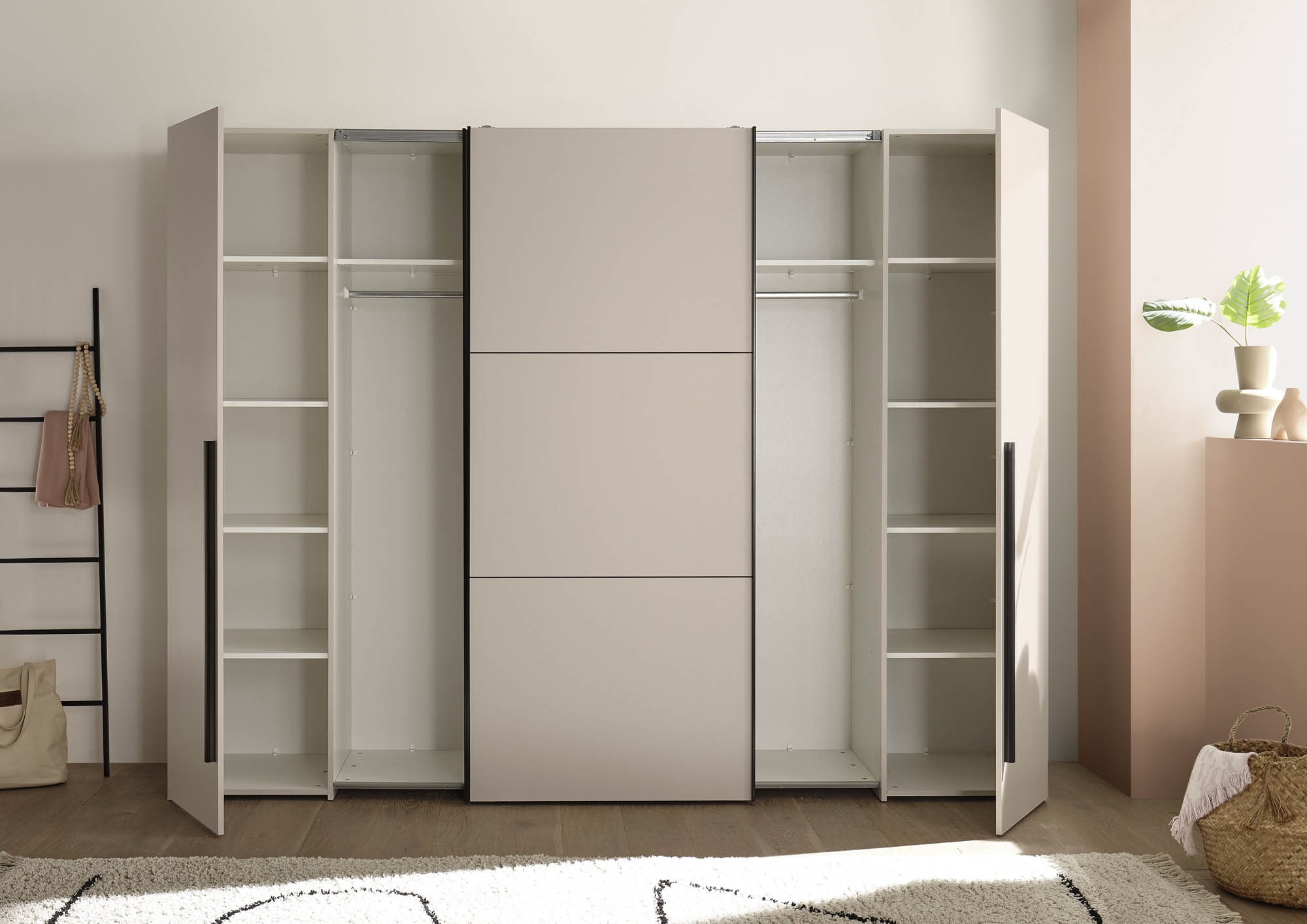 Dieser funktionale Schwebe-/Drehtürenschrank in Kaschmir bietet großzügigen Stauraum für Kleidung und Wäsche. Mit zwei äußeren Drehtüren und zwei mittigen Schwebetüren vereint er klassische und moderne Türsysteme in einem Möbelstück. Die durchdachte Inneneinteilung mit drei Mittelseiten, mehreren Böden und zwei Kleiderstangen ermöglicht eine strukturierte Aufbewahrung. Der einheitliche Farbton in Kaschmir sorgt für eine ruhige, dezente Optik und lässt sich vielseitig kombinieren. Ideal für preisbewusste Kunden, die auf Stauraum und Alltagstauglichkeit setzen. Die Lieferung erfolgt zur Selbstmontage – inklusive Anleitung und Montagematerial.