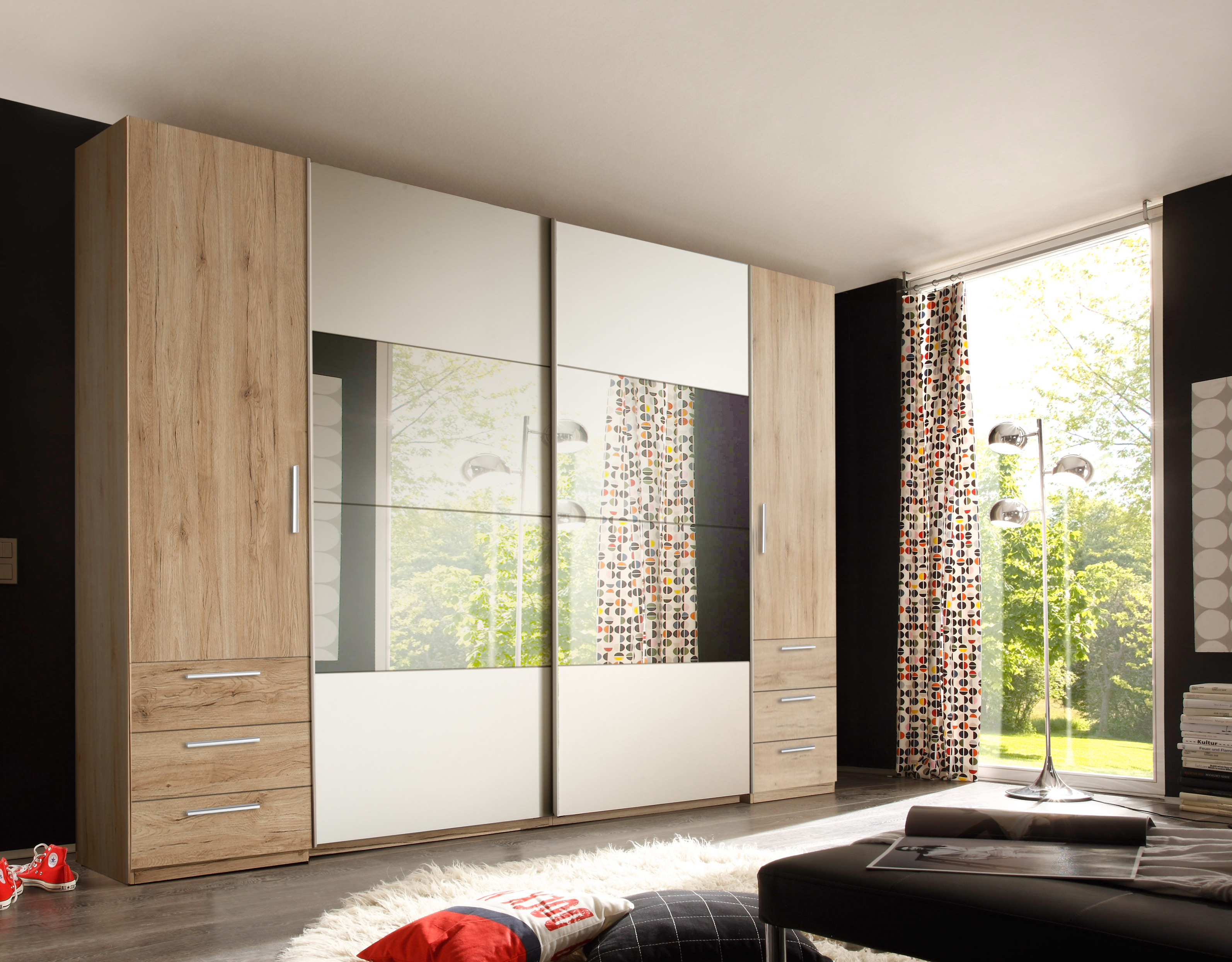 - Viel Stauraum mit übersichtlicher Aufteilung: zwei Schwebetüren, zwei Drehtüren und sechs Schubkästen, plus eine durchdachte Innenaufteilung, damit Kleidung, Accessoires und Kleinteile sortiert bleiben.
