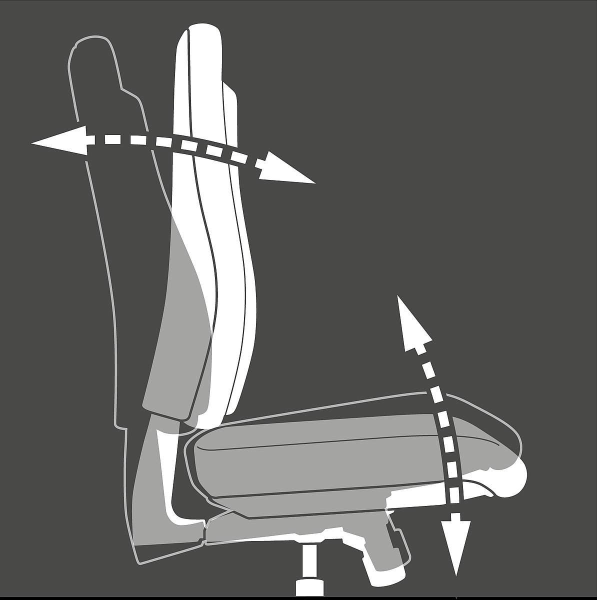 Punktsynchronmechanik, zur synchronen Verstellung der Sitz- und Rückenlehnenneigung, Federkraft individuell auf das Körpergewicht einstellbar, komfortabel über seitlich ausziehbaren Verstellhebel, mehrfach arretierbar