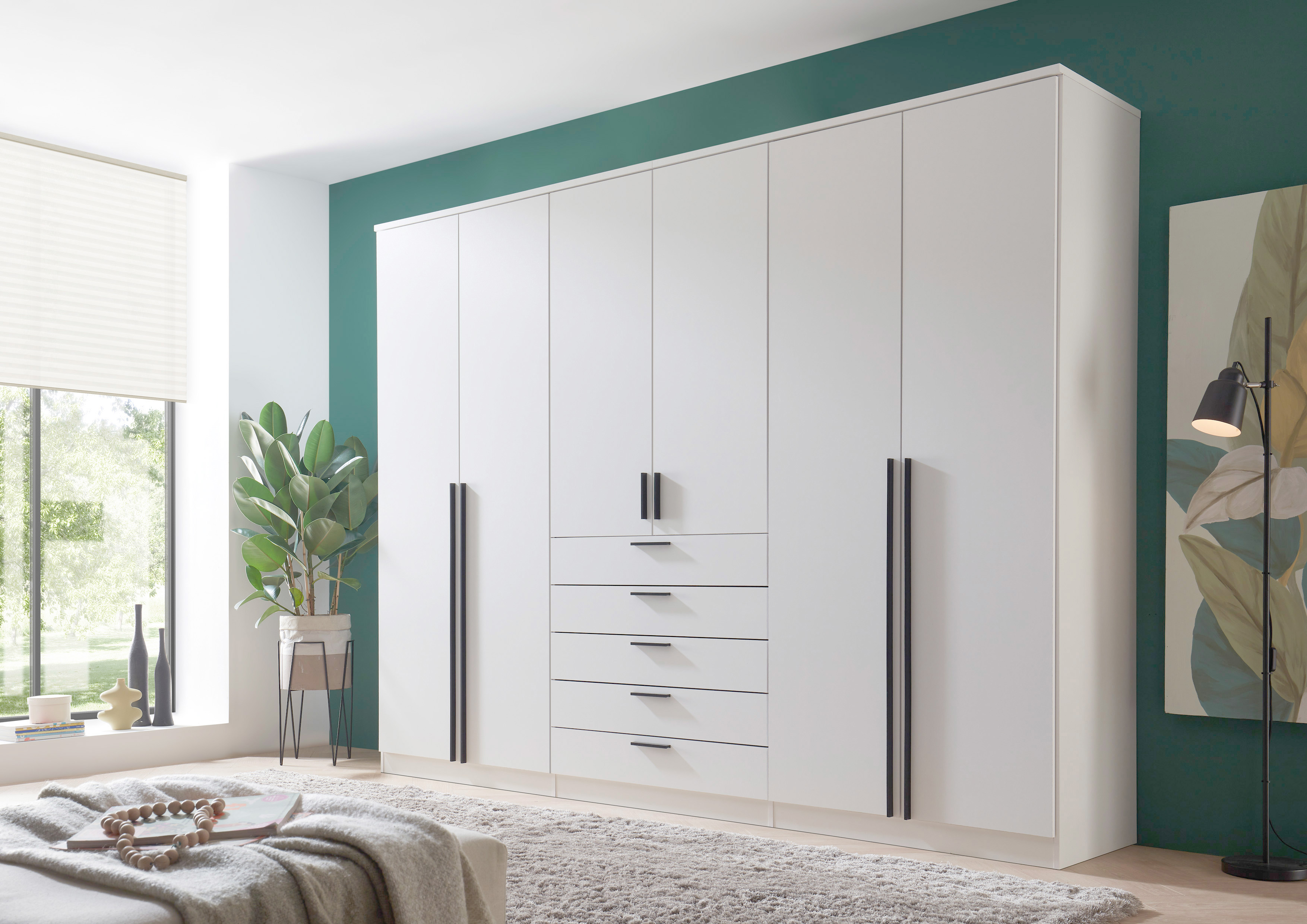Inneneinteilung: 2 Mittelseiten, rechts und links jeweils 1 Boden und 1 Kleiderstange, mittig 2 Böden