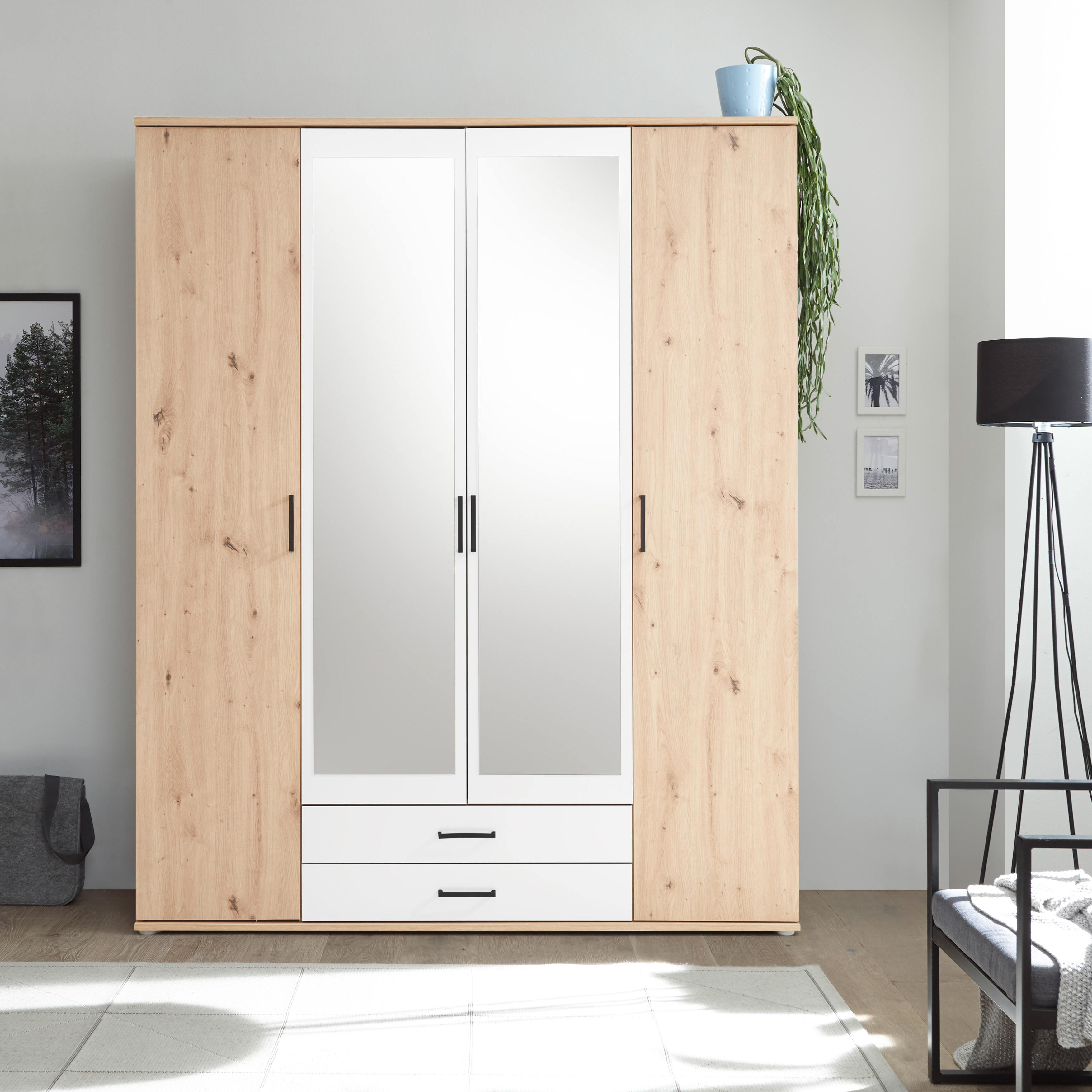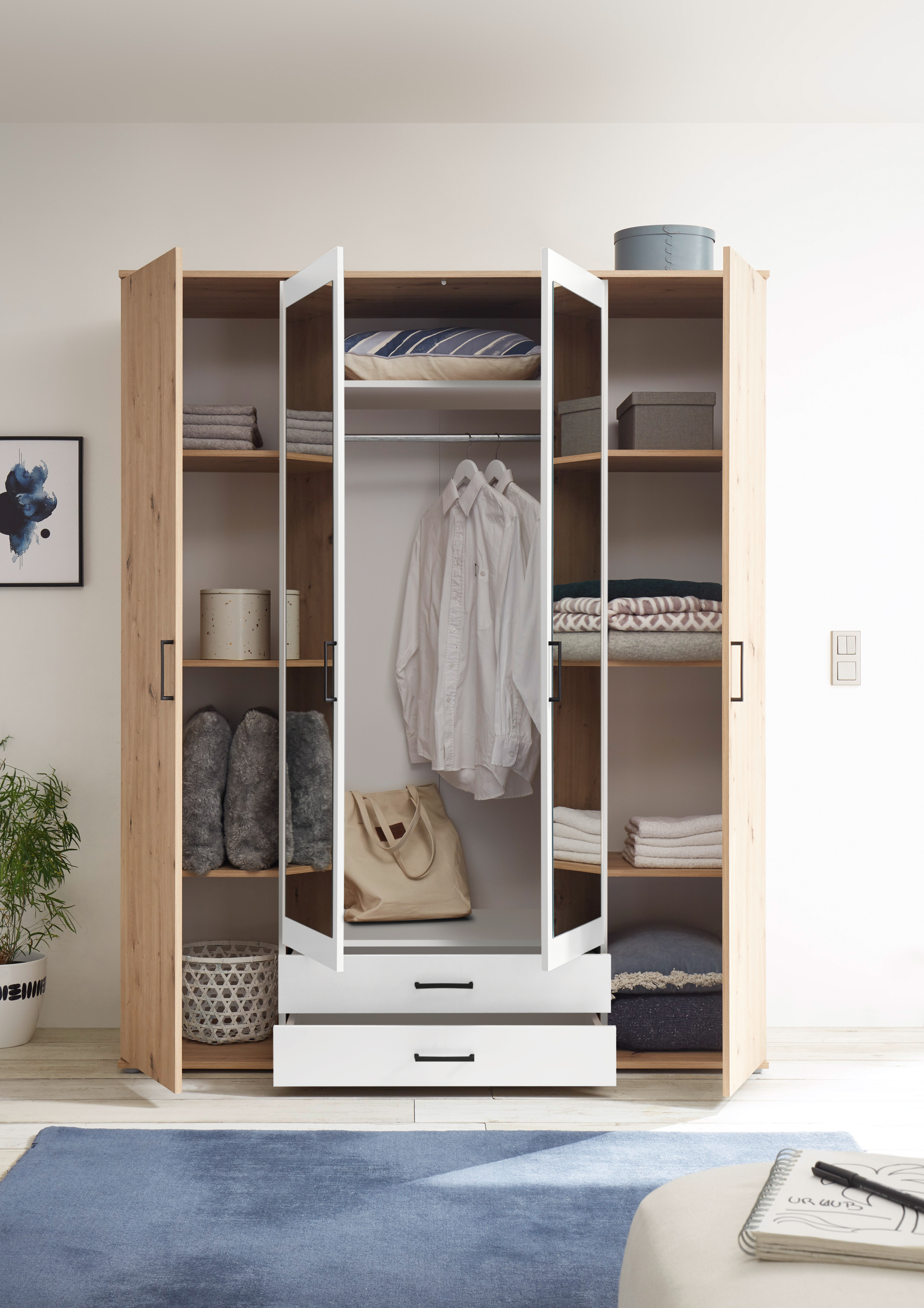 CHICAGO Eleganter Kleiderschrank mit viel Stauraum - Vielseitiger Drehtürenschrank in Artisan Eiche Optik und Absetzungen in Weiß - 159 x 197 x 54 cm (B/H/T)