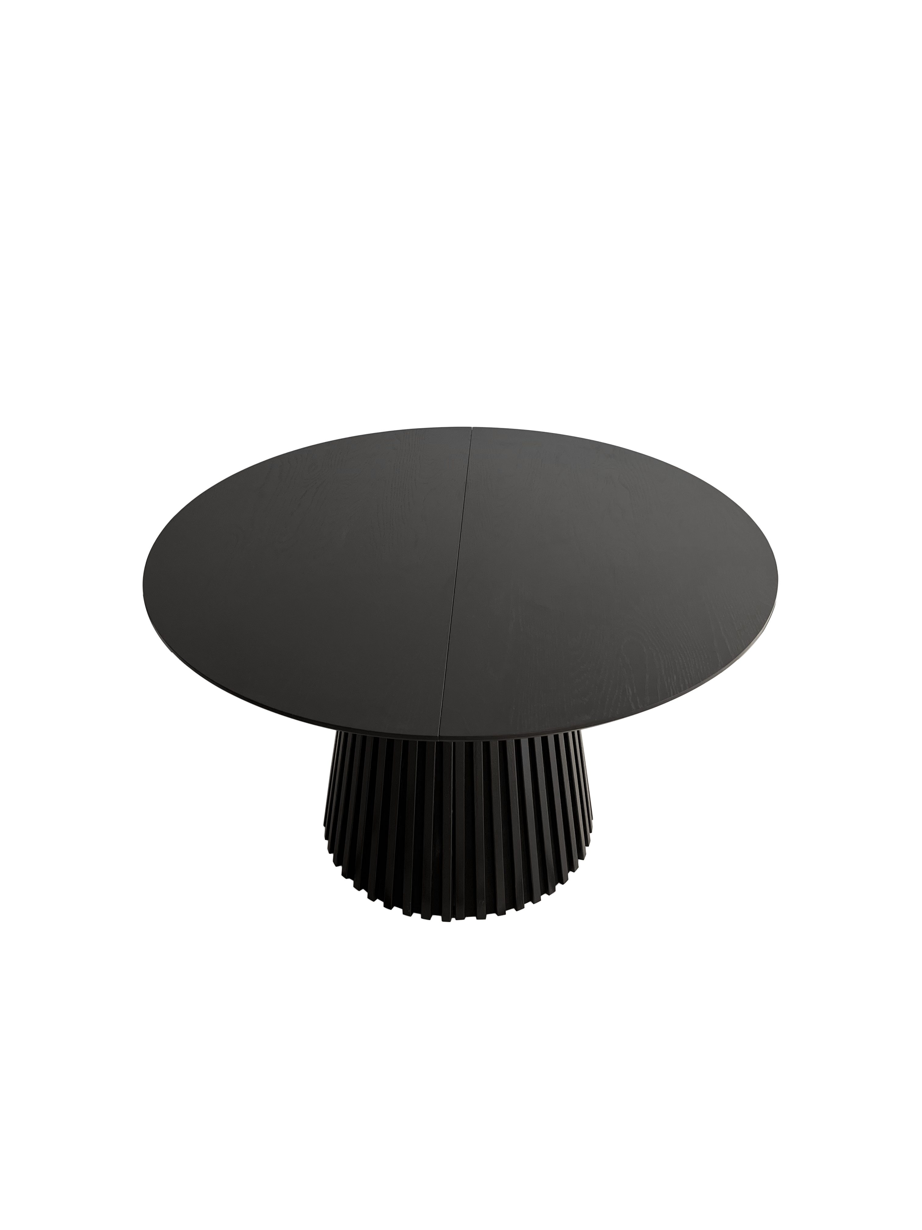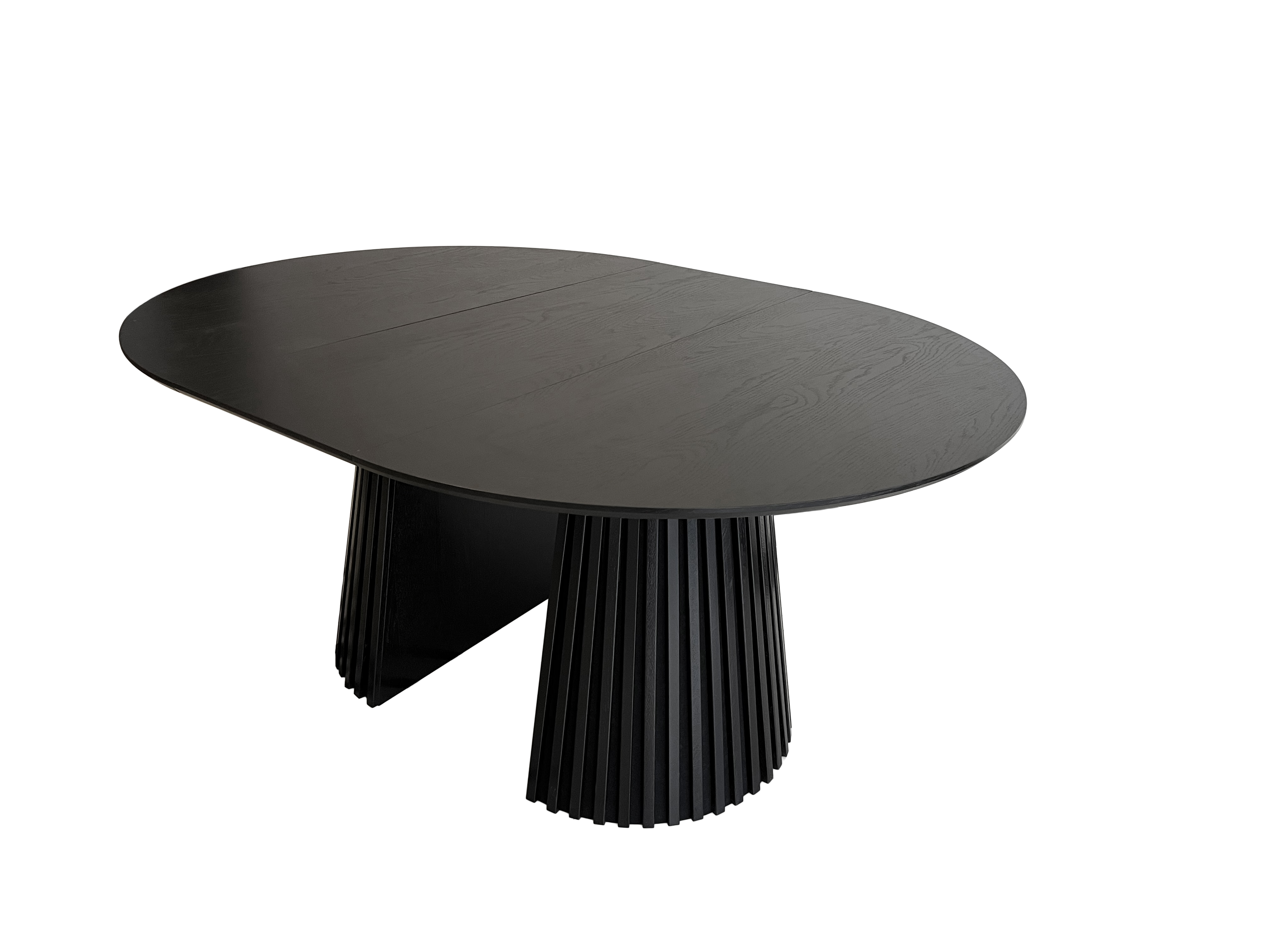 Der robuste Säulenfuß aus massiver Eiche in schwarz gefärbt setzt einen beeindruckenden Blickfang und sorgt gleichzeitig für ausgezeichnete Stabilität und Langlebigkeit. Massivholz steht für hochwertige Verarbeitung und zeitlose Eleganz, die im Wohn- oder Esszimmer zum Charakterstück wird.