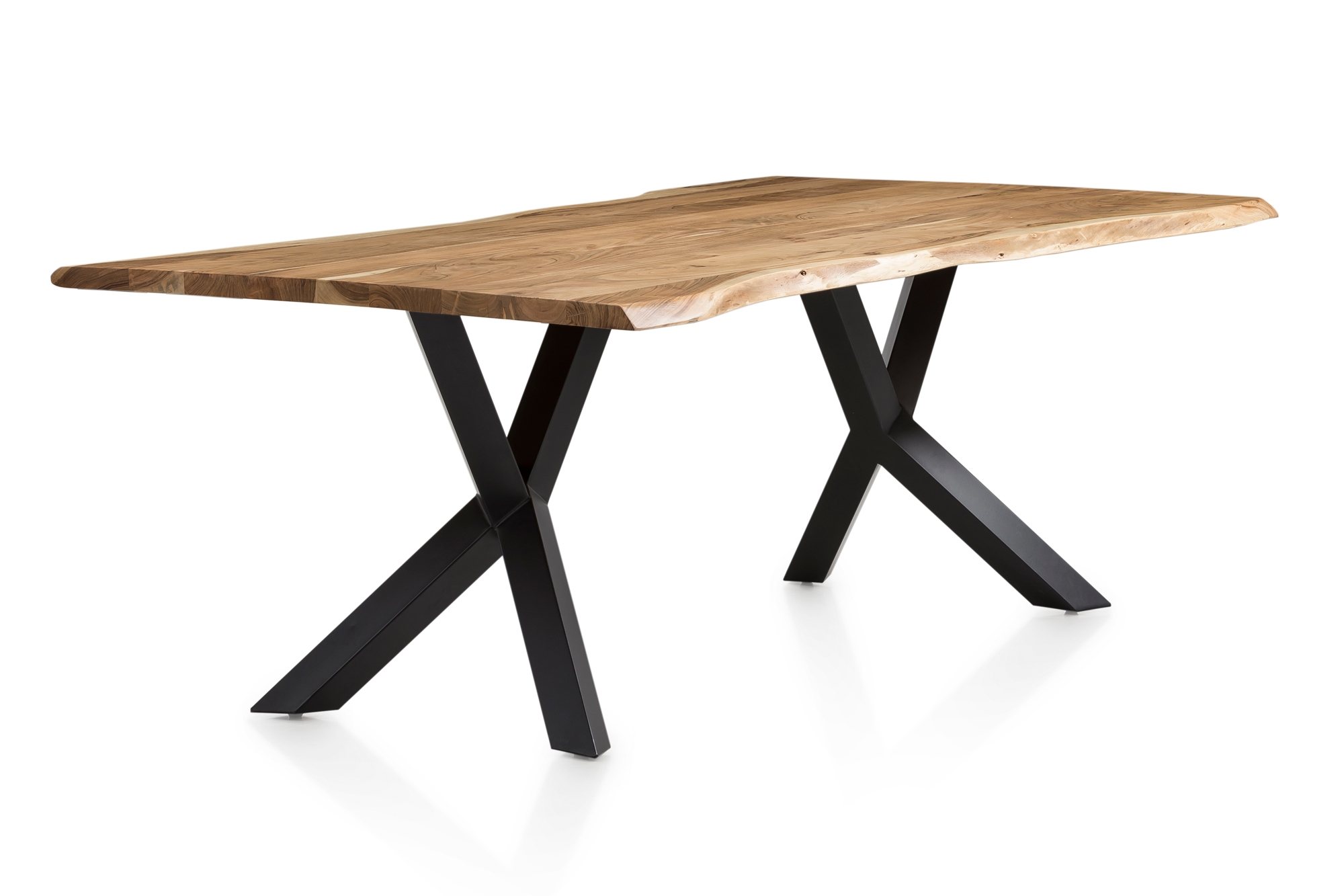 Massivholzmöbel aus Akazie gehören zu den zeitlos schönen Möbeln, die niemals aus der Mode kommen. Die 35 mm starke Tischplatte mit natürlicher Formgebung besteht aus Akazienholz. Dies wurde geölt und zweifach gewachst, somit ist die Oberfläche unempfindlich und feuchtigkeitsabweisend. Das Gestell in Y-Form aus schwarzem Metall verleiht dem Tisch eine sehr gute Stabilität und ist das passende Gegenstück zur schönen naturfarbenen Tischplatte. Dieser Esszimmertisch ist mehr als nur ein Sitzplatz zum Essen. Holen Sie sich ein Stück Natur in die eigenen vier Wände. Hinweis: Da es sich bei diesem Massivholztisch um ein Naturprodukt handelt, kann es zu Astlöchern oder unterschiedlichen Farbschmückungen kommen, welche jedoch keine Fehler darstellen, sondern den individuellen Charakter des Echtholzes unterstreichen.Auch die Tiefe kann aufgrund der natürlichen Formgebung variieren. Alle diese Unterschiede machen diesen Esszimmertisch zu einem echten Unikat.