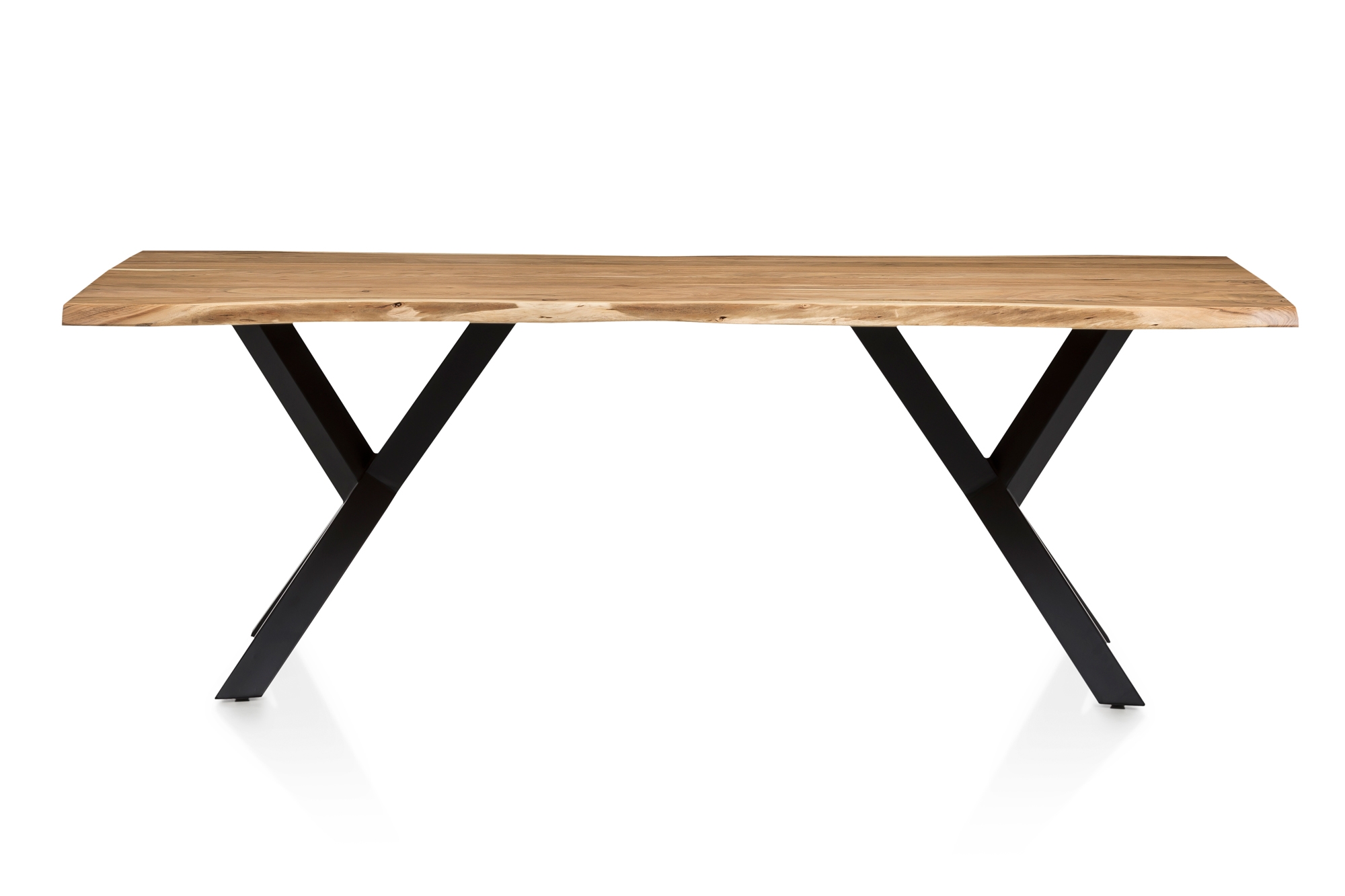 Massivholzmöbel aus Akazie gehören zu den zeitlos schönen Möbeln, die niemals aus der Mode kommen. Die 35 mm starke Tischplatte mit natürlicher Formgebung besteht aus Akazienholz. Dies wurde geölt und zweifach gewachst, somit ist die Oberfläche unempfindlich und feuchtigkeitsabweisend. Das Gestell in Y-Form aus schwarzem Metall verleiht dem Tisch eine sehr gute Stabilität und ist das passende Gegenstück zur schönen naturfarbenen Tischplatte. Dieser Esszimmertisch ist mehr als nur ein Sitzplatz zum Essen. Holen Sie sich ein Stück Natur in die eigenen vier Wände. Hinweis: Da es sich bei diesem Massivholztisch um ein Naturprodukt handelt, kann es zu Astlöchern oder unterschiedlichen Farbschmückungen kommen, welche jedoch keine Fehler darstellen, sondern den individuellen Charakter des Echtholzes unterstreichen.Auch die Tiefe kann aufgrund der natürlichen Formgebung variieren. Alle diese Unterschiede machen diesen Esszimmertisch zu einem echten Unikat.