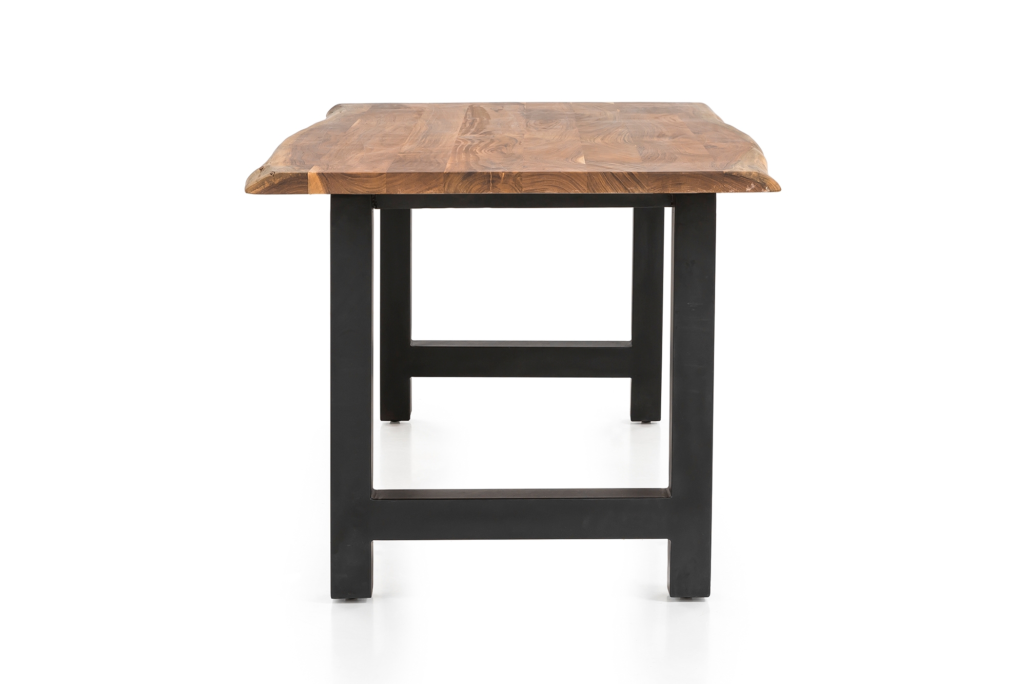 Massivholzmöbel aus Akazie gehören zu den zeitlos schönen Möbeln, die niemals aus der Mode kommen. Die 35 mm starke Tischplatte mit natürlicher Formgebung besteht aus Akazienholz. Dies wurde geölt und zweifach gewachst, somit ist die Oberfläche unempfindlich und feuchtigkeitsabweisend. Das Gestell in H-Form aus schwarzem Metall verleiht dem Tisch eine sehr gute Stabilität und ist das passende Gegenstück zur schönen naturfarbenen Tischplatte. Dieser Esszimmertisch ist mehr als nur ein Sitzplatz zum Essen. Holen Sie sich ein Stück Natur in die eigenen vier Wände. Hinweis:Da es sich bei diesem Massivholztisch um ein Naturprodukt handelt, kann es zu Astlöchern oder unterschiedlichen Farbschmückungen kommen, welche jedoch keine Fehler darstellen, sondern den individuellen Charakter des Echtholzes unterstreichen.Auch die Tiefe kann aufgrund der natürlichen Formgebung variieren. Alle diese Unterschiede machen diesen Esszimmertisch zu einem echten Unikat.