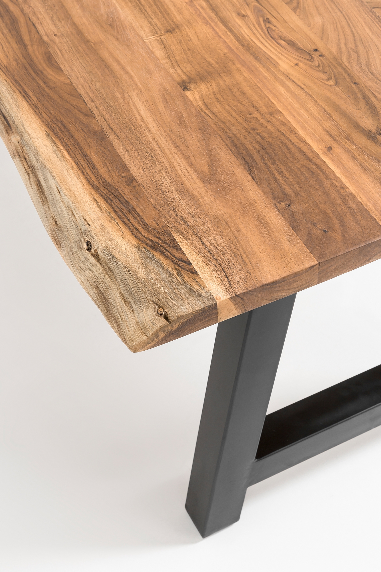 Massivholzmöbel aus Akazie gehören zu den zeitlos schönen Möbeln, die niemals aus der Mode kommen. Die 35 mm starke Tischplatte mit natürlicher Formgebung besteht aus Akazienholz. Dies wurde geölt und zweifach gewachst, somit ist die Oberfläche unempfindlich und feuchtigkeitsabweisend. Das Gestell in A-Form aus schwarzem Metall verleiht dem Tisch eine sehr gute Stabilität und ist das passende Gegenstück zur schönen naturfarbenen Tischplatte. Dieser Esszimmertisch ist mehr als nur ein Sitzplatz zum Essen. Holen Sie sich ein Stück Natur in die eigenen vier Wände. Hinweis:Da es sich bei diesem Massivholztisch um ein Naturprodukt handelt, kann es zu Astlöchern oder unterschiedlichen Farbschmückungen kommen, welche jedoch keine Fehler darstellen, sondern den individuellen Charakter des Echtholzes unterstreichen.Auch die Tiefe kann aufgrund der natürlichen Formgebung variieren. Alle diese Unterschiede machen diesen Esszimmertisch zu einem echten Unikat.