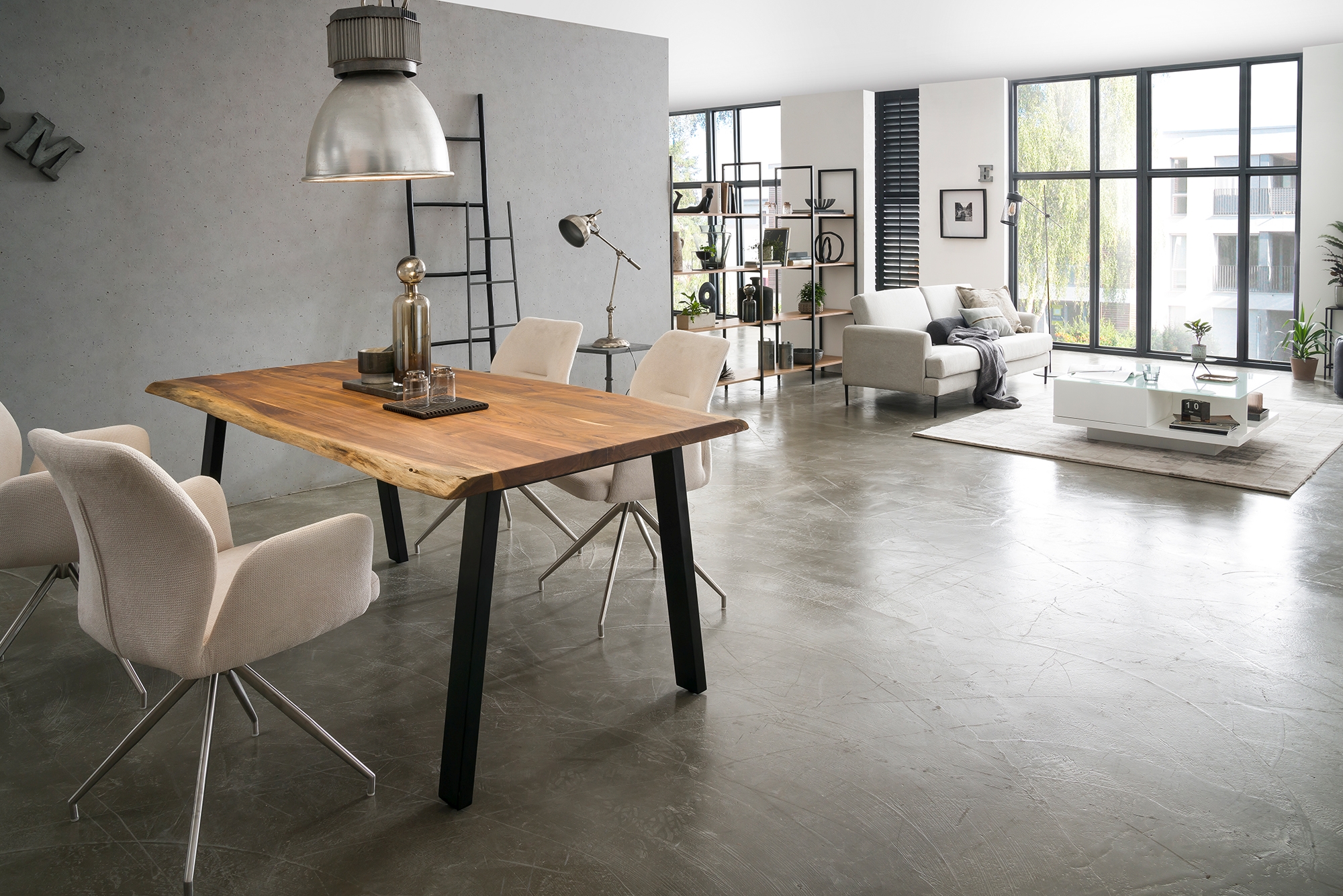 Massivholzmöbel aus Akazie gehören zu den zeitlos schönen Möbeln, die niemals aus der Mode kommen. Die 35 mm starke Tischplatte mit natürlicher Formgebung besteht aus Akazienholz. Dies wurde geölt und zweifach gewachst, somit ist die Oberfläche unempfindlich und feuchtigkeitsabweisend. Das stabile Gestell aus pulverbeschichtetem Metall in Mattschwarz verleiht dem Tisch eine sehr gute Stabilität und ist das passende Gegenstück zur schönen naturfarbenen Tischplatte. Dieser Esszimmertisch ist mehr als nur ein Sitzplatz zum Essen. Holen Sie sich ein Stück Natur in die eigenen vier Wände. Hinweis:Da es sich bei diesem Massivholztisch um ein Naturprodukt handelt, kann es zu Astlöchern oder unterschiedlichen Farbschmückungen kommen, welche jedoch keine Fehler darstellen, sondern den individuellen Charakter des Echtholzes unterstreichen. Auch die Tiefe kann aufgrund der natürlichen Formgebung variieren. Alle diese Unterschiede machen diesen Esszimmertisch zu einem echten Unikat.