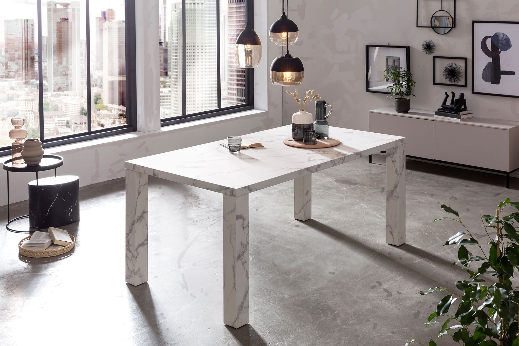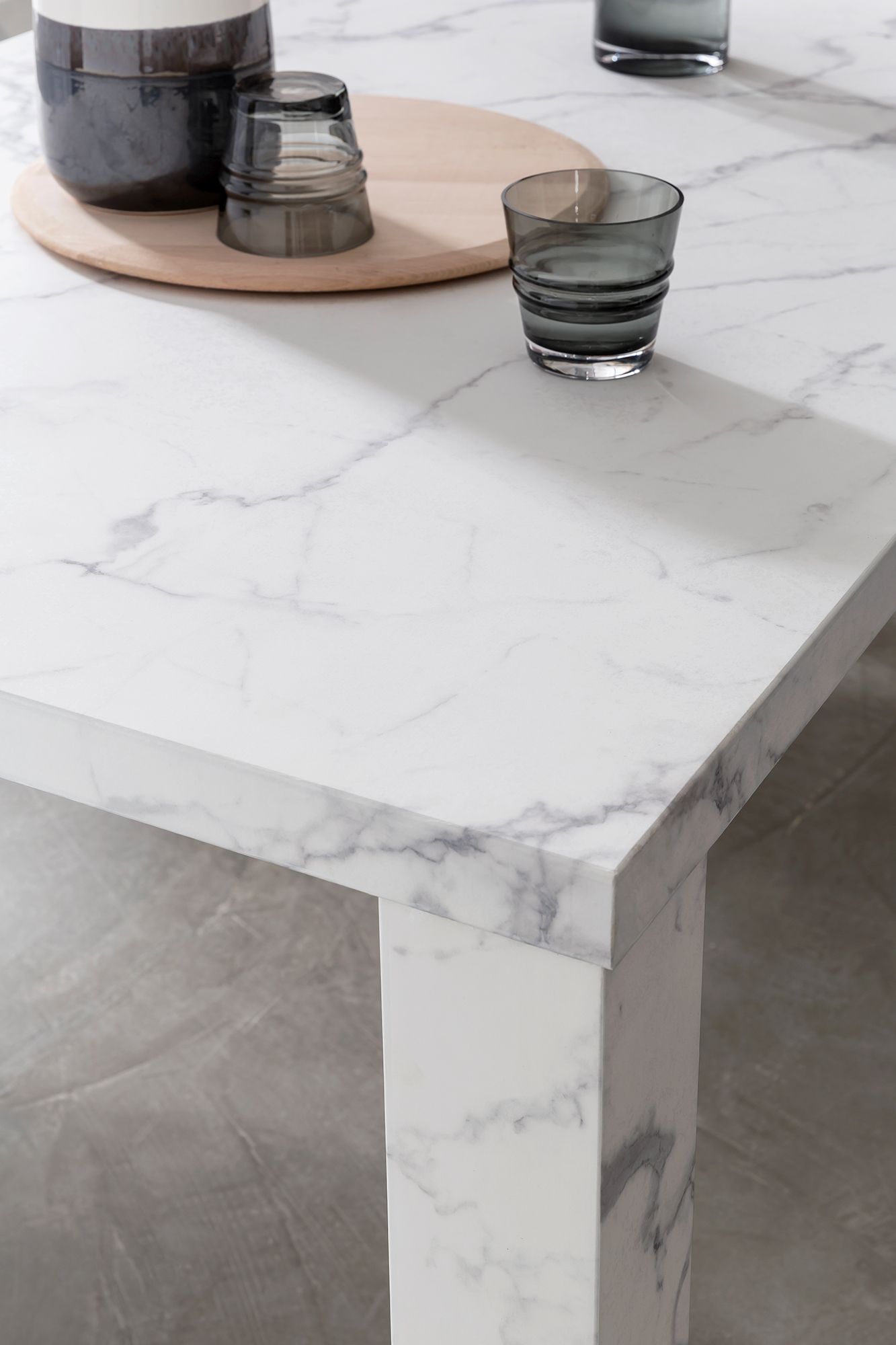 Dieser stylische Esstisch macht jeden Essbereich noch einladender. Der Tisch wurde aus hochwertigem MDF hergestellt. Die Oberfläche ist sehr widerstandsfähig gegen die allgemeinen Belastungen des Alltags. Die besonders breiten Beine und die weiße Marmoroptik machen richtig was her. Der Esstisch - egal ob in der Küche oder im Esszimmer - ist in vielen Wohnungen das Zentrum des gesellschaftlichen Lebens. Hier isst und trinkt man zusammen, man lacht, spielt und unterhält sich.