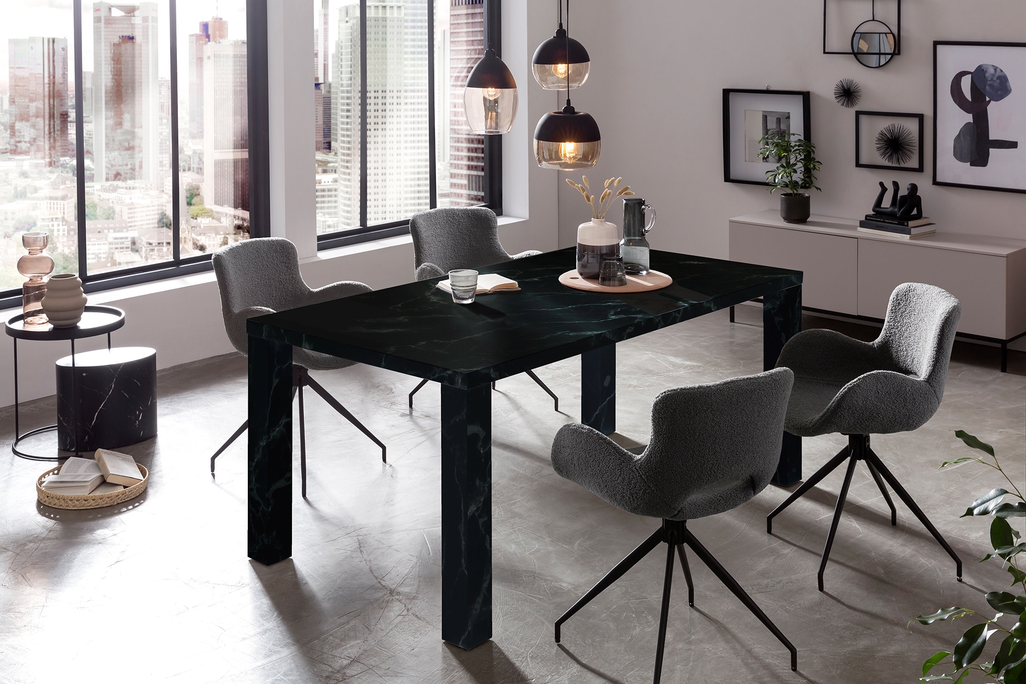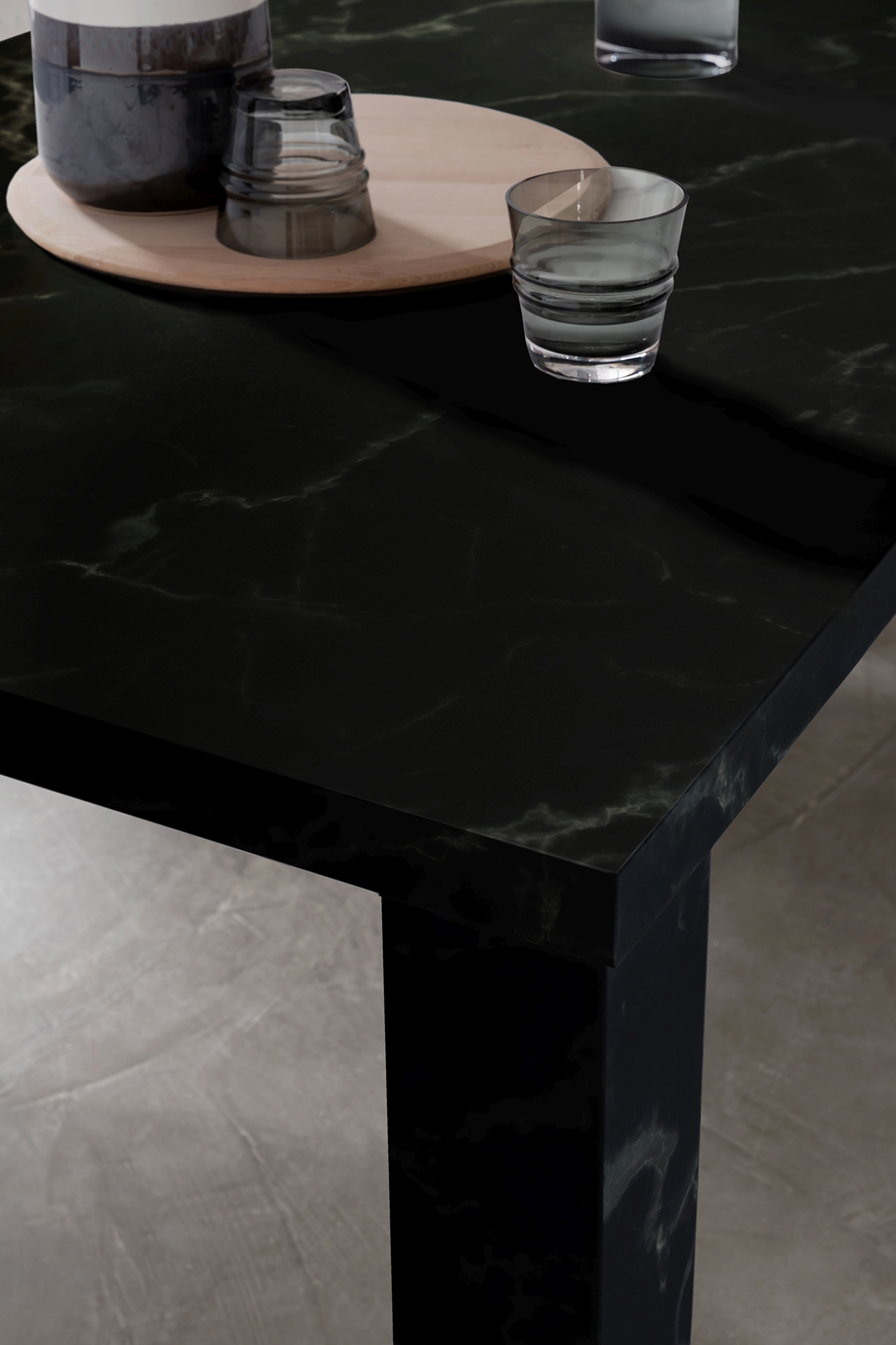 Dieser stylische Esstisch macht jeden Essbereich noch einladender. Der Tisch wurde aus hochwertigem MDF hergestellt. Die Oberfläche ist sehr widerstandsfähig gegen die allgemeinen Belastungen des Alltags. Die besonders breiten Beine und die schwarze Marmoroptik machen richtig was her. Der Esstisch - egal ob in der Küche oder im Esszimmer - ist in vielen Wohnungen das Zentrum des gesellschaftlichen Lebens. Hier isst und trinkt man zusammen, man lacht, spielt und unterhält sich.