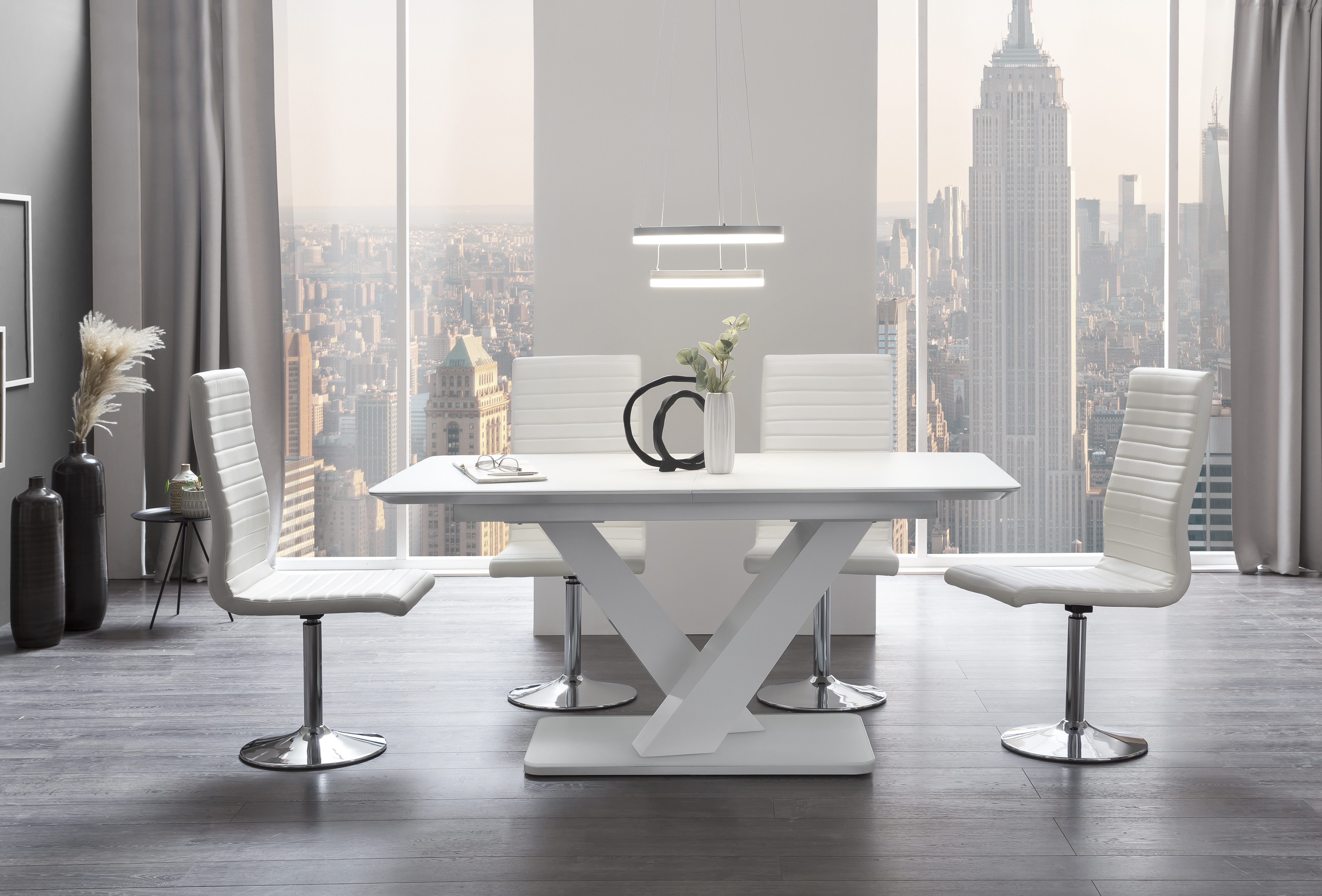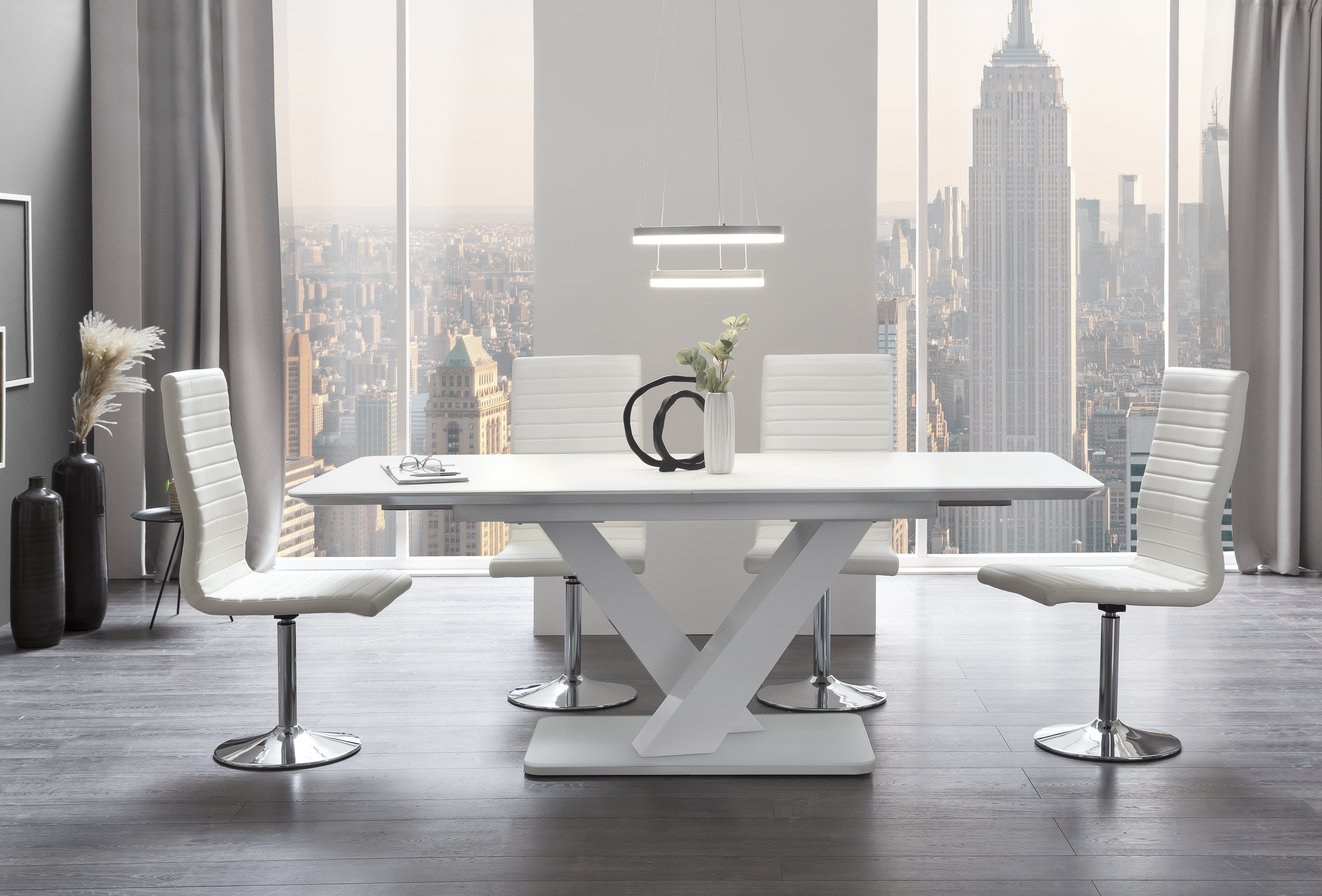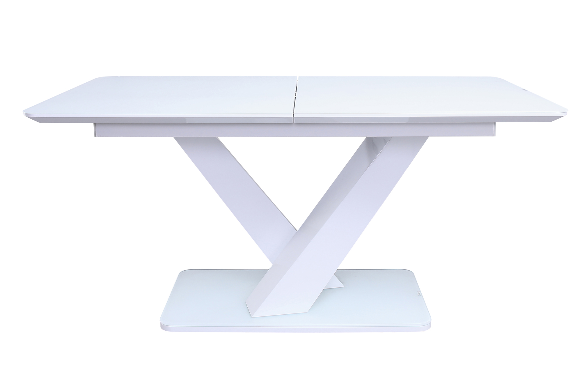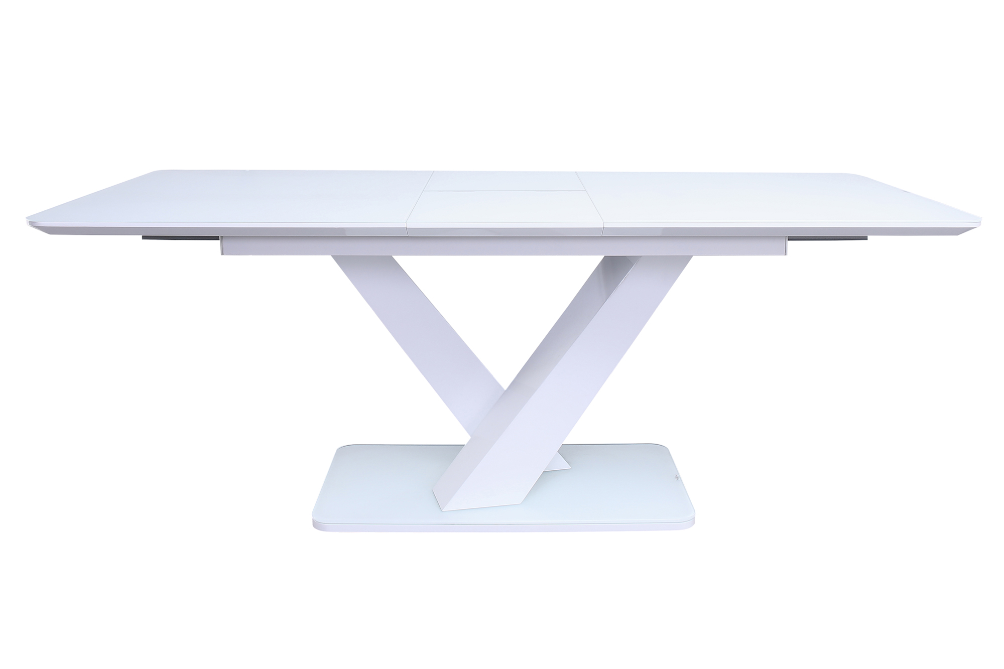 Tischplatte und Gestell: MDF (Mitteldichte Holzfaserplatte) in Weiß Hochglanz lackiert kombiniert mit Glas