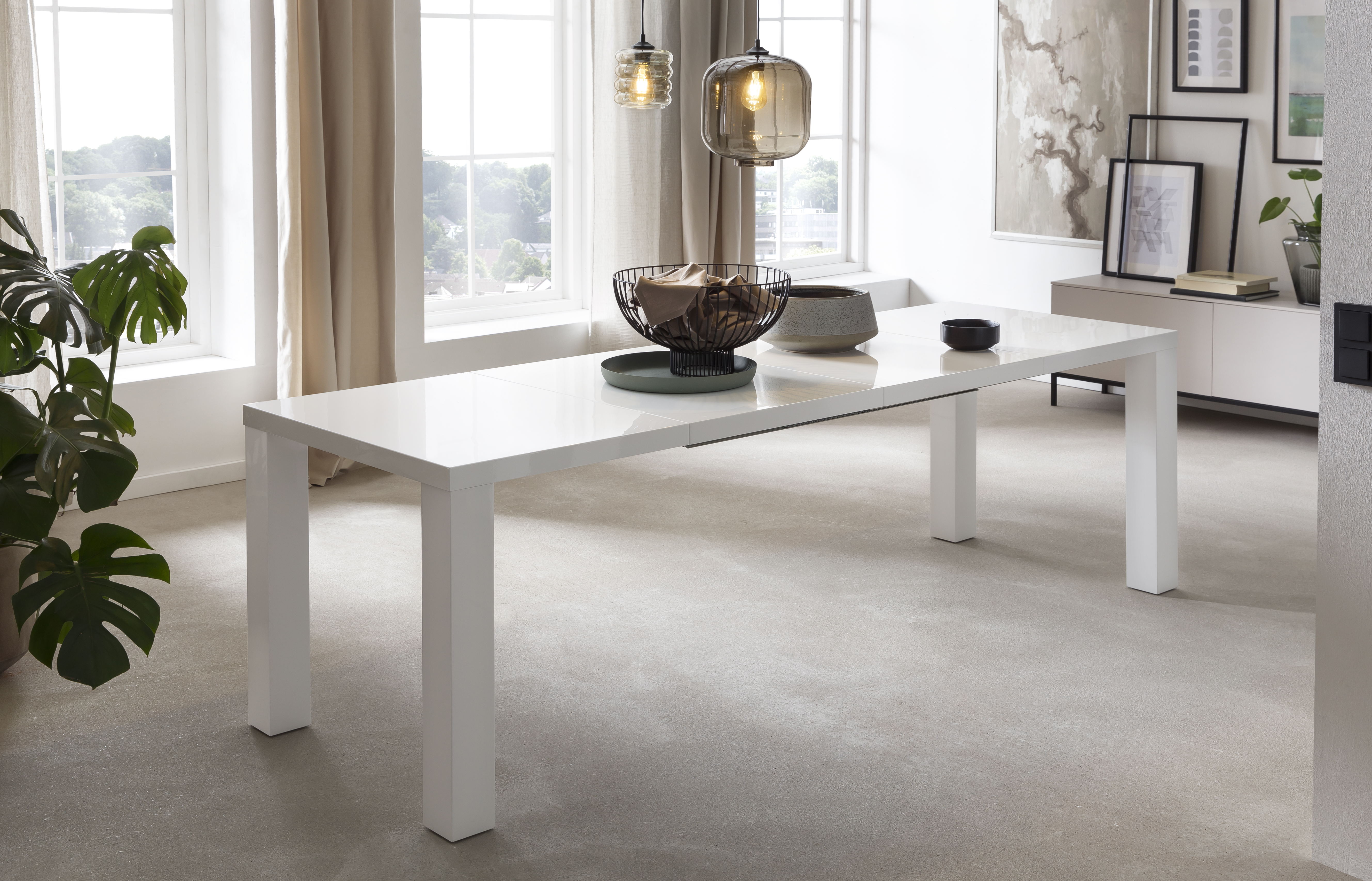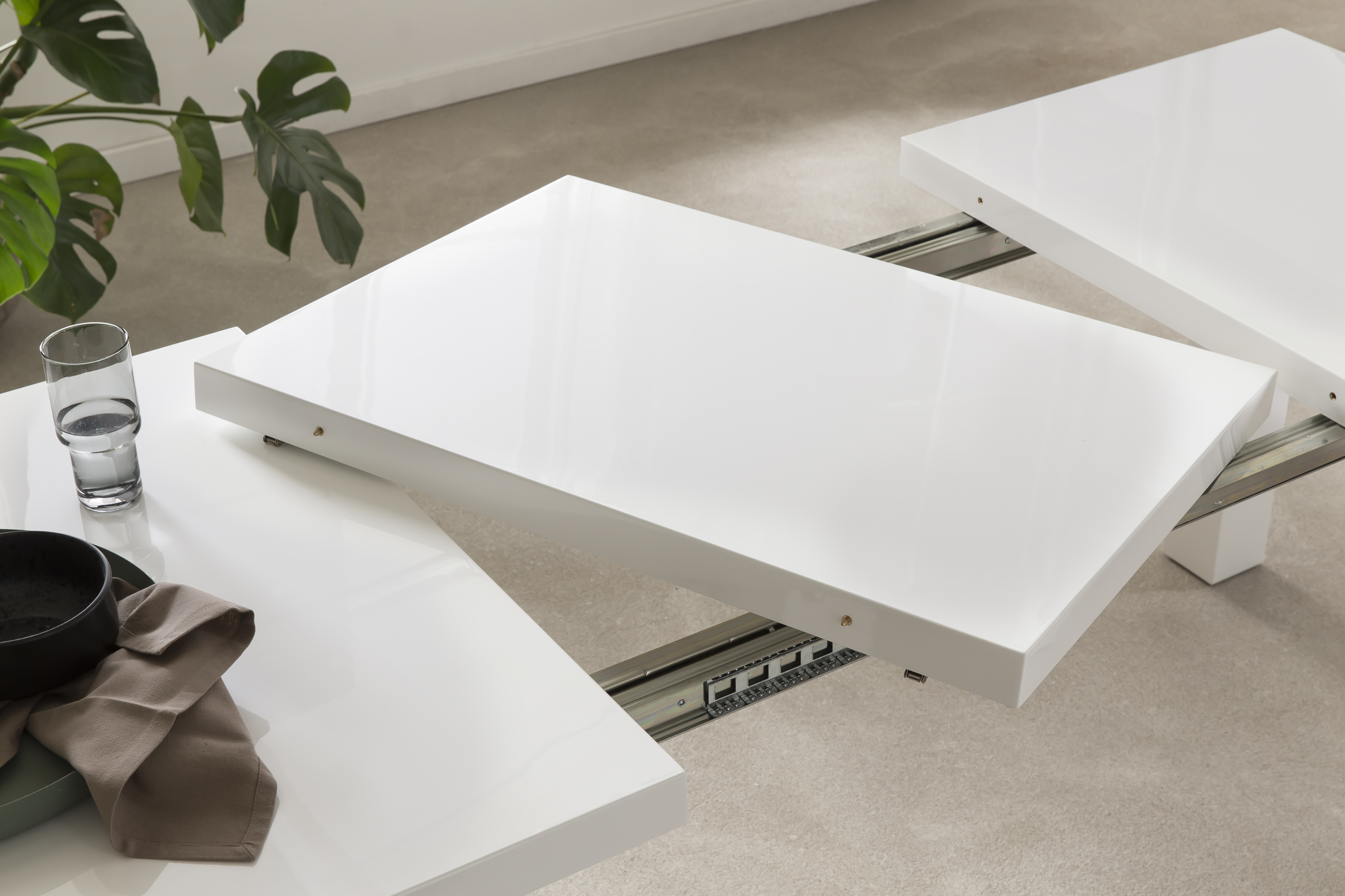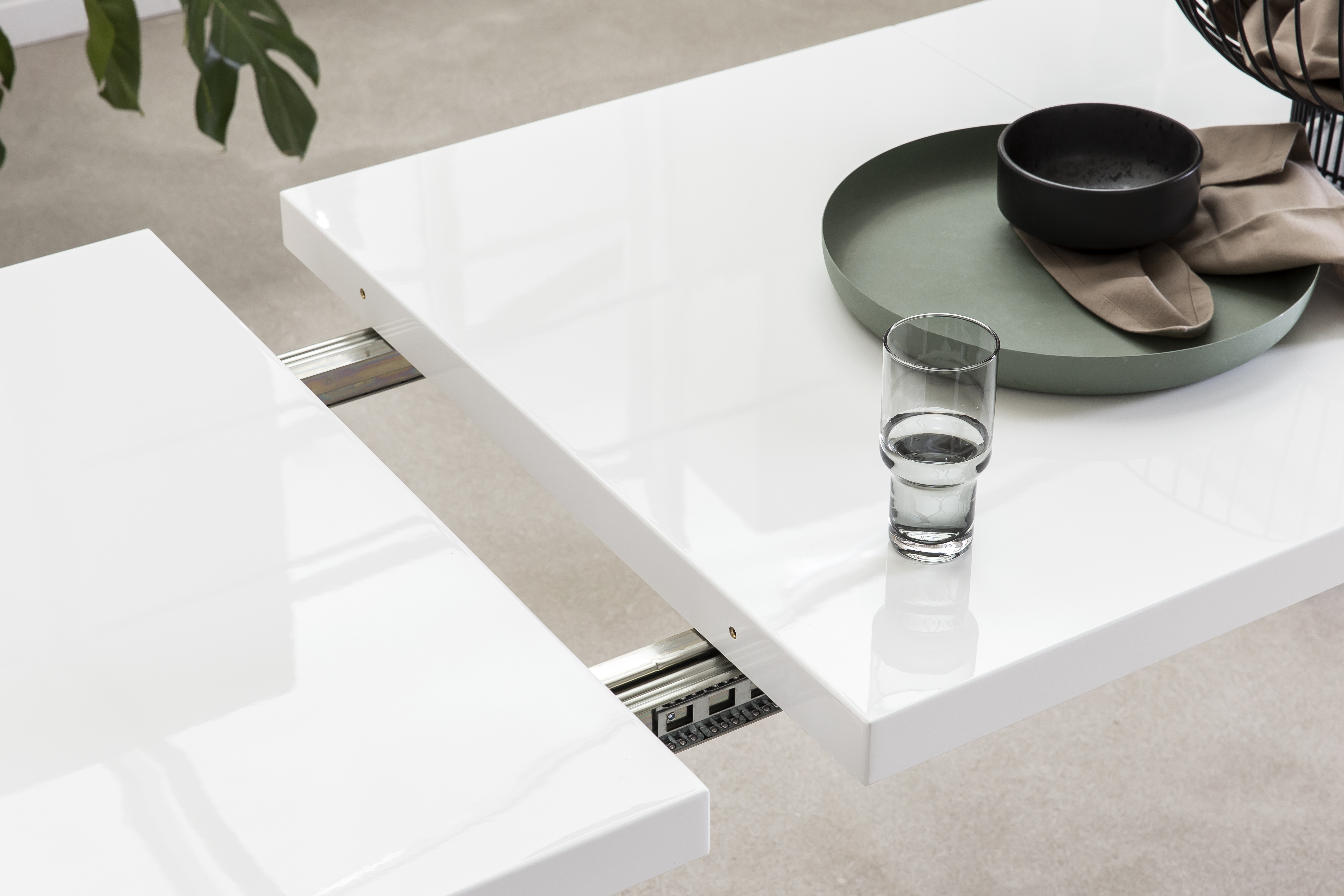 Tischplatte und Gestell: MDF (Mitteldichte Holzfaserplatte) in Weiß Hochglanz lackiert