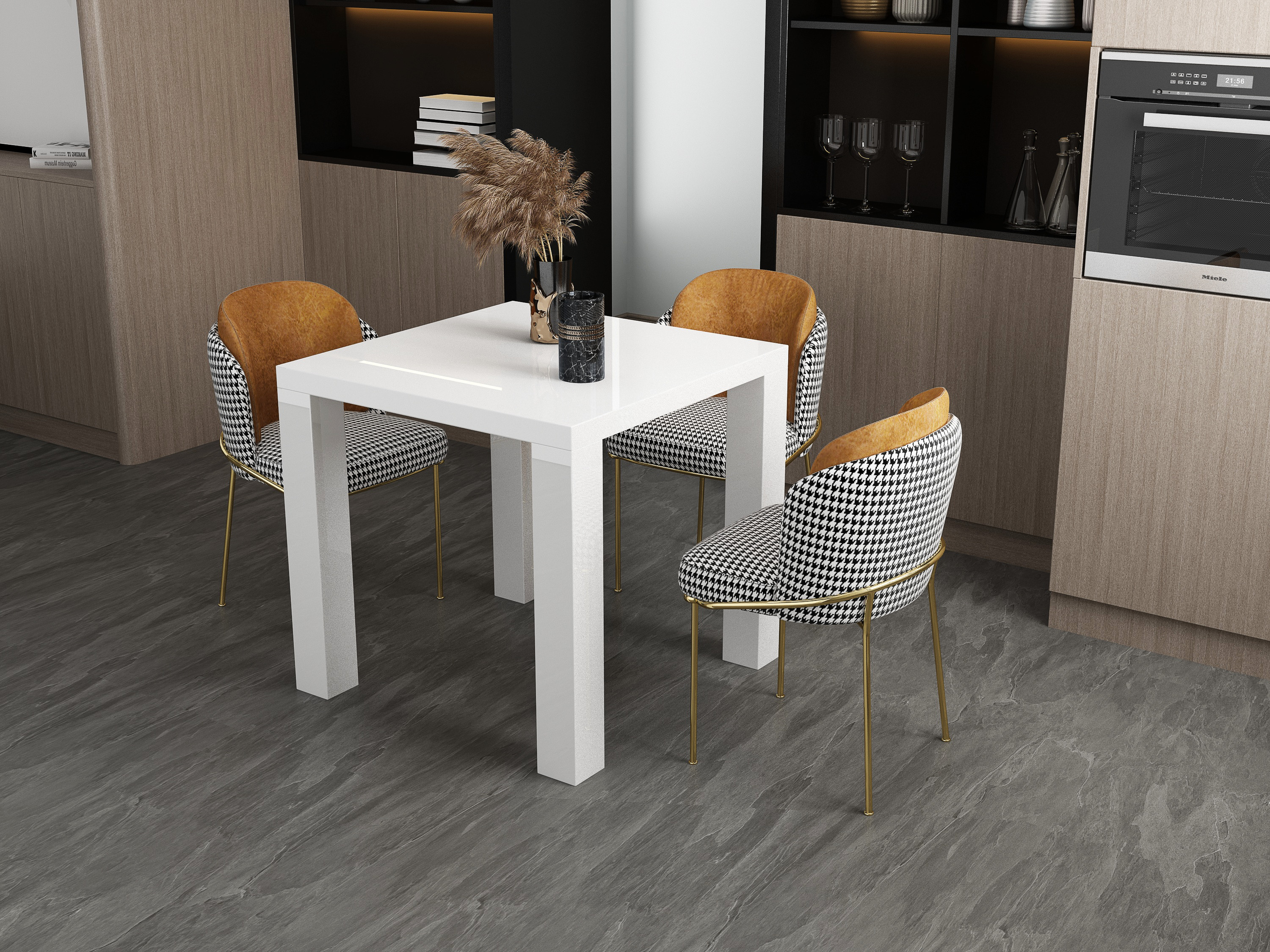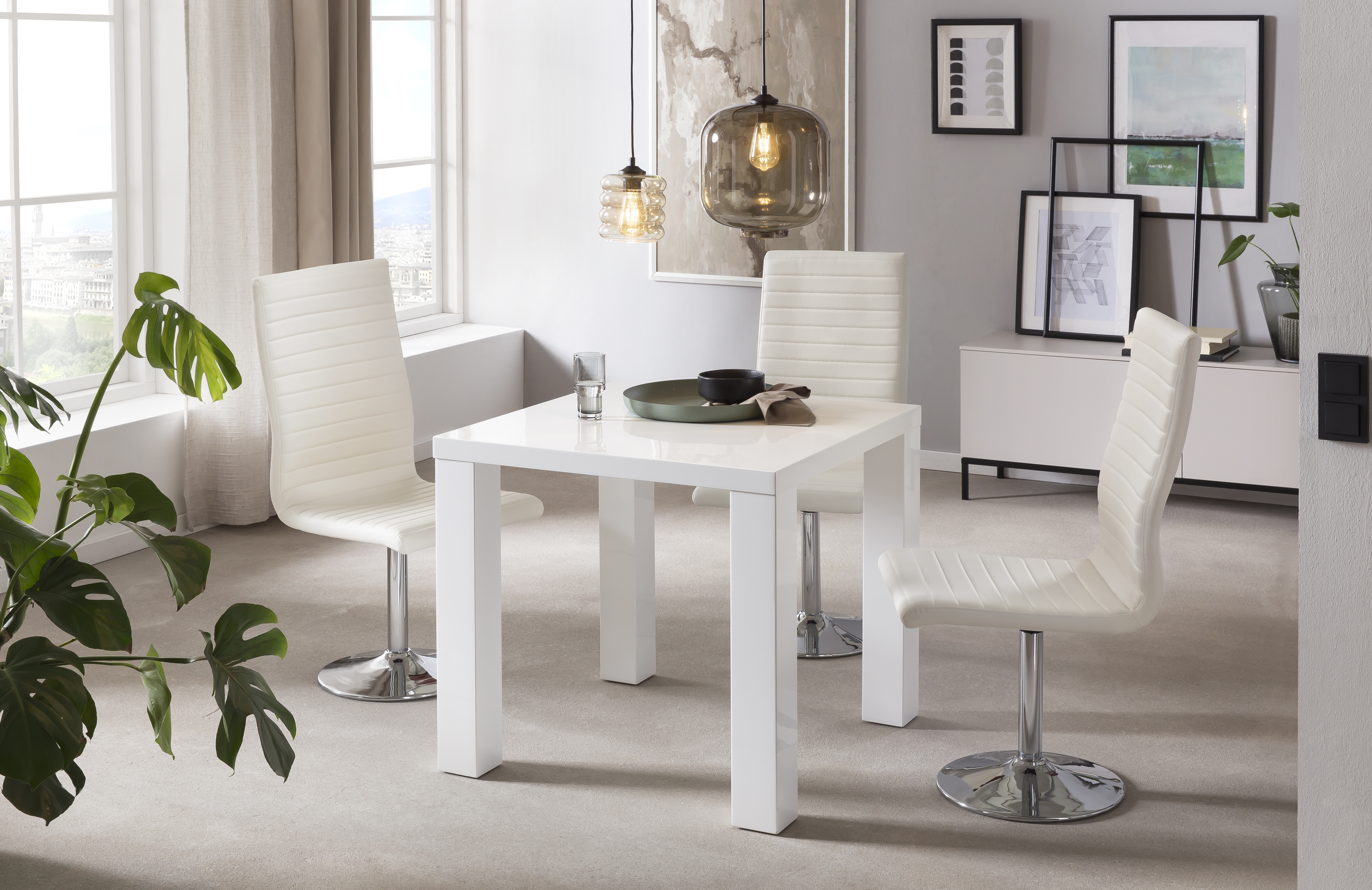 Tischplatte und Gestell: MDF (Mitteldichte Holzfaserplatte) in Hochglanz Weiß lackiert