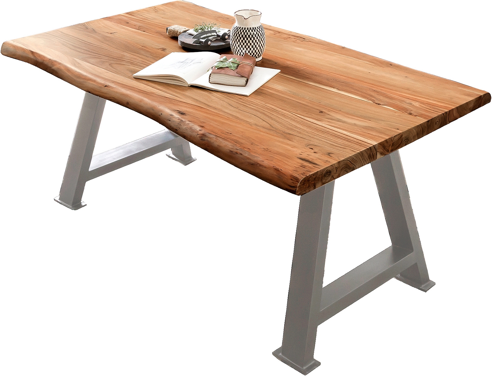 Tischplatte: Akazie massiv (Indien) mit Baumkante wie gewachsen, gebeizt, lackiert und gewachst
