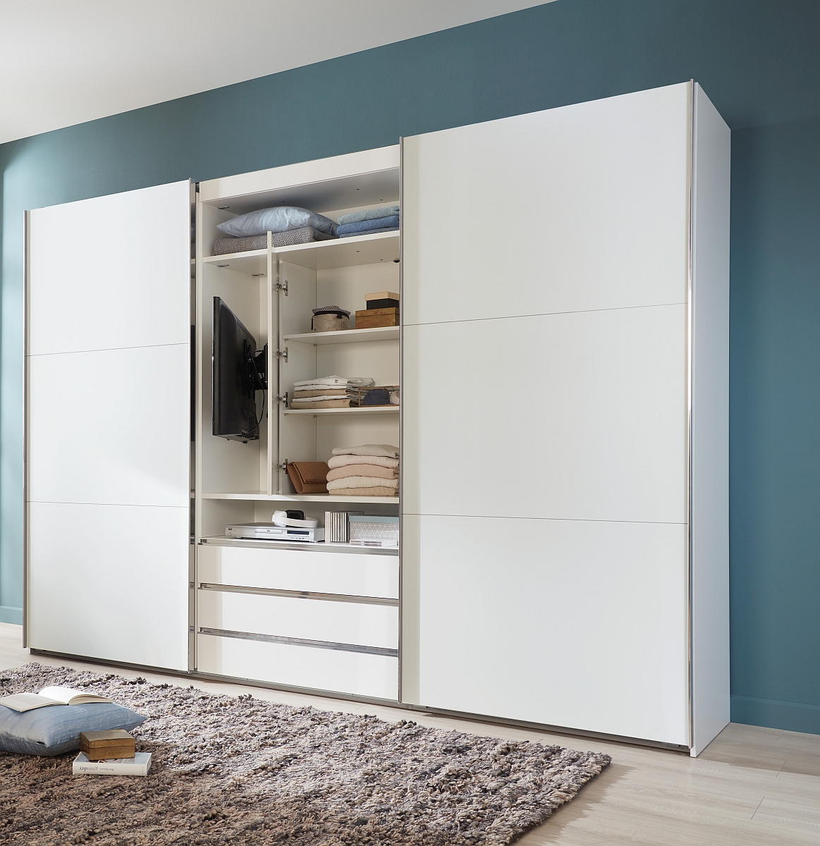 hinter den Schwebetüren jeweils 1 Fachboden und 1 Kleiderstange