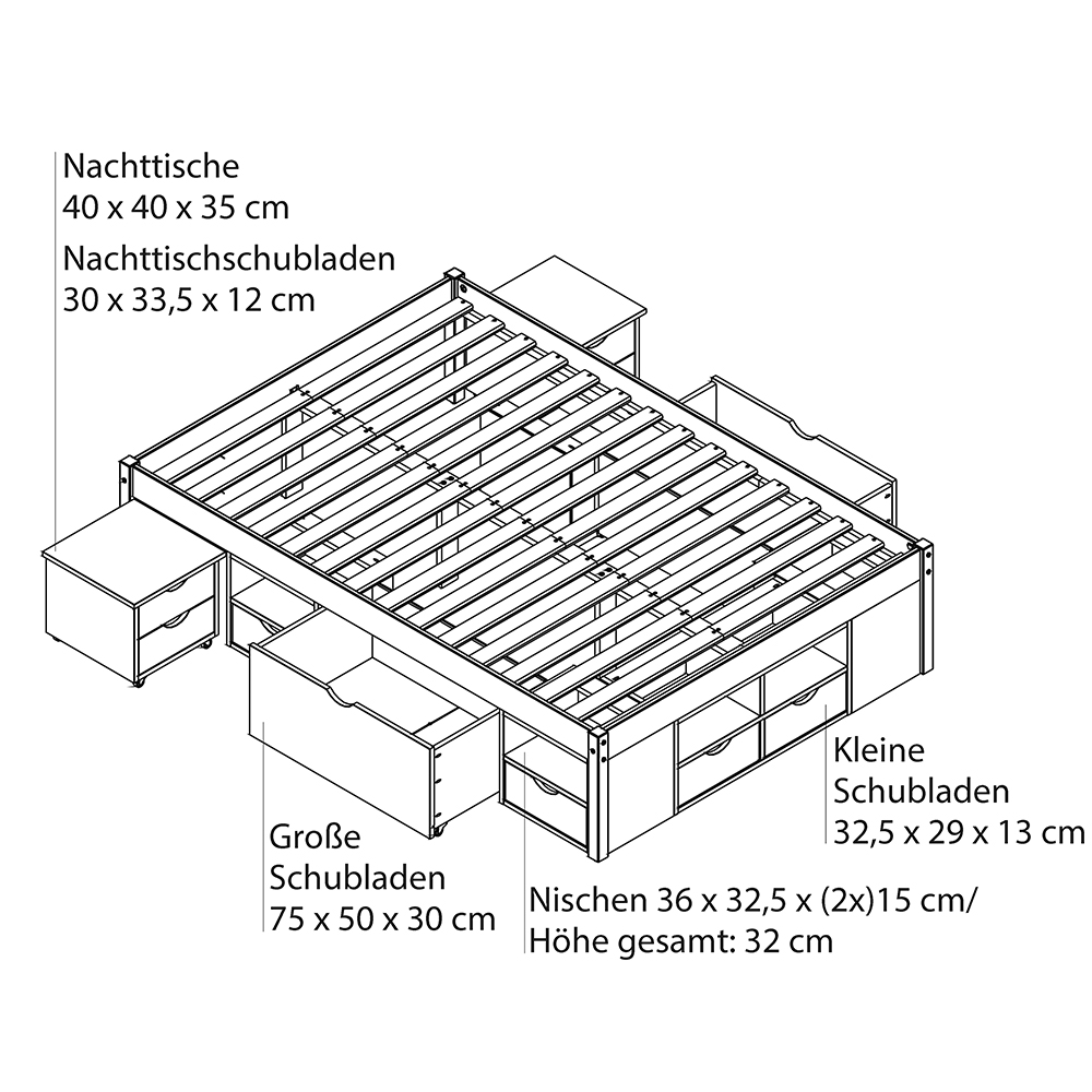 - Ebenfalls im Lieferumfang enthalten sind zwei rollbare Nachtkommoden, die links und rechts in die dafür vorgesehenen Nischen geschoben werden können. Maße ca. 40x40 cm.