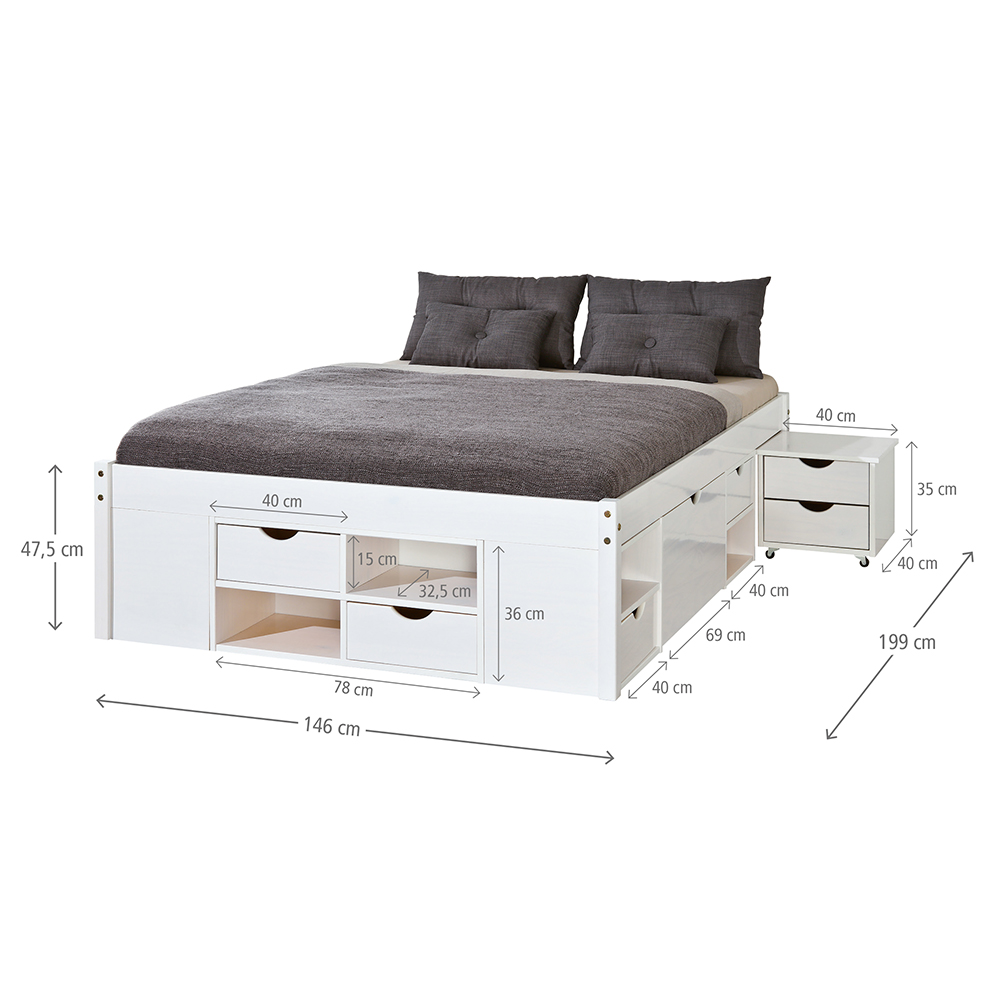 | Ausstattung Betten: | Schublade(n), inkl. Lattenrost, inkl. Nachtkommode(n), ohne Kopfteil | ||