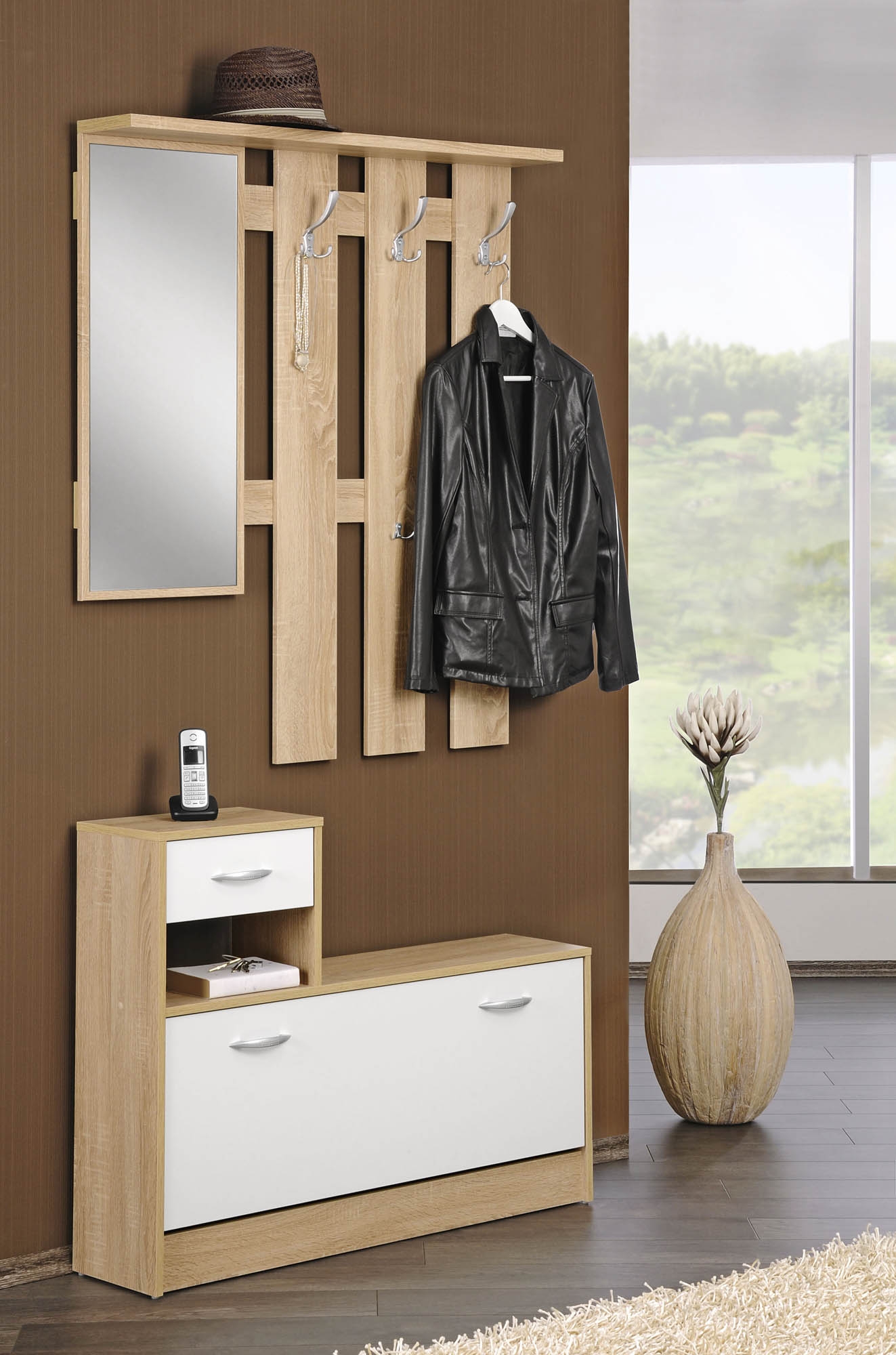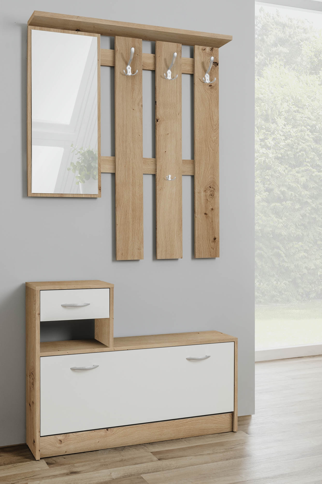 Diese funktionale Garderobe in Artisan Eiche Holznachbildung kombiniert mit weißen Fronten bietet eine praktische Lösung für den Flur oder Eingangsbereich. Das Set besteht aus zwei Elementen: Einem Wandpaneel mit Spiegel, Hutablage und drei Kleiderhaken sowie einem Stauraumelement mit Schubkasten, offenem Fach und einem Schuhkipper. Die pflegeleichten Oberflächen sind unempfindlich im Alltag und lassen sich leicht reinigen. Die Kombination aus offener Ablage und geschlossenem Stauraum sorgt für Ordnung auf kleinem Raum. Ideal für preisbewusste Haushalte, die eine platzsparende und zugleich praktische Garderobe suchen.