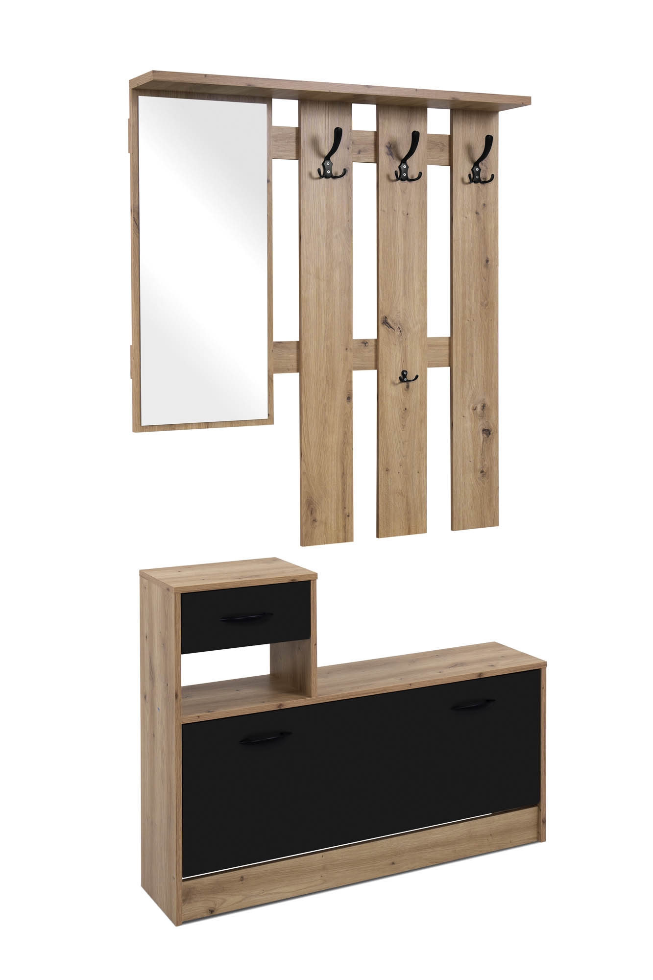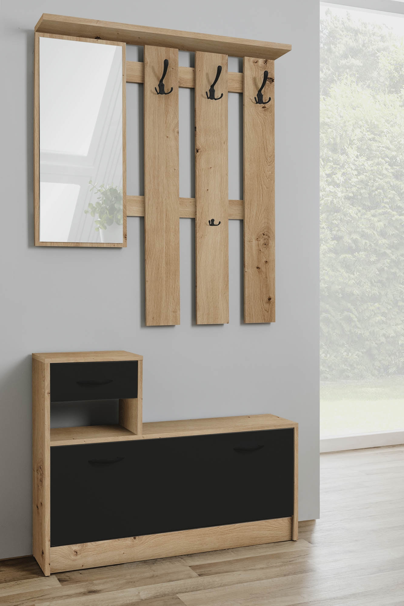 Diese moderne Garderobe in Artisan Eiche Holznachbildung und schwarzen Akzenten vereint ansprechende Optik mit praktischer Funktionalität. Sie besteht aus zwei Elementen: einem Wandpaneel mit Spiegel, Hutablage und drei Kleiderhaken sowie einem kombinierten Stauraumelement mit Schubkasten, offenem Fach und einem Schuhkipper. Die pflegeleichten Oberflächen lassen sich im Alltag unkompliziert reinigen. Dank der durchdachten Aufteilung bietet die Garderobe auch auf kleinem Raum ausreichend Stauraum für Jacken, Schuhe und Accessoires. Eine preisbewusste Lösung für strukturierte Eingangsbereiche mit klarer Linienführung.
