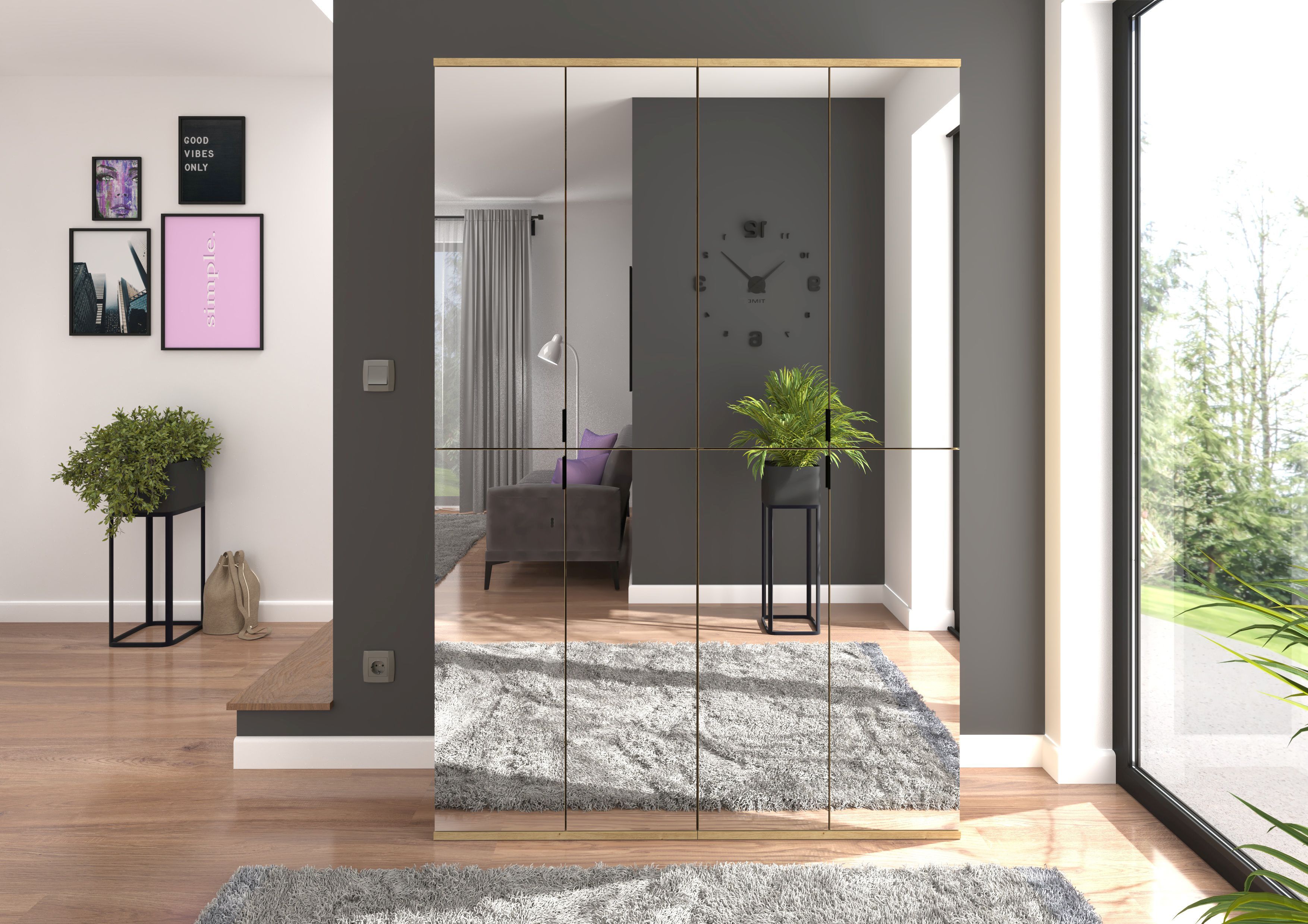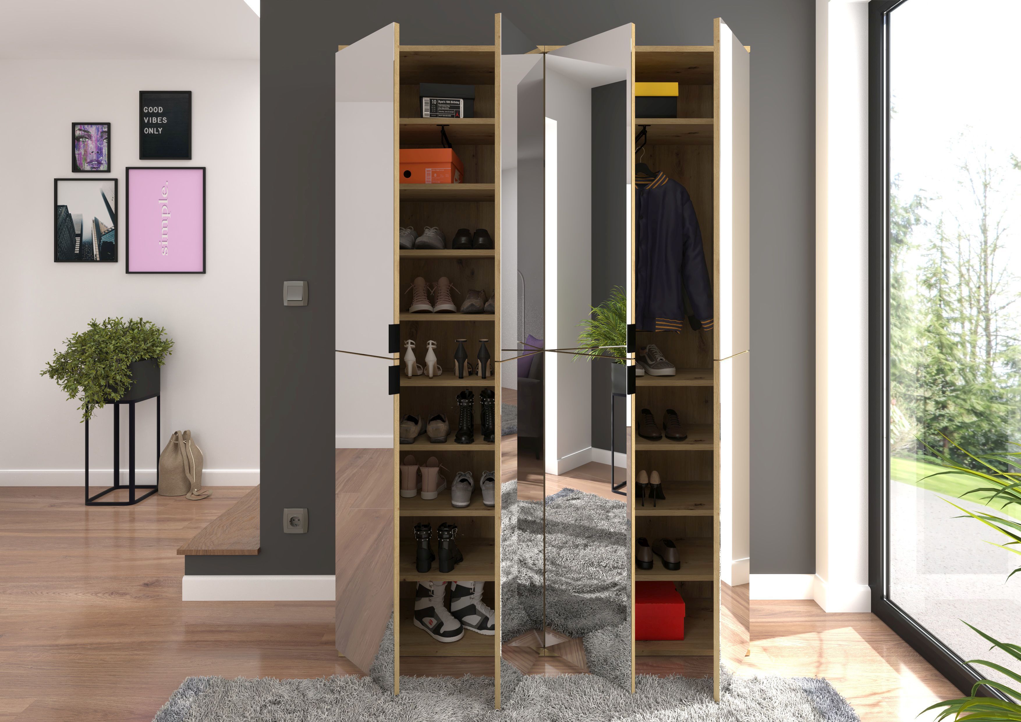 - Design/Stil: Die Garderobenkombination in Artisan Holznachbildung und Spiegel strahlt eine moderne Eleganz aus. Die Spiegeltüren verleihen dem Möbelstück ein ansprechendes und zeitgemäßes Aussehen, während die Artisan Holznachbildung für einen frischen Gesamteindruck sorgt. Dieses schlichte und dennoch stilvolle Design passt gut zu verschiedenen Einrichtungsstilen und verleiht dem Raum eine helle und luftige Atmosphäre.
