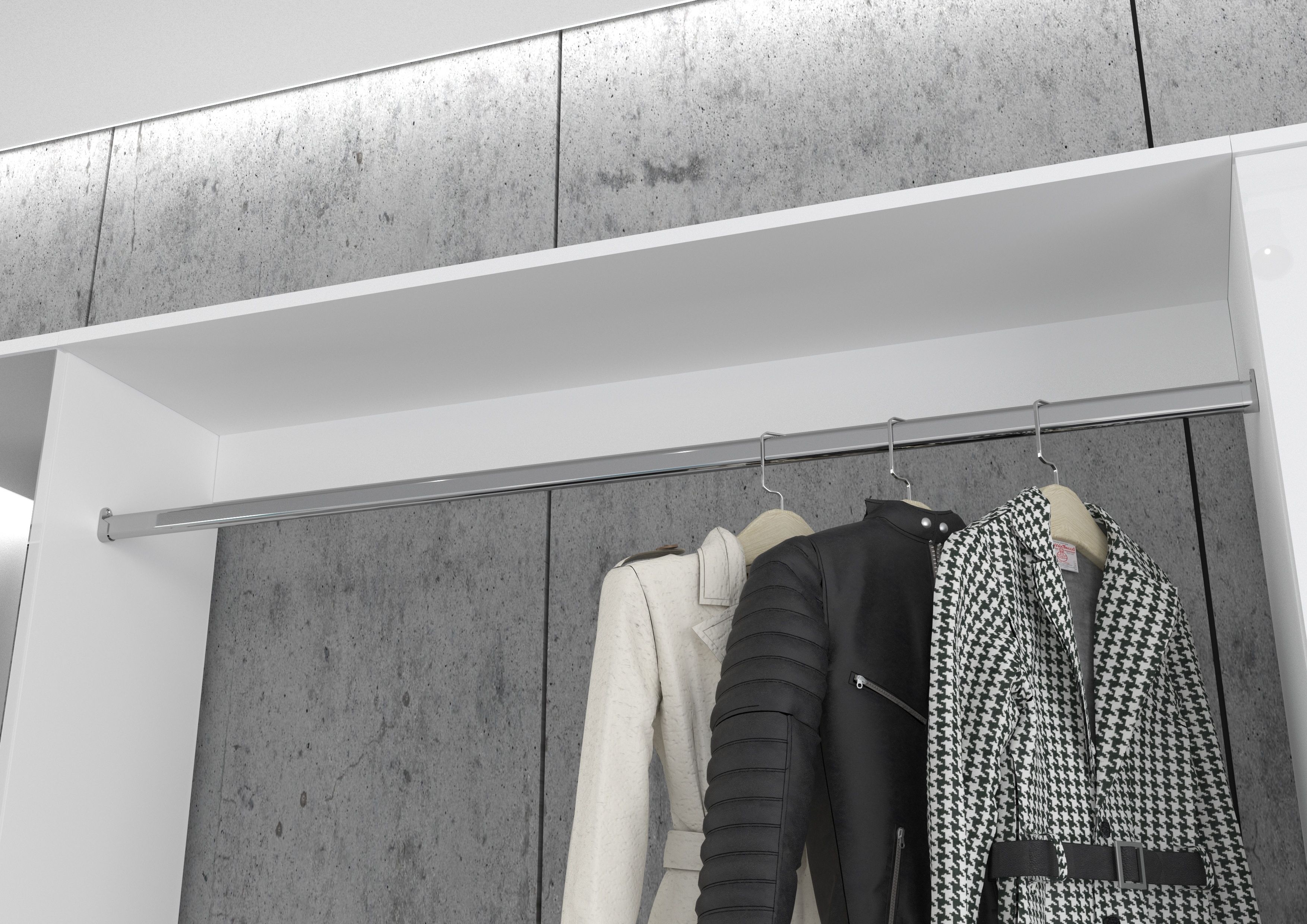 - Design/Stil: Die Kommode mit integrierter Garderobenstange präsentiert sich in einem modernen und schlichten Design mit weißer Nachbildung und einer glänzenden Hochglanzoberfläche. Die klaren Linien und das minimalistische Erscheinungsbild verleihen dem Raum eine zeitgemäße und ansprechende Atmosphäre.