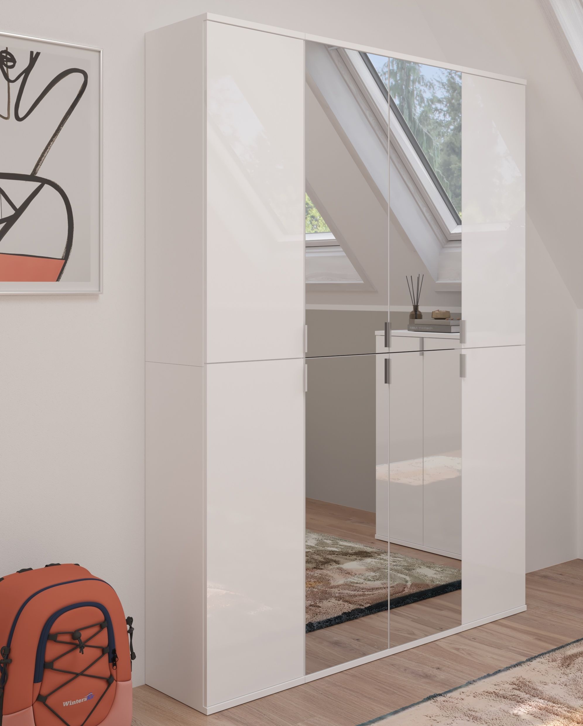 1 Garderobenschrank mit 2 Türen mit Spiegel, 7 Einlegeböden, 1 Konstruktionsboden und 1 Kleiderstange