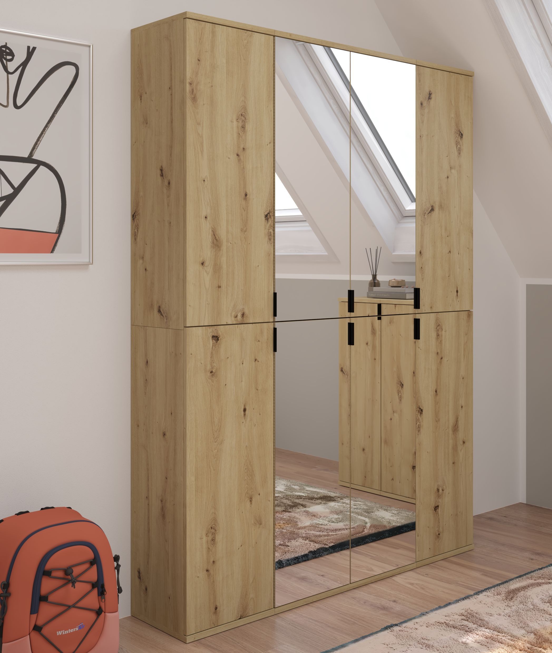 1 Garderobenschrank mit 2 Türen mit Spiegel, 7 Einlegeböden, 1 Konstruktionsboden und 1 Kleiderstange