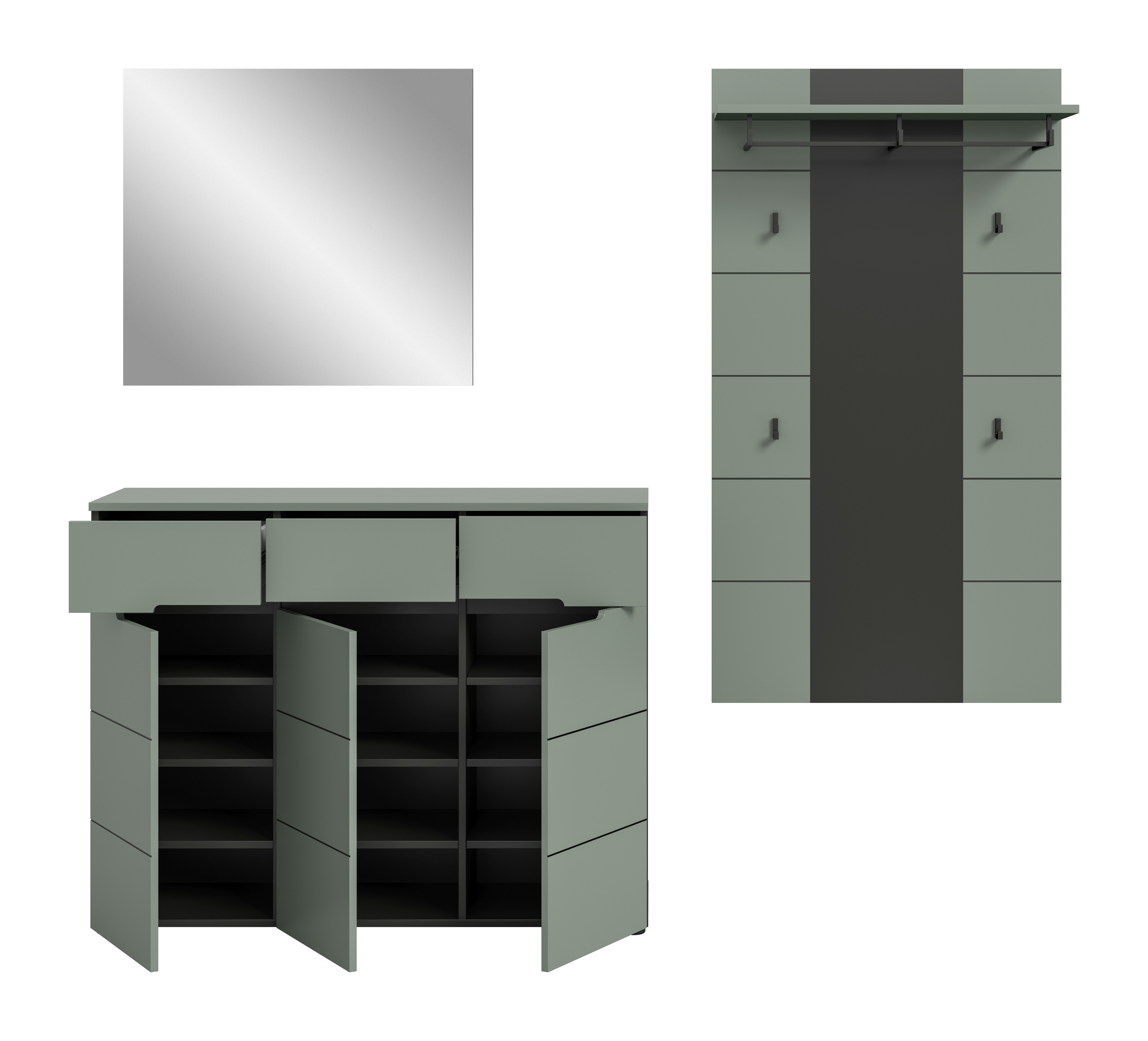 Die beeindruckende Garderobenkombination (B/H/T: 215x190x37 cm) in basaltgrauer Nachbildung und Smoke Green ist eine stilvolle Ergänzung für jeden Eingangsbereich! Mit einem praktischen Paneel, einer Schuhkommode und einem Spiegel bietet sie vielfältige Ablagemöglichkeiten und sorgt für einen organisierten Flur. Das moderne Design verleiht Ihrem Zuhause einen frischen Look, während die praktische Funktionalität für Ordnung sorgt. Machen Sie Ihren Flur zu einem einladenden Ort mit dieser eleganten Garderobenkombination!