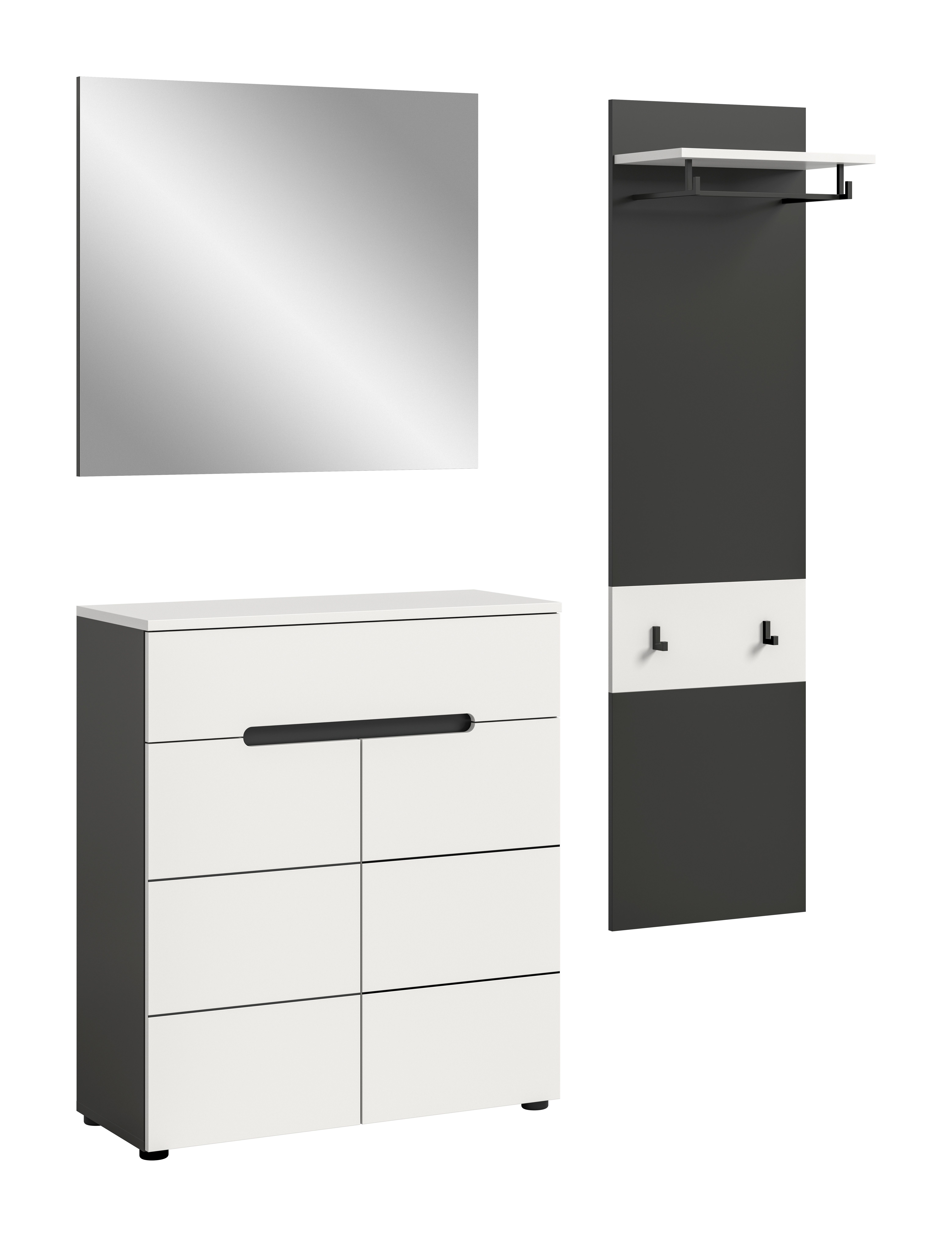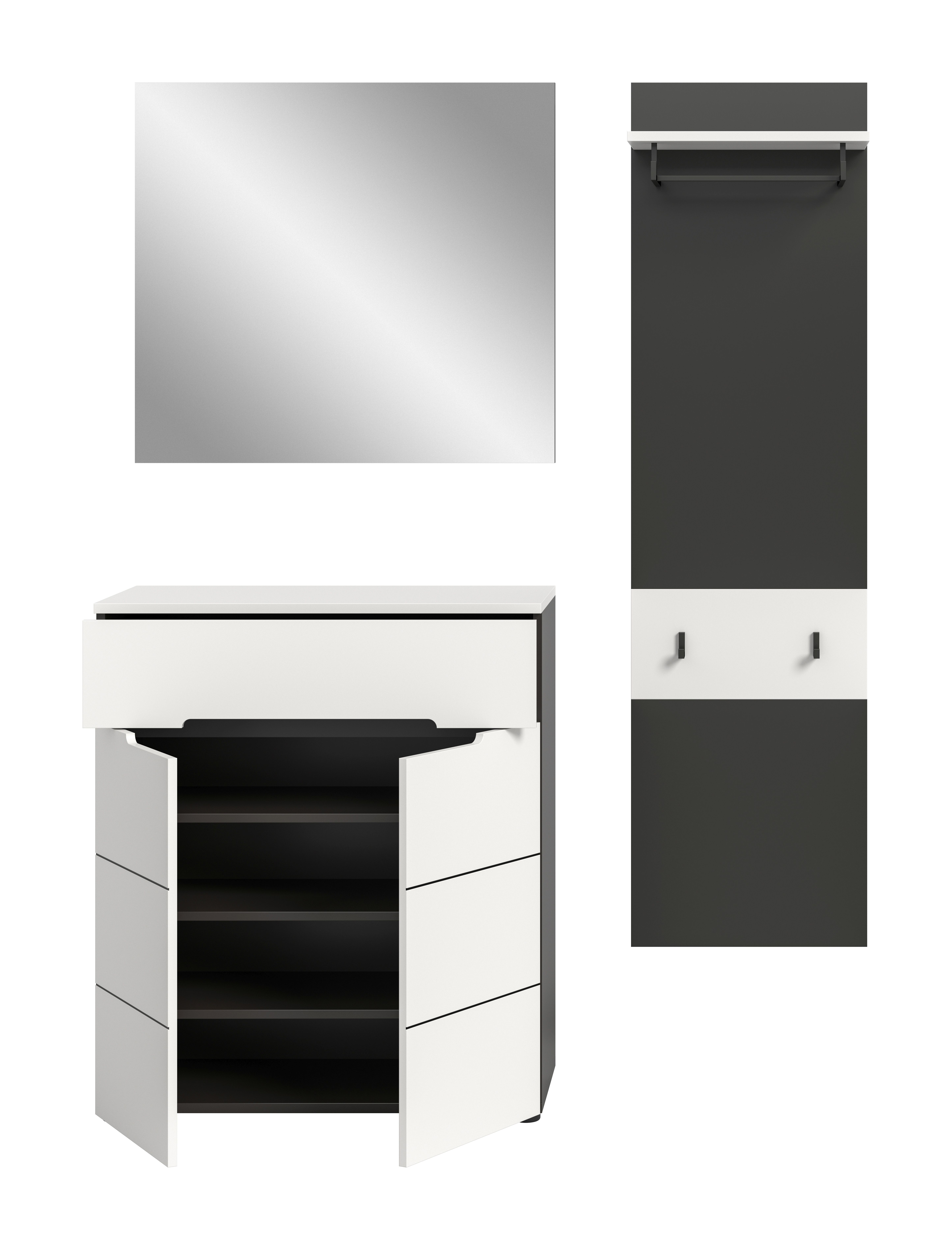 Die Garderobenkombination (B/H/T: 140x190x37 cm) in basaltgrauer Nachbildung und Weiß sorgt für einen organisierten und stilvollen Eingangsbereich. Dieses Set besteht aus einem Paneel, einer Schuhkommode und einem Spiegel, der Ihrem Flur einen eleganten Touch verleiht. Durch das schlichte Design fügt es sich harmonisch in jede Einrichtung ein und sorgt für eine freundliche Atmosphäre. Entdecken Sie die Verbindung von Funktionalität und Stil mit dieser idealen Garderobenkombination!