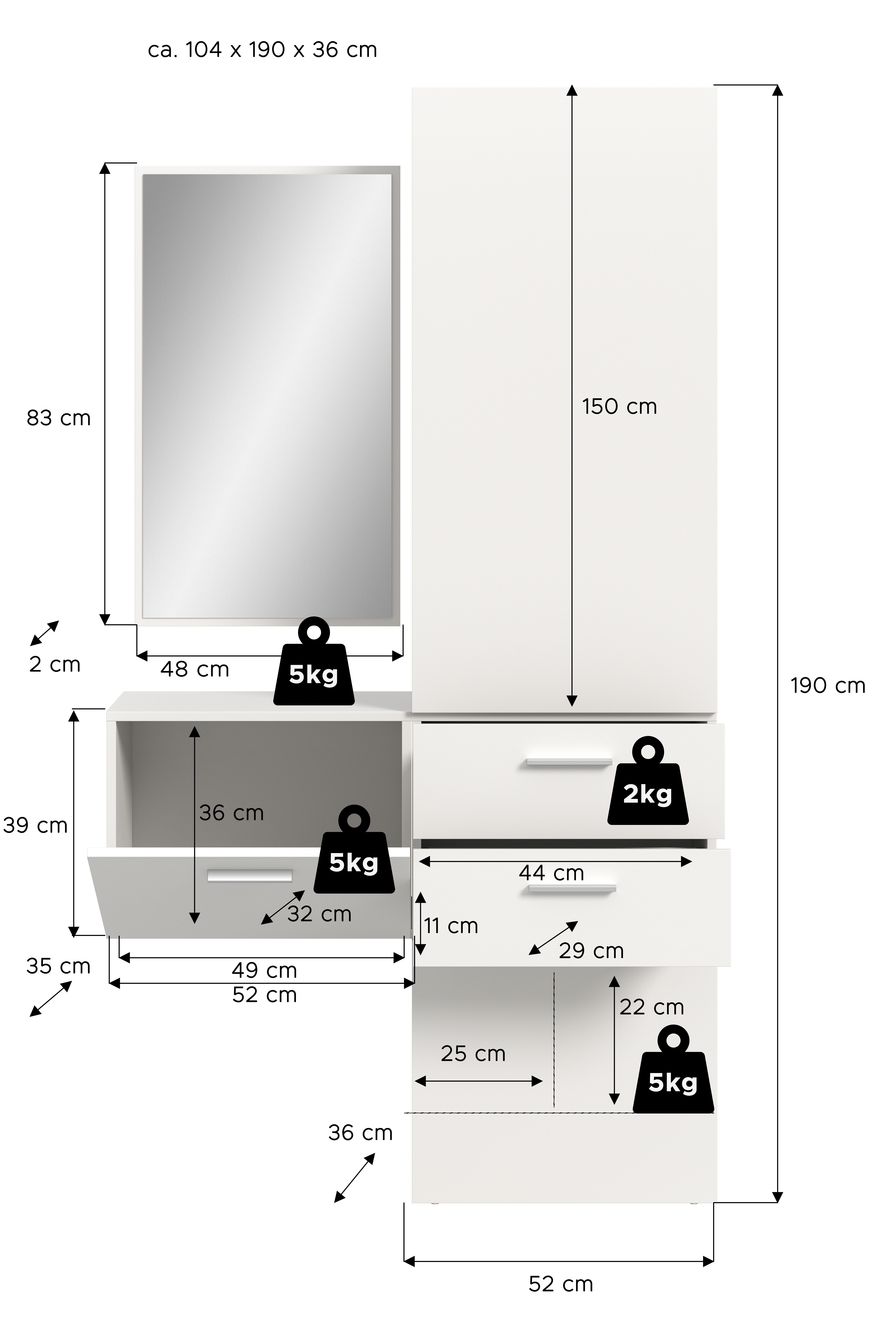 1 Kompaktgarderobe mit 2 Schubkästen, 1 Boden und 1 Kleiderstange