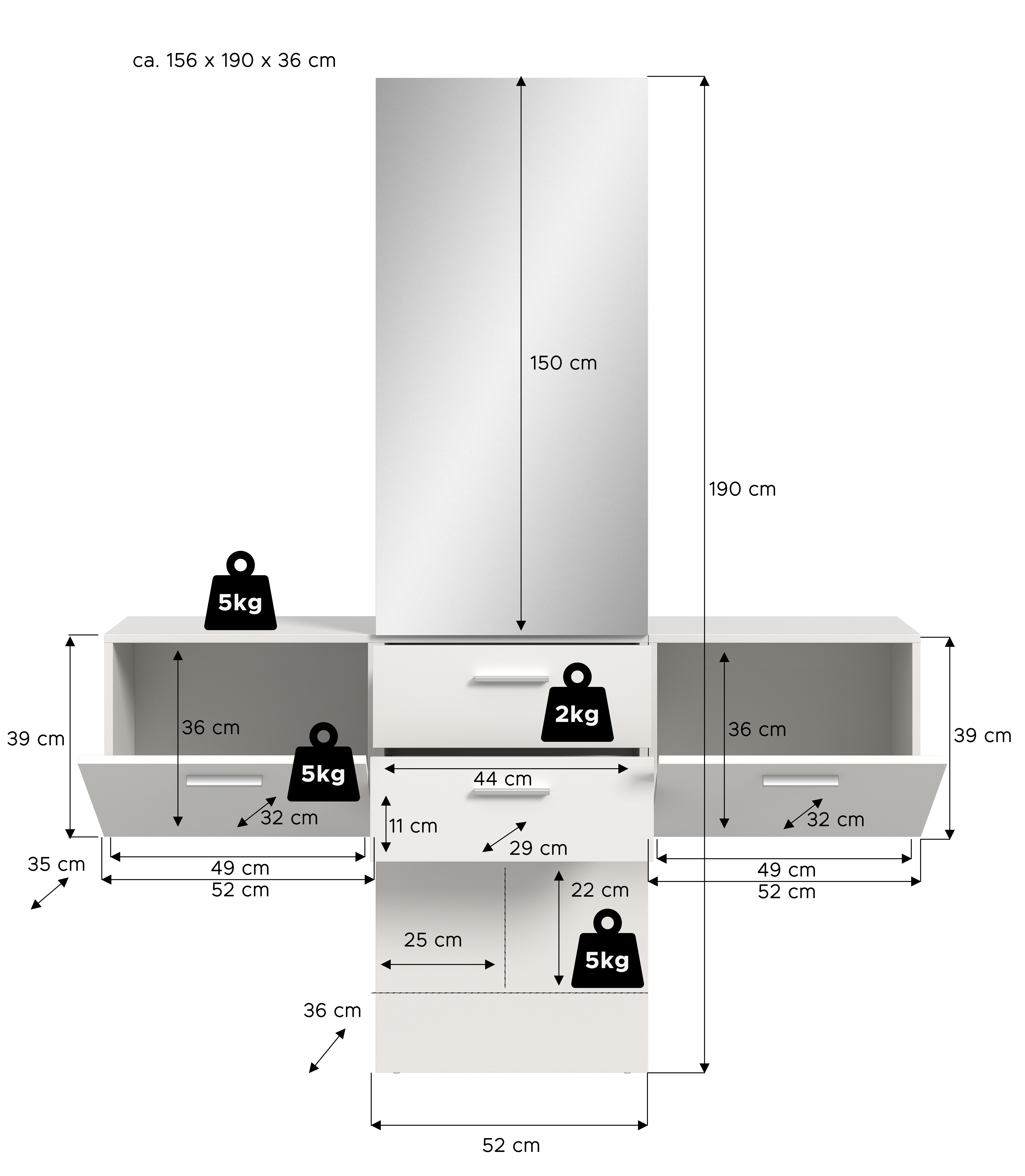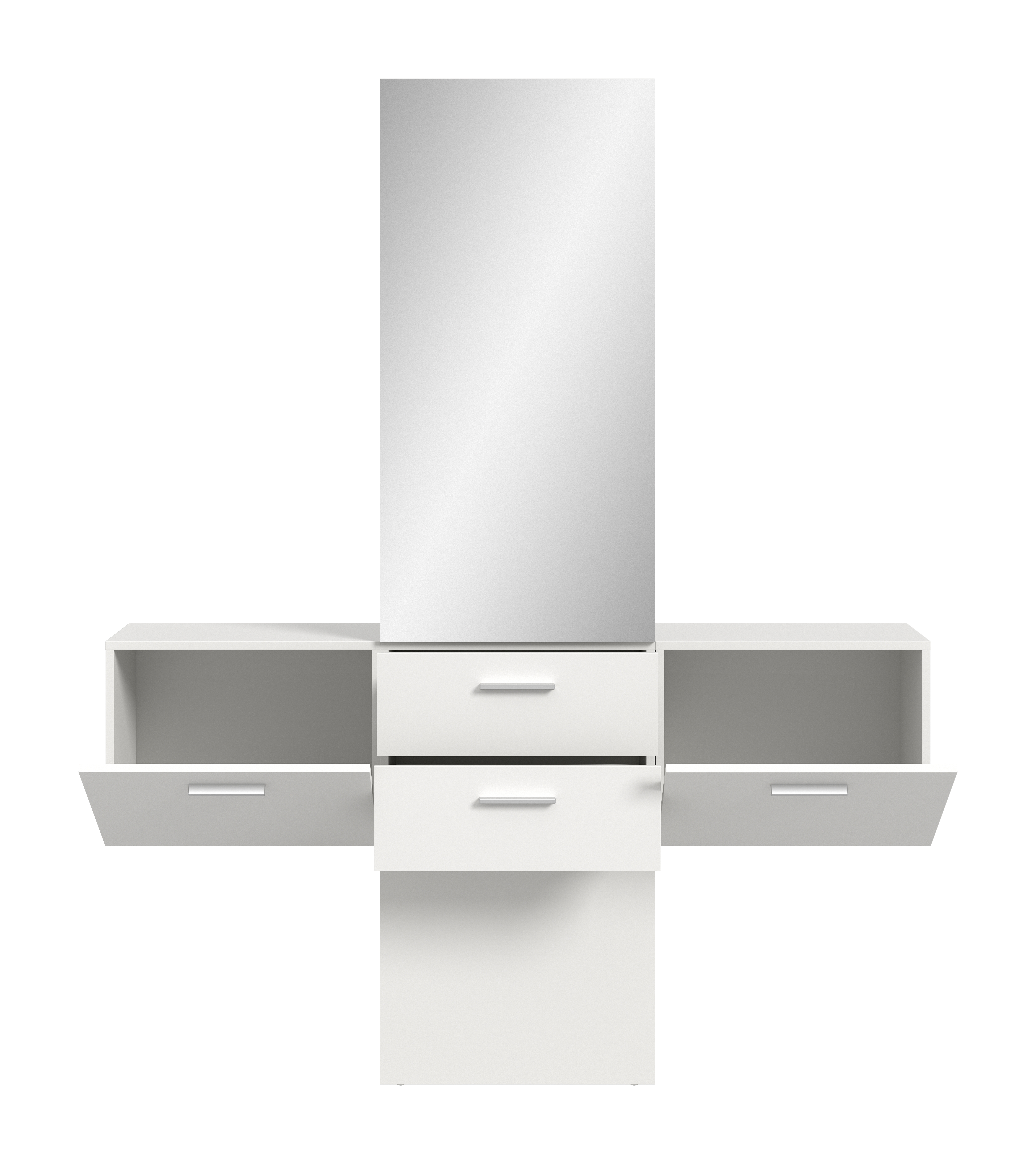 1 Kompaktgarderobe mit 2 Schubkästen, 1 Spiegel, 1 Boden und 1 Kleiderstange