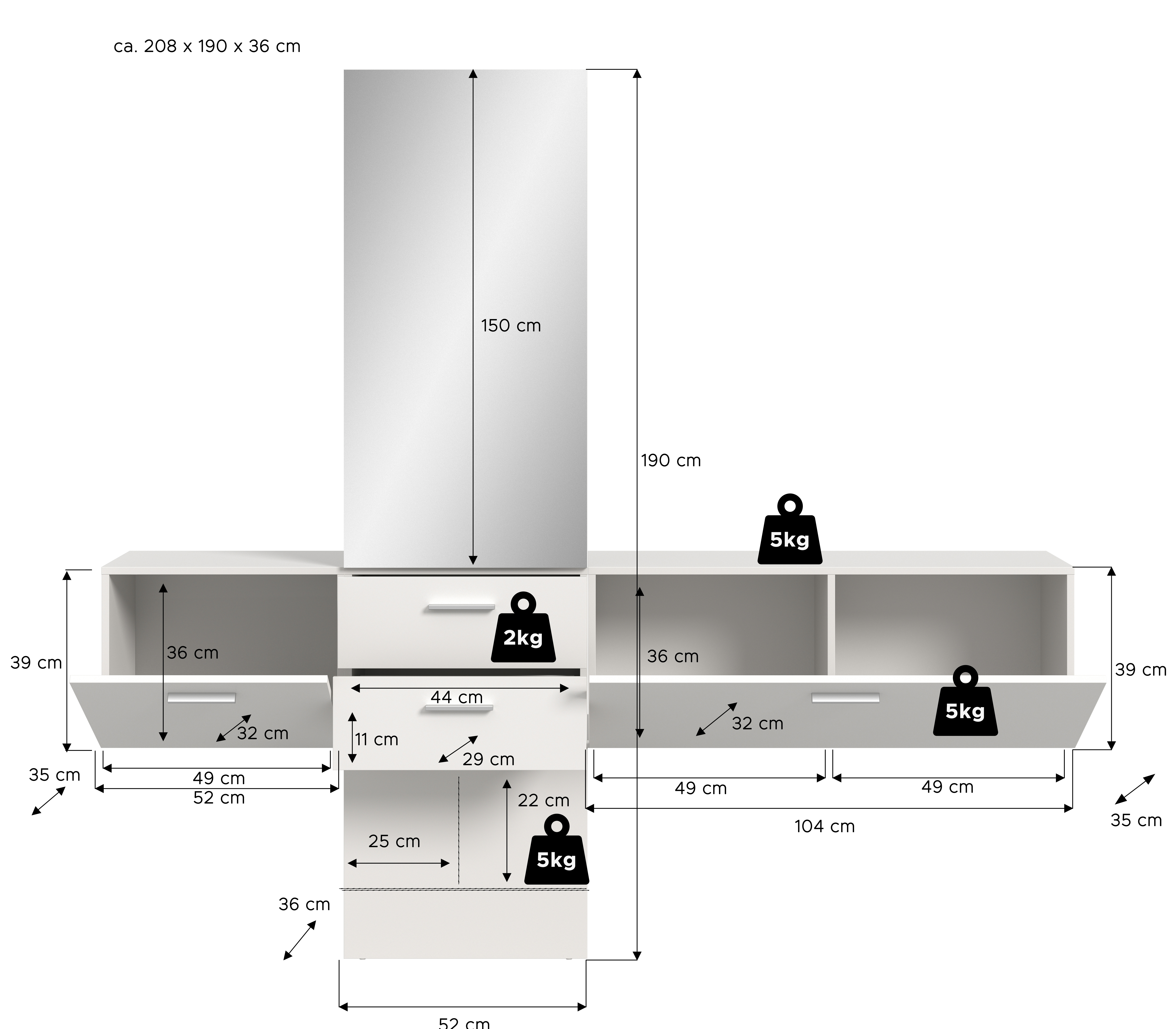 | Stauraumelement mit 1 Klappe, dahinter 2 Fächer | 104 | 39 | 36 |