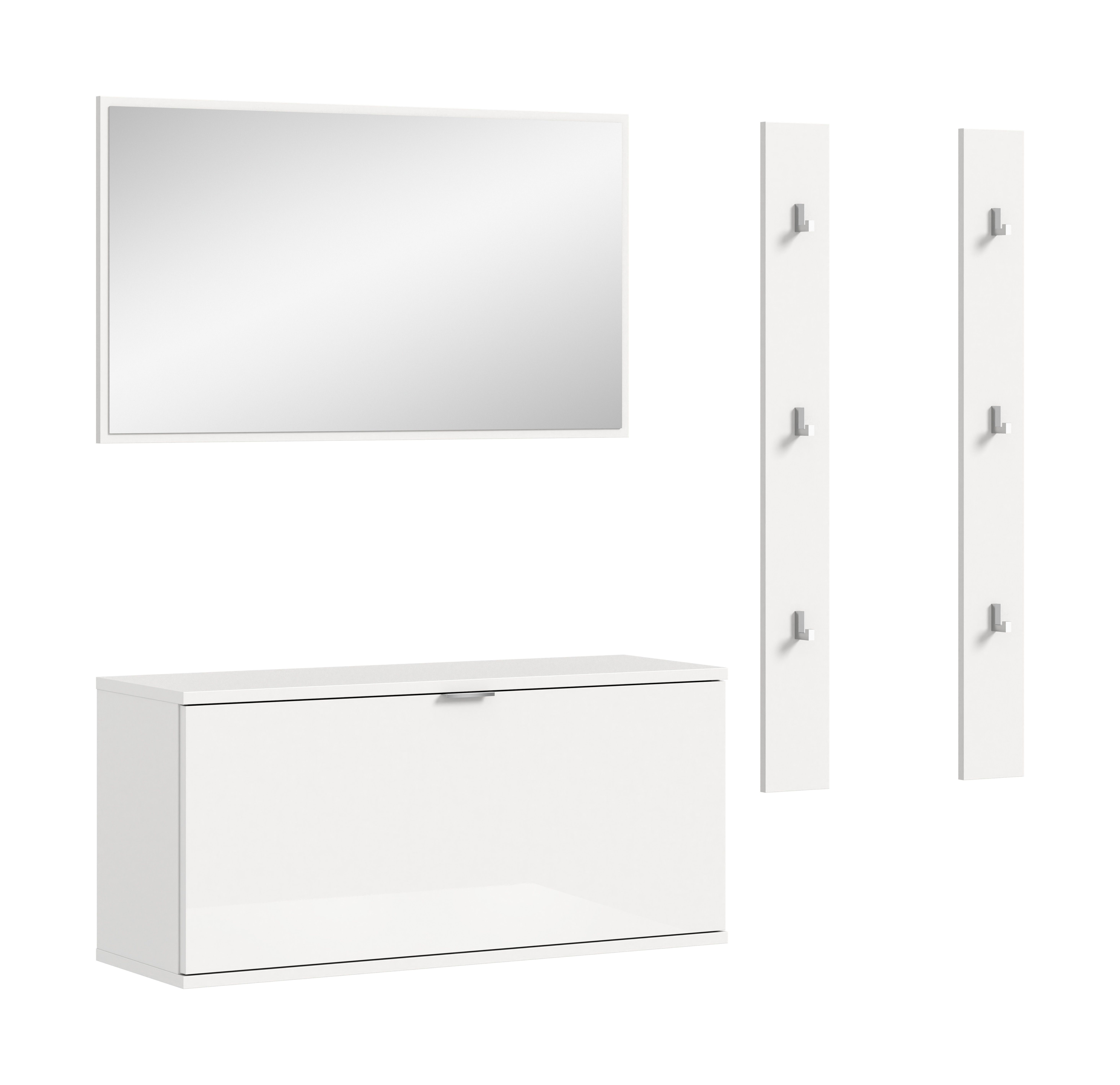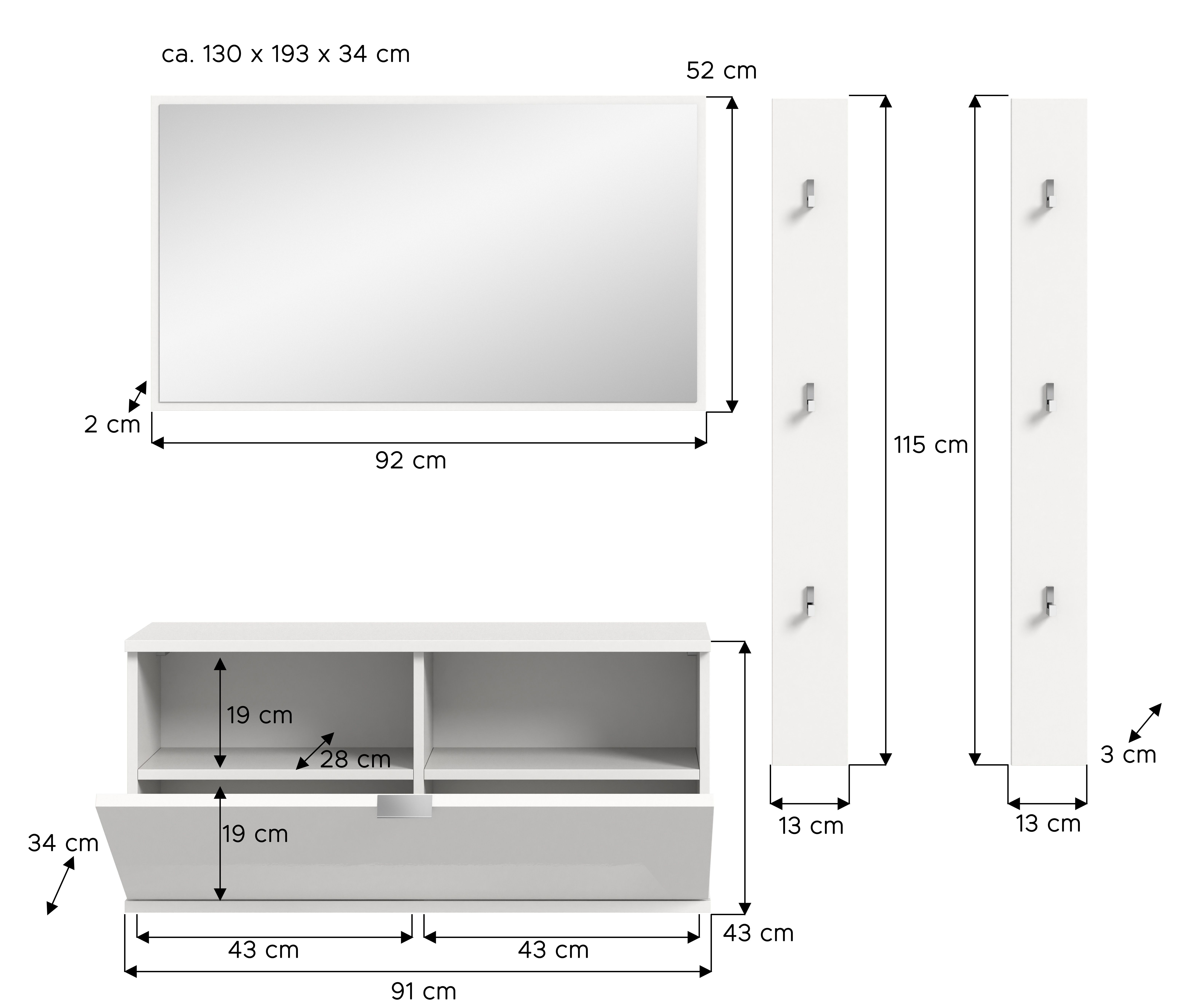 Entdecken Sie unsere elegante Garderobenkombination in strahlendem Weiß hochglanz, ideal für jeden Eingangsbereich! Mit großzügigen Abmessungen von 130 cm Breite, 191 cm Höhe und 37 cm Tiefe bietet dieses Set nicht nur praktische Funktionen, sondern verleiht Ihrem Flur auch einen modernen Look. Die Kombination besteht aus einer stilvollen Sitzbank/Kommoden, die ausreichend Stauraum für Schuhwerk und Accessoires bietet. Der große Spiegel sorgt für eine perfekte Vorbereitung vor dem Verlassen Ihres Zuhauses und lässt den Raum gleichzeitig größer erscheinen. Das praktische Paneel im 2er Set ergänzt die Garderobe sinnvoll, sodass Jacken und Taschen direkt griffbereit sind. Dank der Hochglanz-Oberfläche wird Licht reflektiert, was jeden Raum heller und einladender macht. Diese Garderobenkombination ist nicht nur funktional, sondern auch ein echter Hingucker. Gestalten Sie Ihren Eingangsbereich mit Stil und Funktionalität – ideal für Familien und moderne Wohnkonzepte. Nutzen Sie die Vorteile dieser durchdachten Garderobenkombination und genießen Sie Ordnung und Eleganz in Ihrem Zuhause!