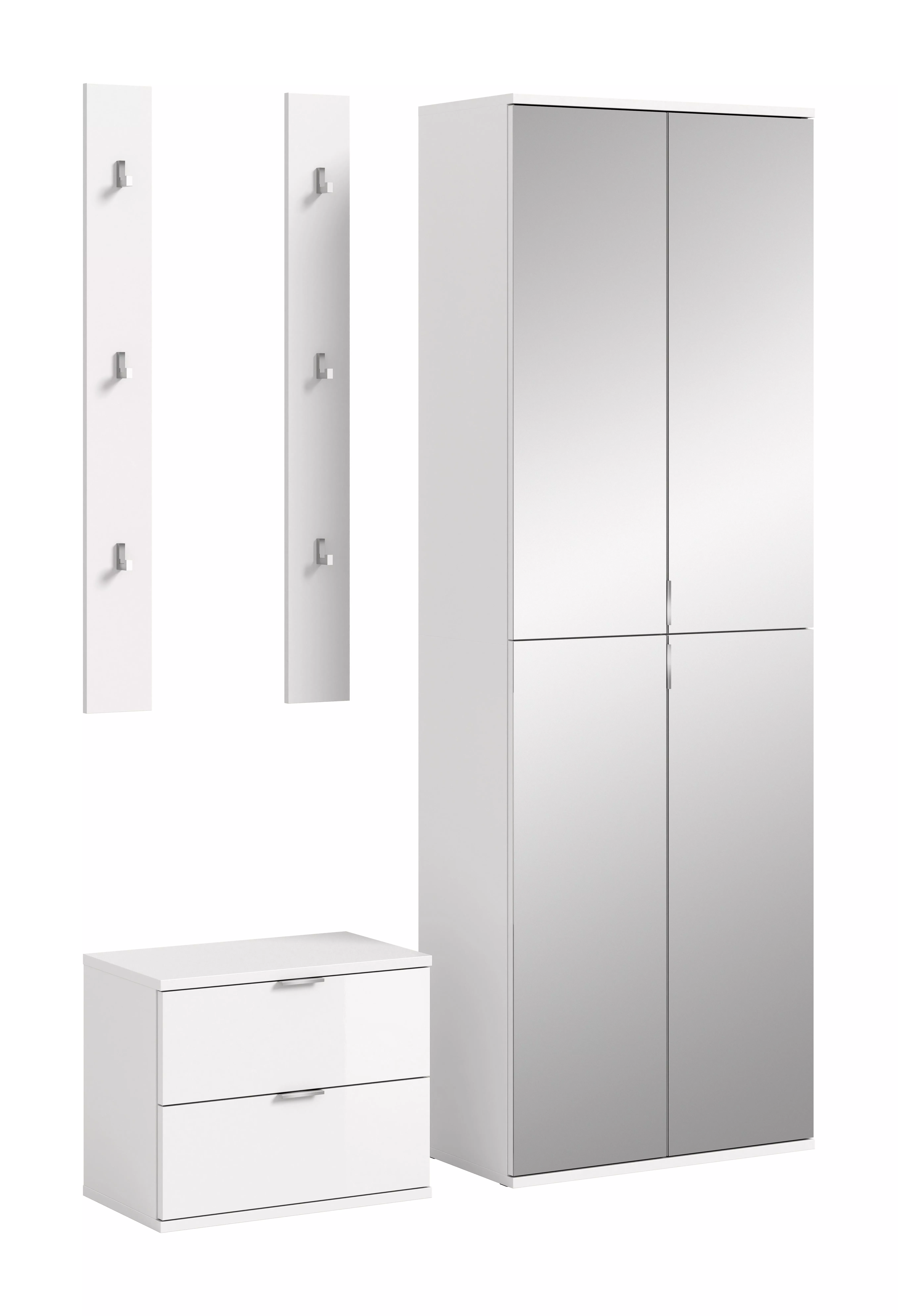 Schaffen Sie Ordnung mit unserer eleganten Garderobenkombination in Weiß Hochglanz, die mit 128 cm Breite, 191 cm Höhe und 37 cm Tiefe ideal für jeden Eingangsbereich ist. Das Set besteht aus einer bequemen Sitzbank/Kommode, einem praktischen 2er Set Paneel und einem stylischen Spiegelschrank. Diese Kombination maximiert den Stauraum und bietet gleichzeitig Platz zum Sitzen, sodass Sie bequem Ihre Schuhe anziehen können. Die glänzende Oberfläche fügt eine moderne Note hinzu und reflektiert das Licht, um eine einladende Atmosphäre zu schaffen.