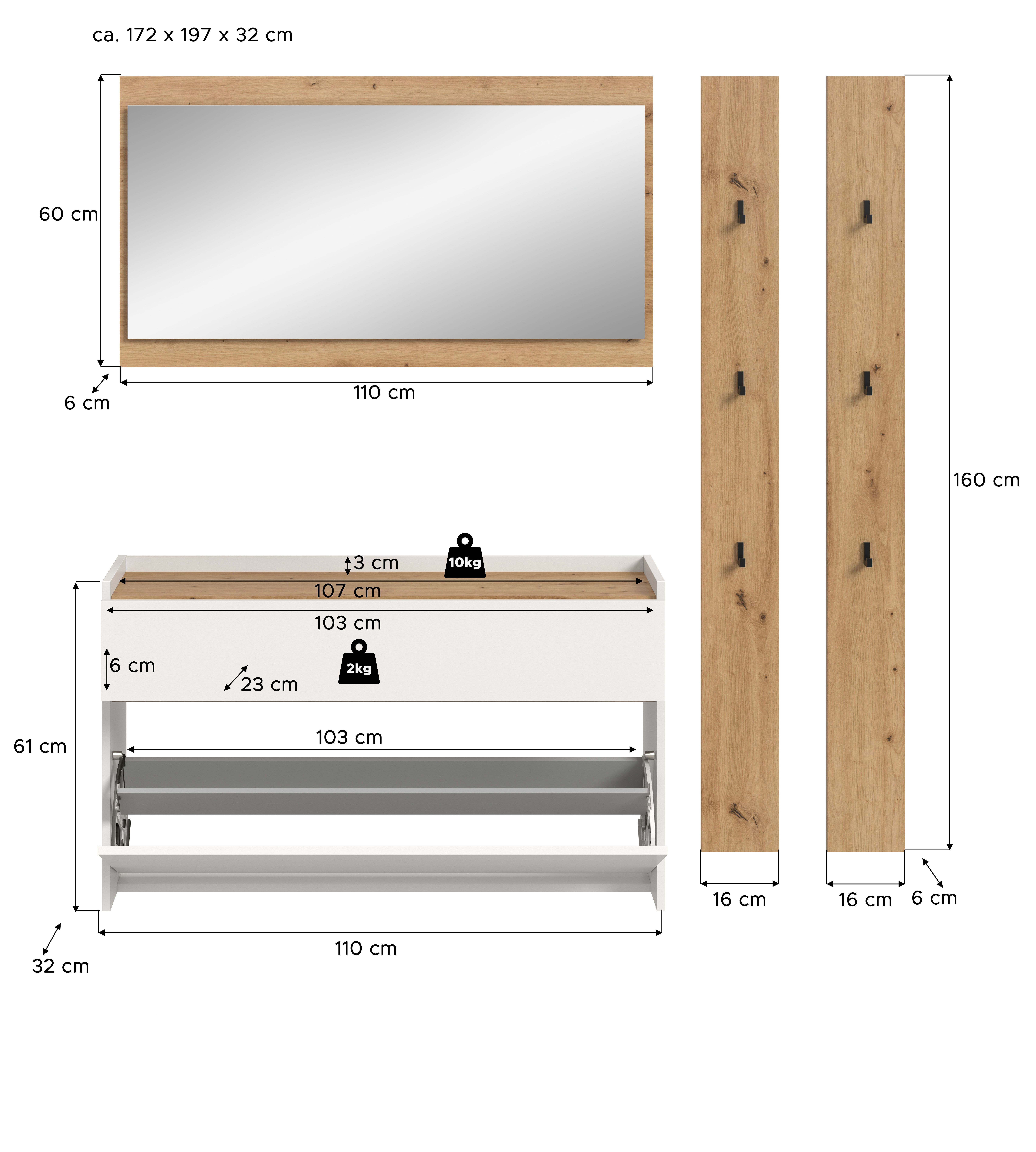 - 4-teiliges Set, bestehend aus: 1x Schuhkommode, 1x Spiegel, 1x Garderobenpaneel, 1x Garderobenpaneel
