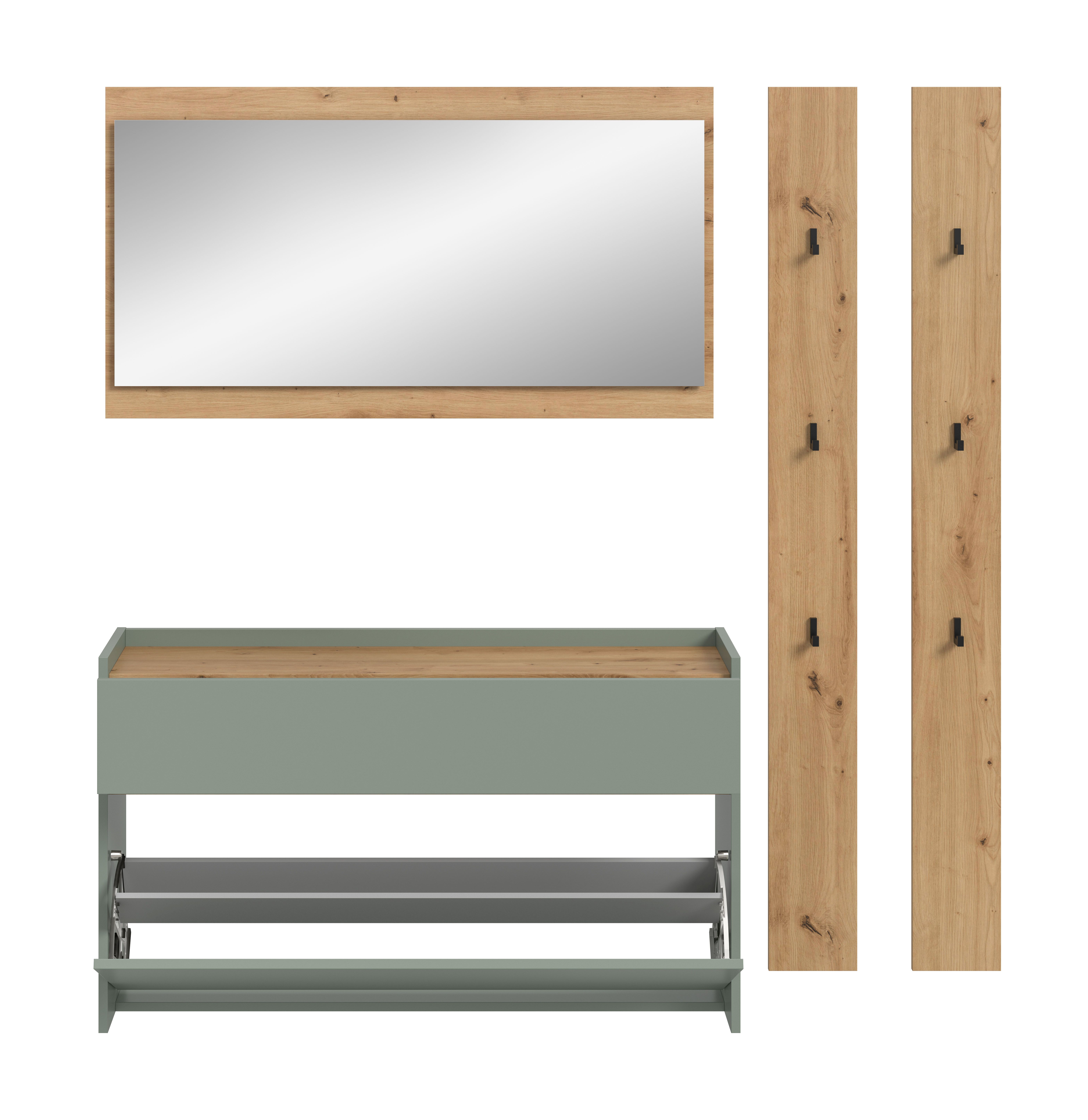 - 4-teiliges Set, bestehend aus: 1x Schuhkommode, 1x Spiegel, 1x Garderobenpaneel, 1x Garderobenpaneel