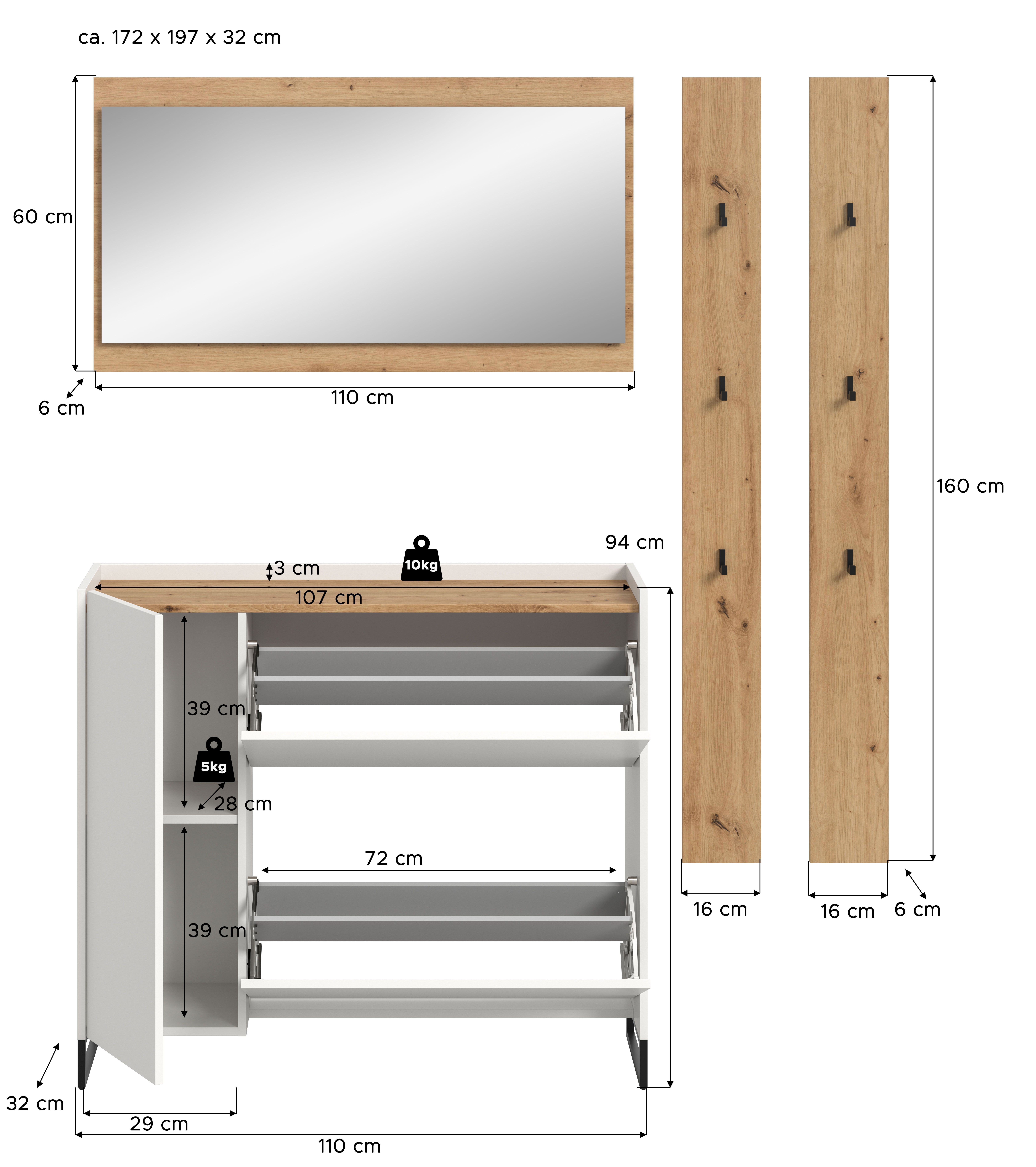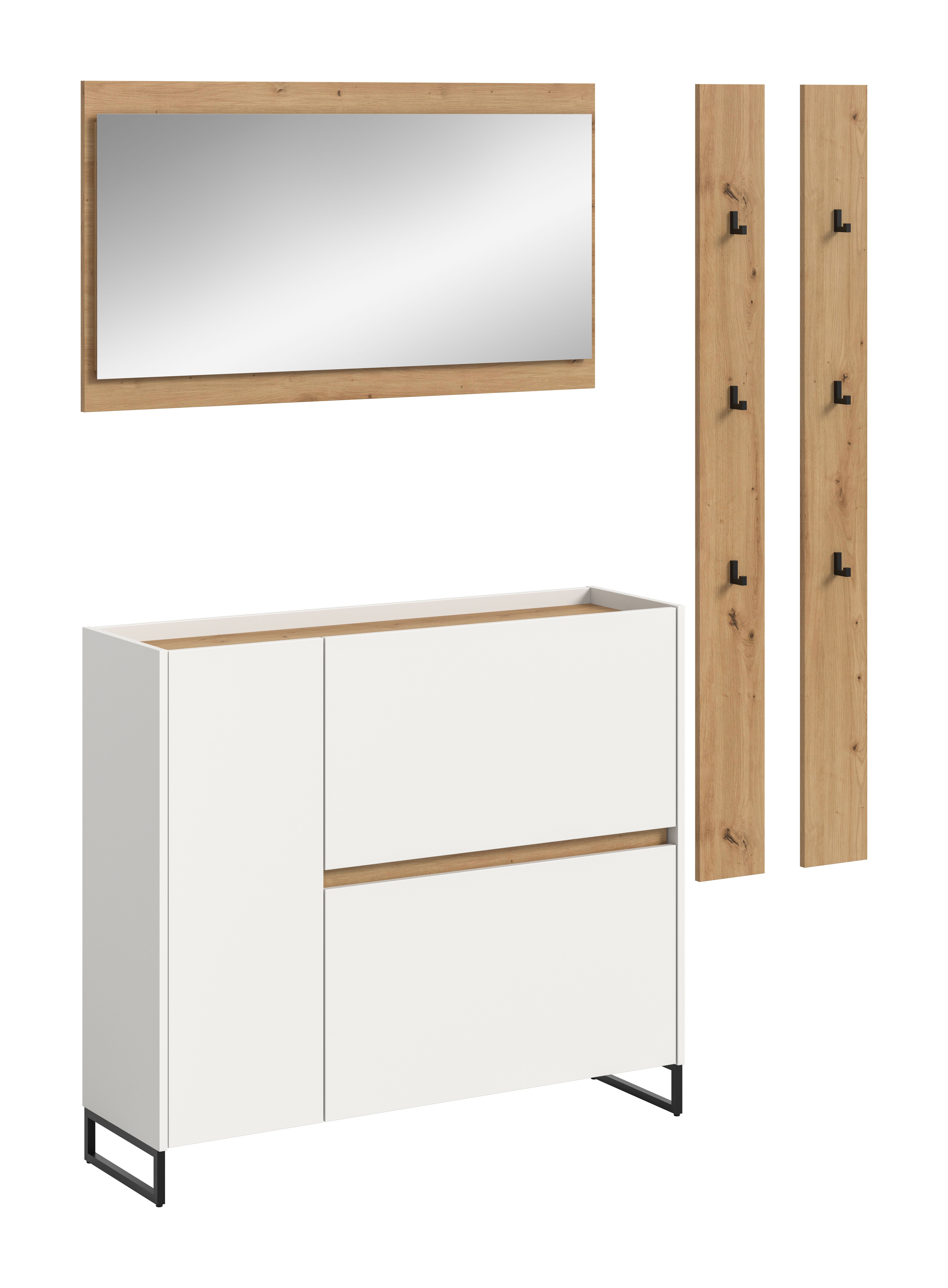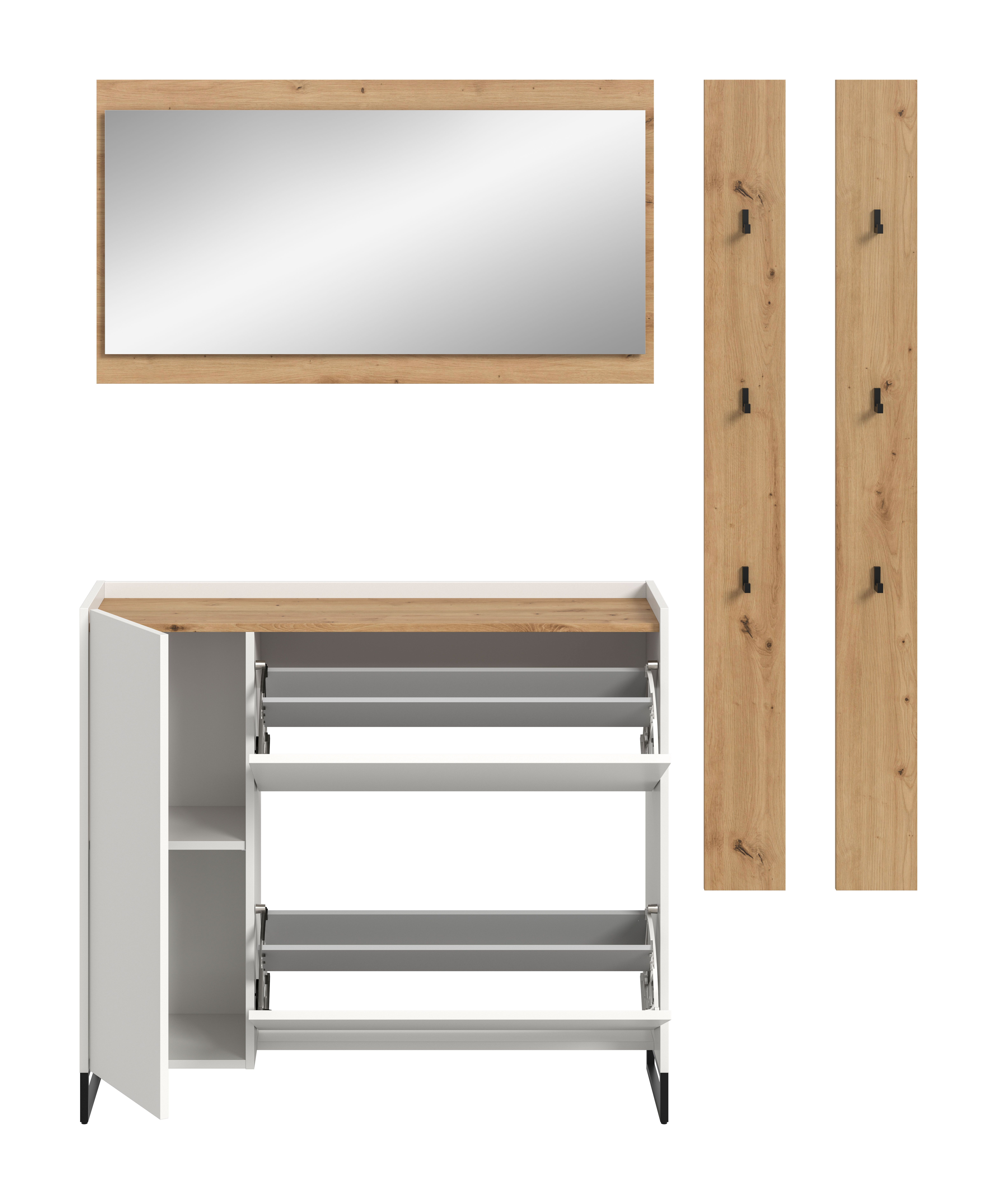 - 4-teiliges Set, bestehend aus: 1x Schuhkommode, 1x Spiegel, 1x Garderobenpaneel, 1x Garderobenpaneel