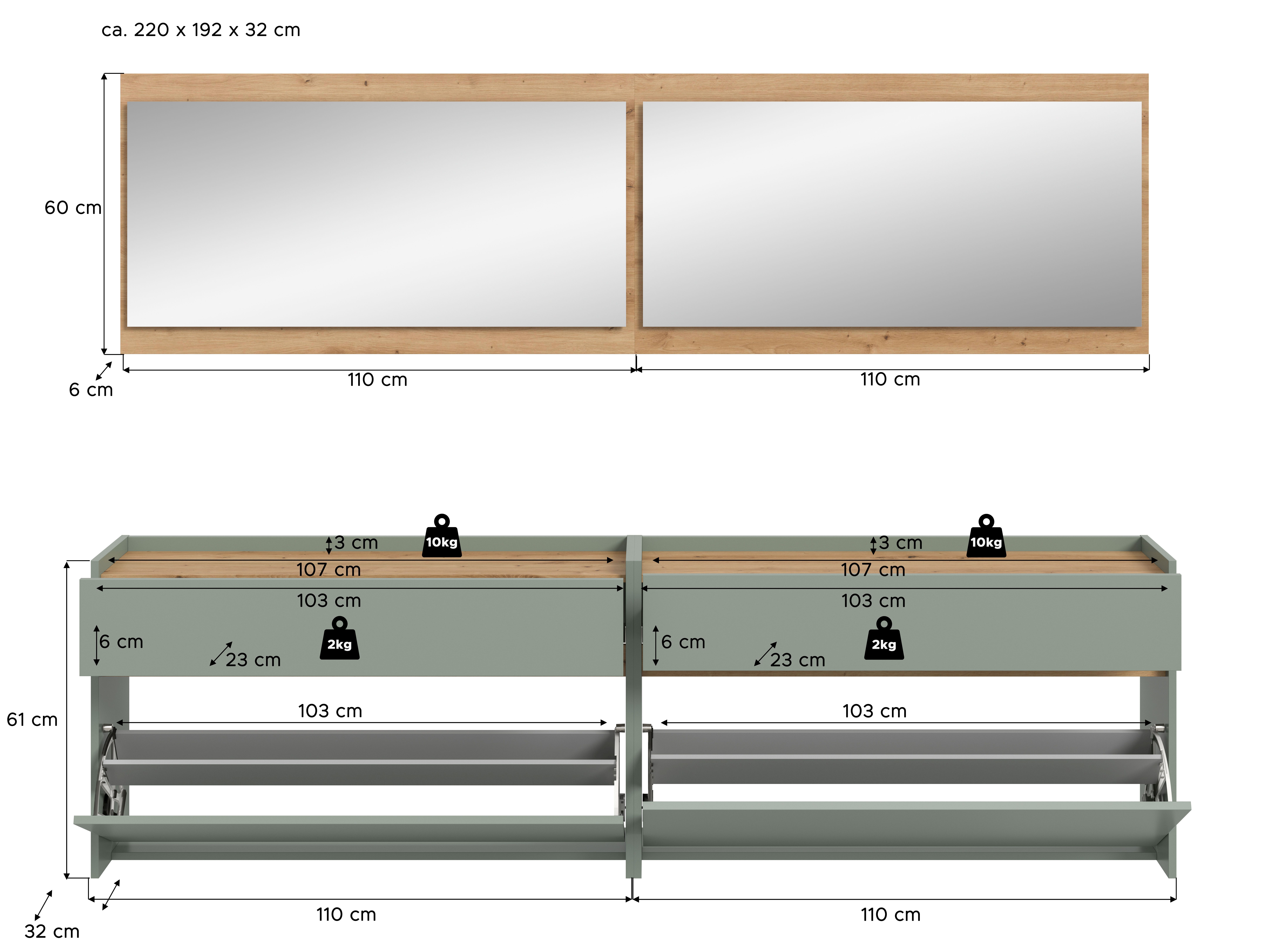 - 4-teiliges Set, bestehend aus: 1x Schuhkommode, 1x Schuhkommode, 1x Spiegel, 1x Spiegel