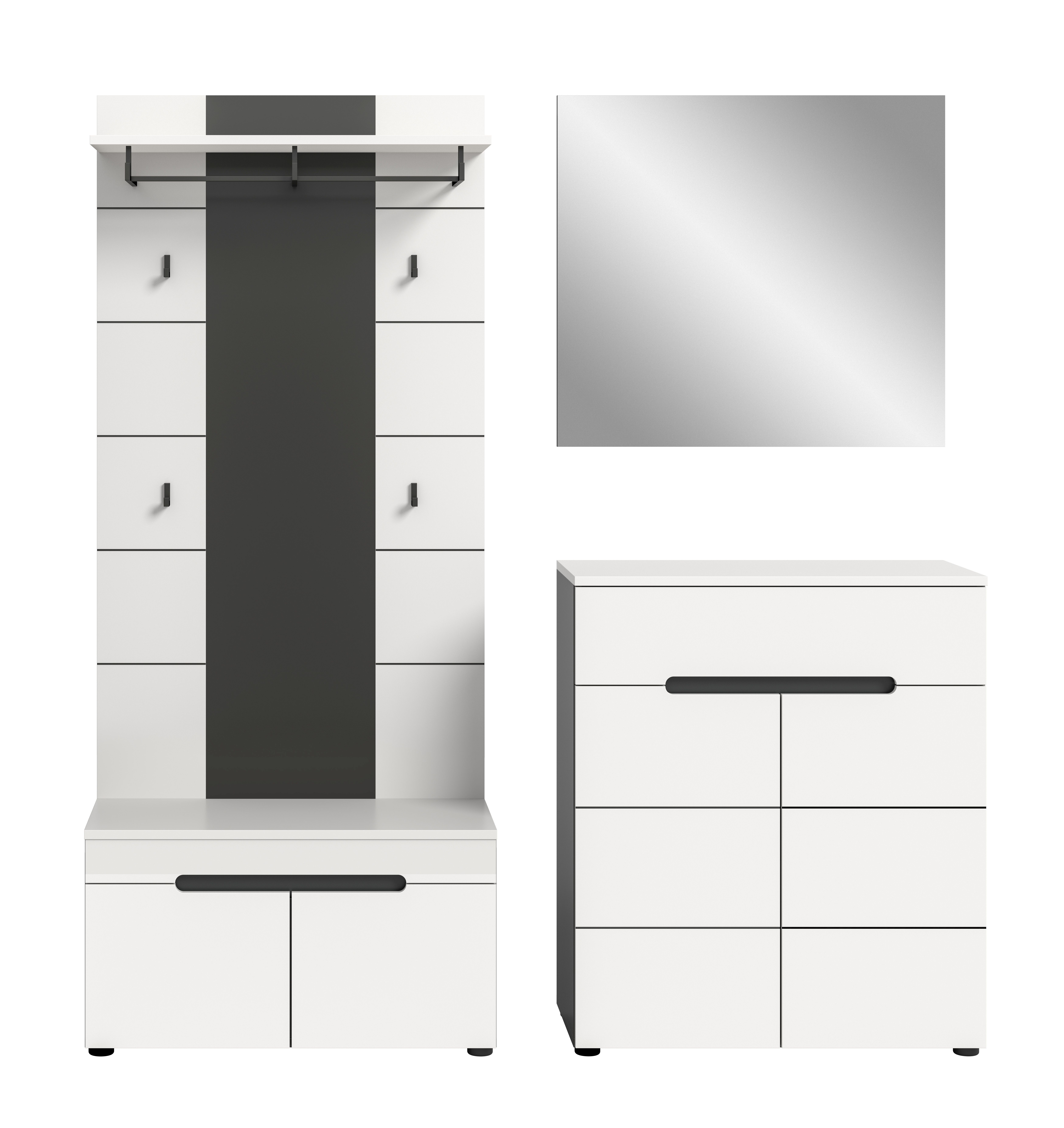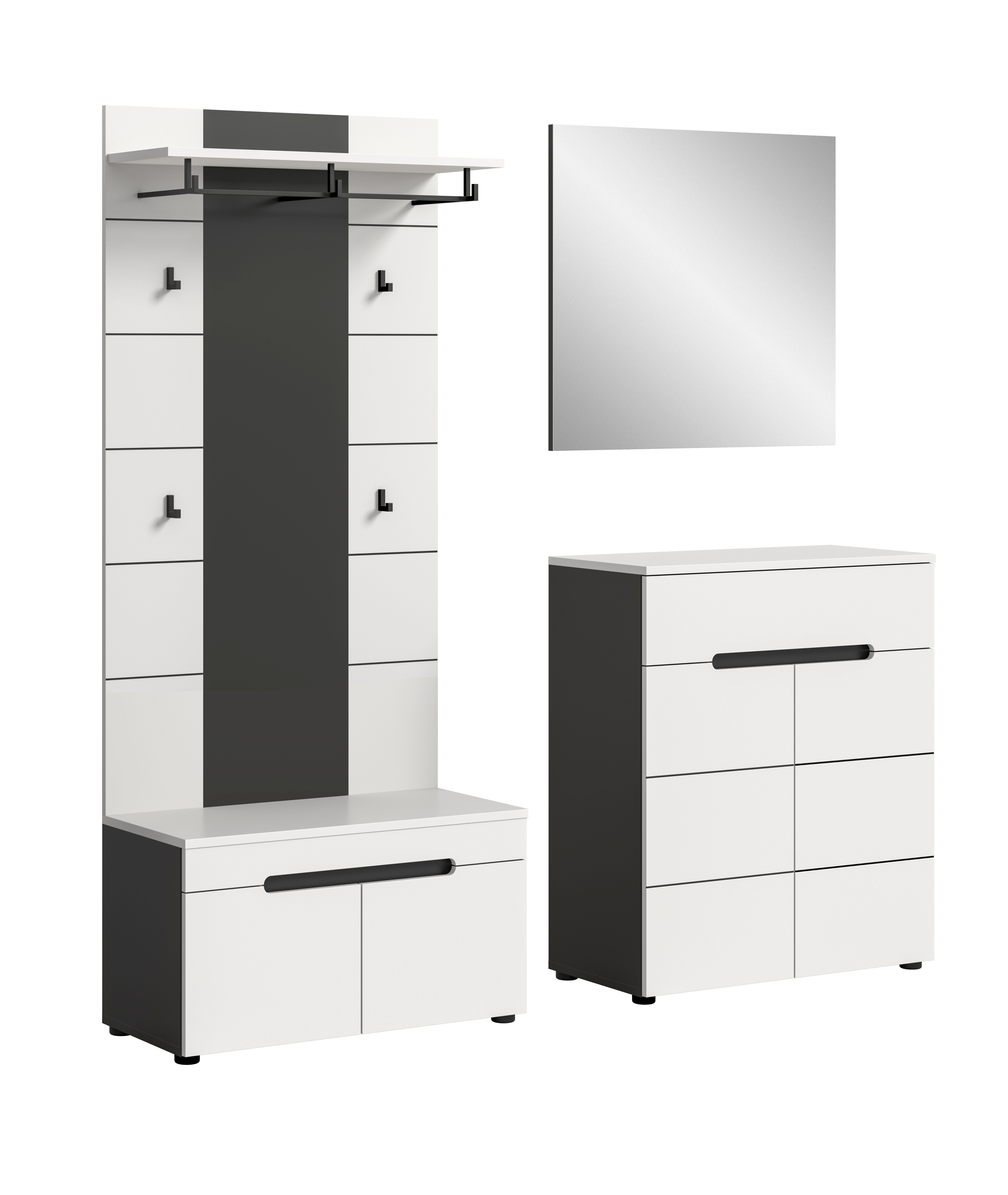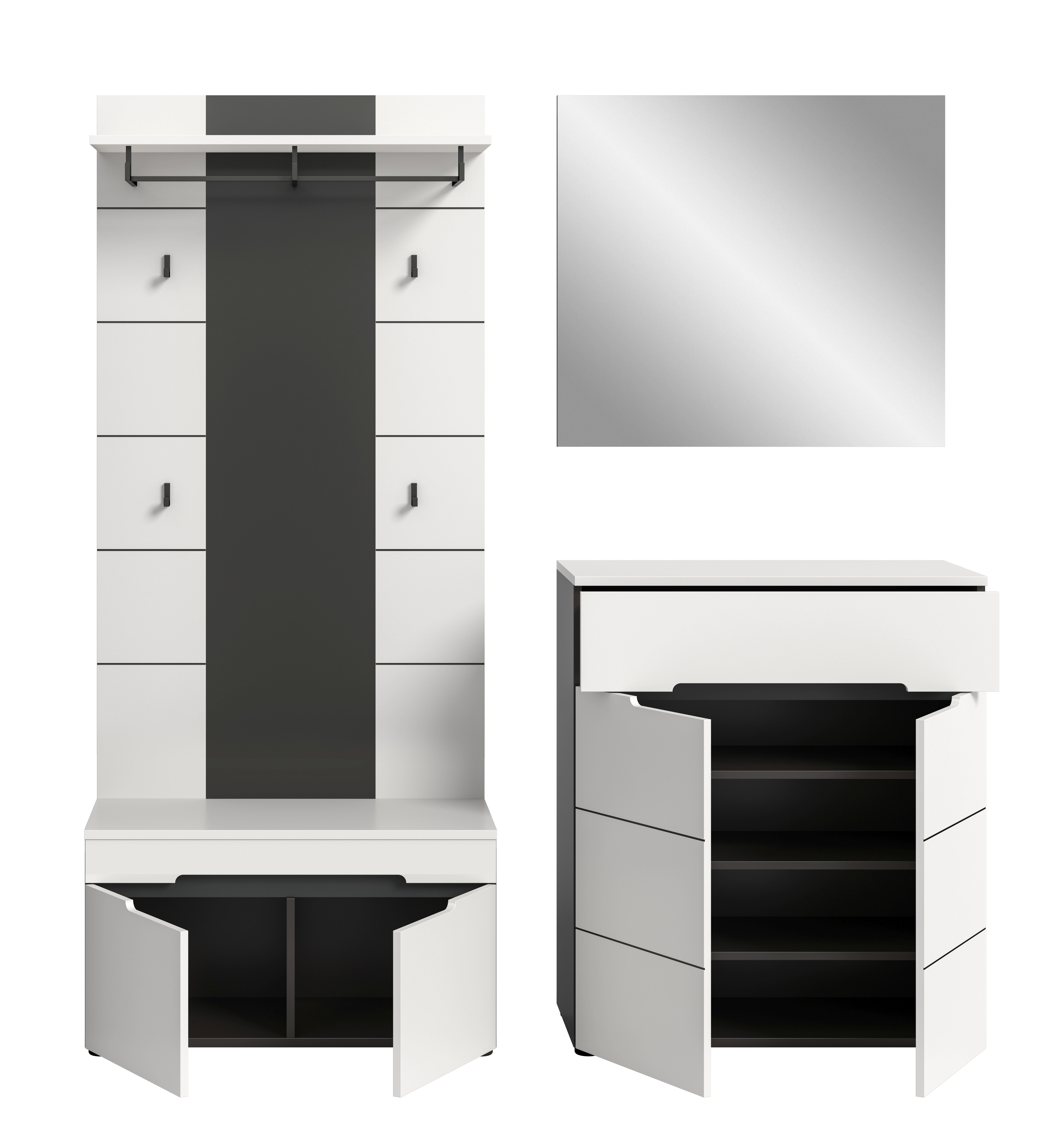 - 4 tlg. Set besteht aus: 1x Sitzbank, 1x Paneel, 1x Schuhkommode, 1x Spiegel