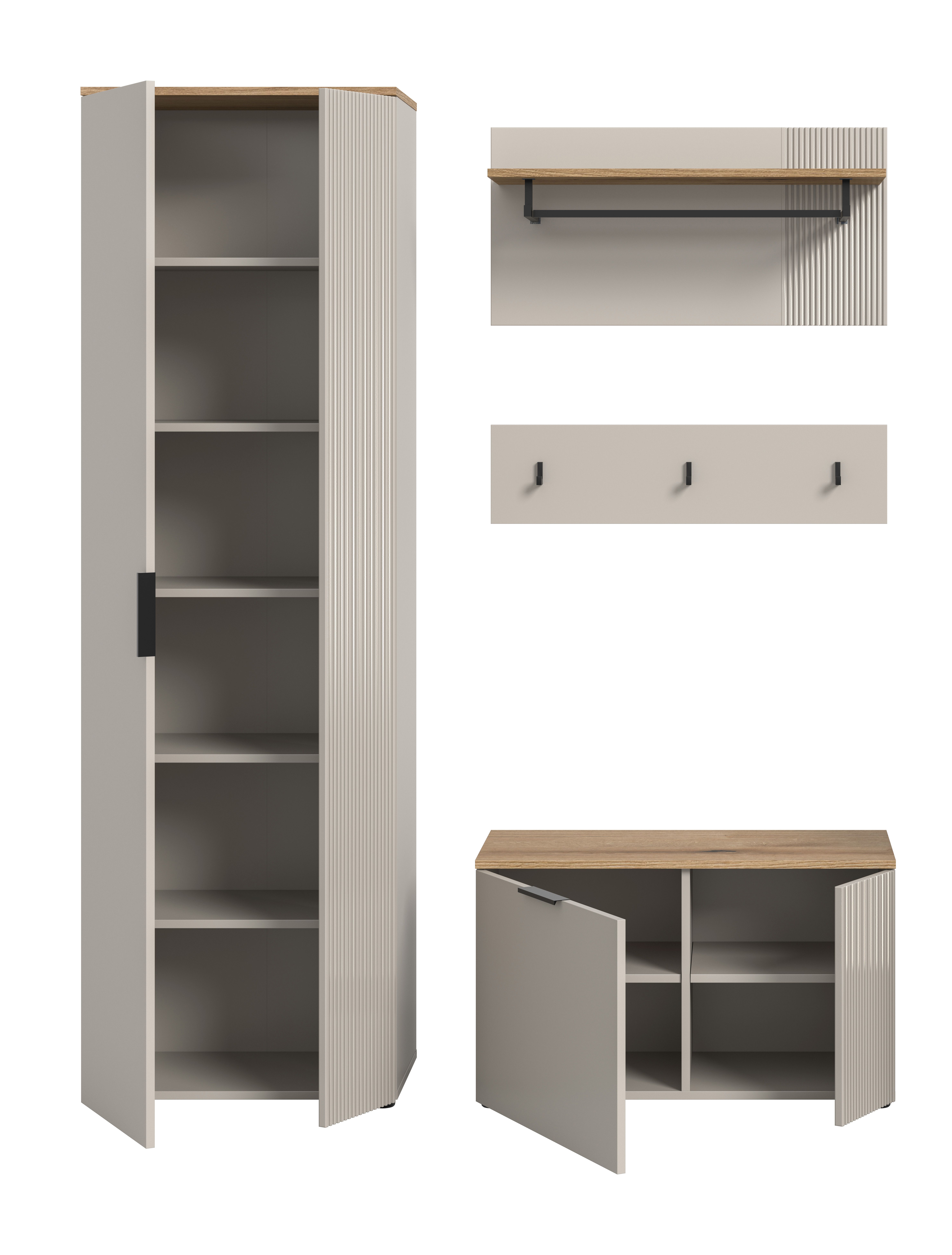 Die Garderobenkombination in eleganter Kaschmir-Nachbildung (B/H/T: 155x190x36 cm) vereint Stil und Funktionalität. Das vierteilige Set besteht aus einem geräumigen Garderobenschrank, einer komfortablen Sitzbank sowie zwei praktischen Paneelen mit moderner Längstfräsung. Ideal für einen aufgeräumten Eingangsbereich – robust, hochwertig und einladend zugleich.